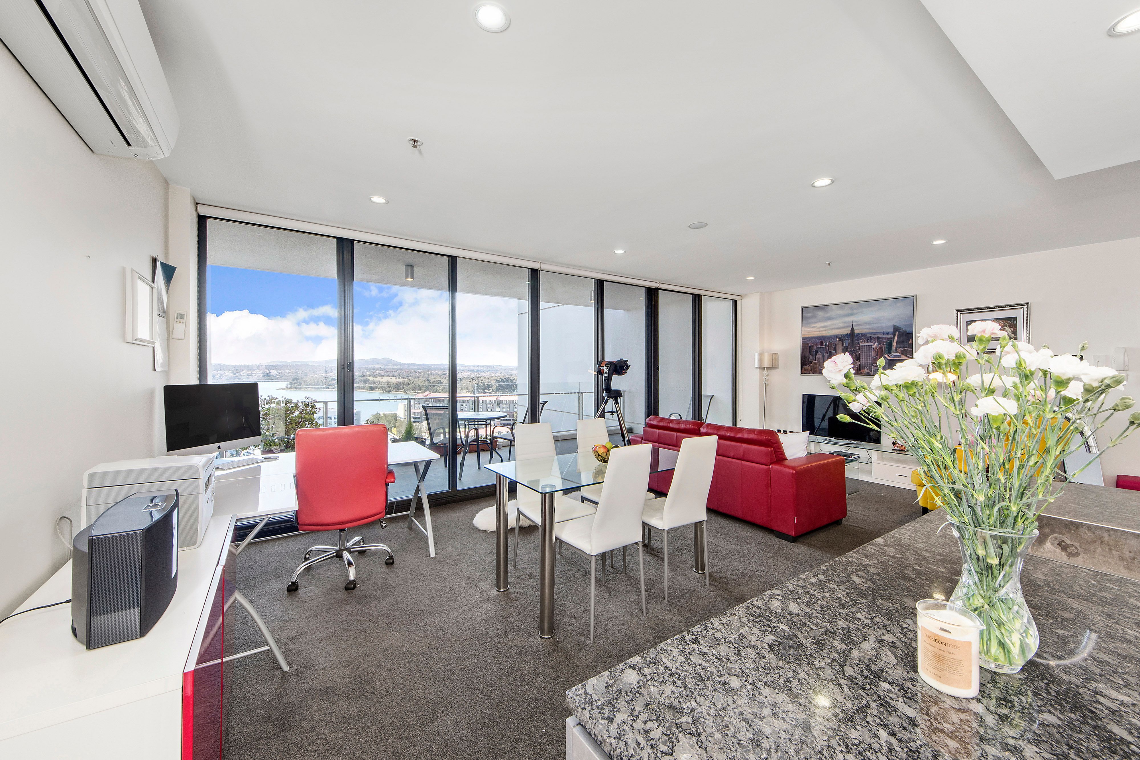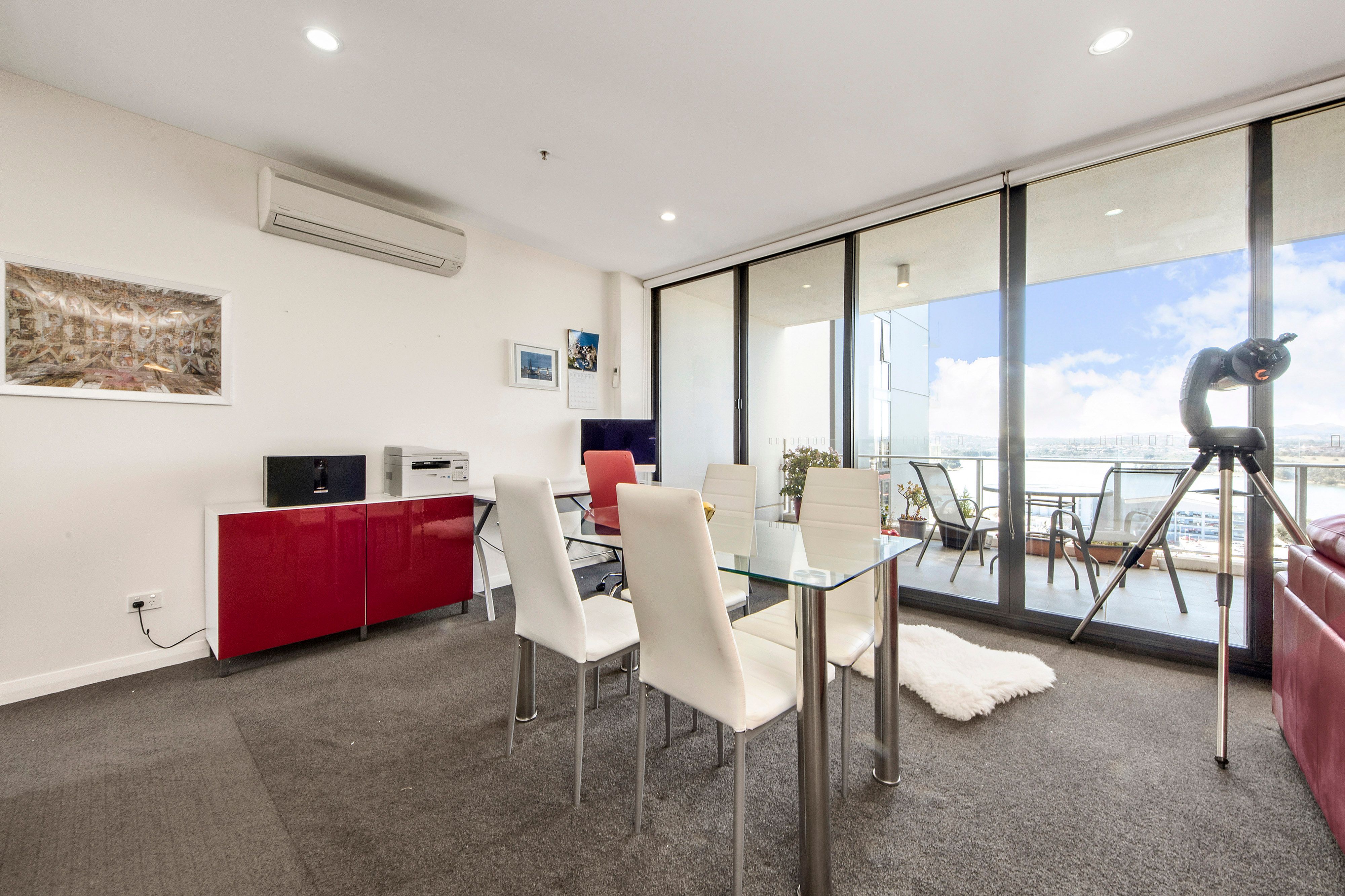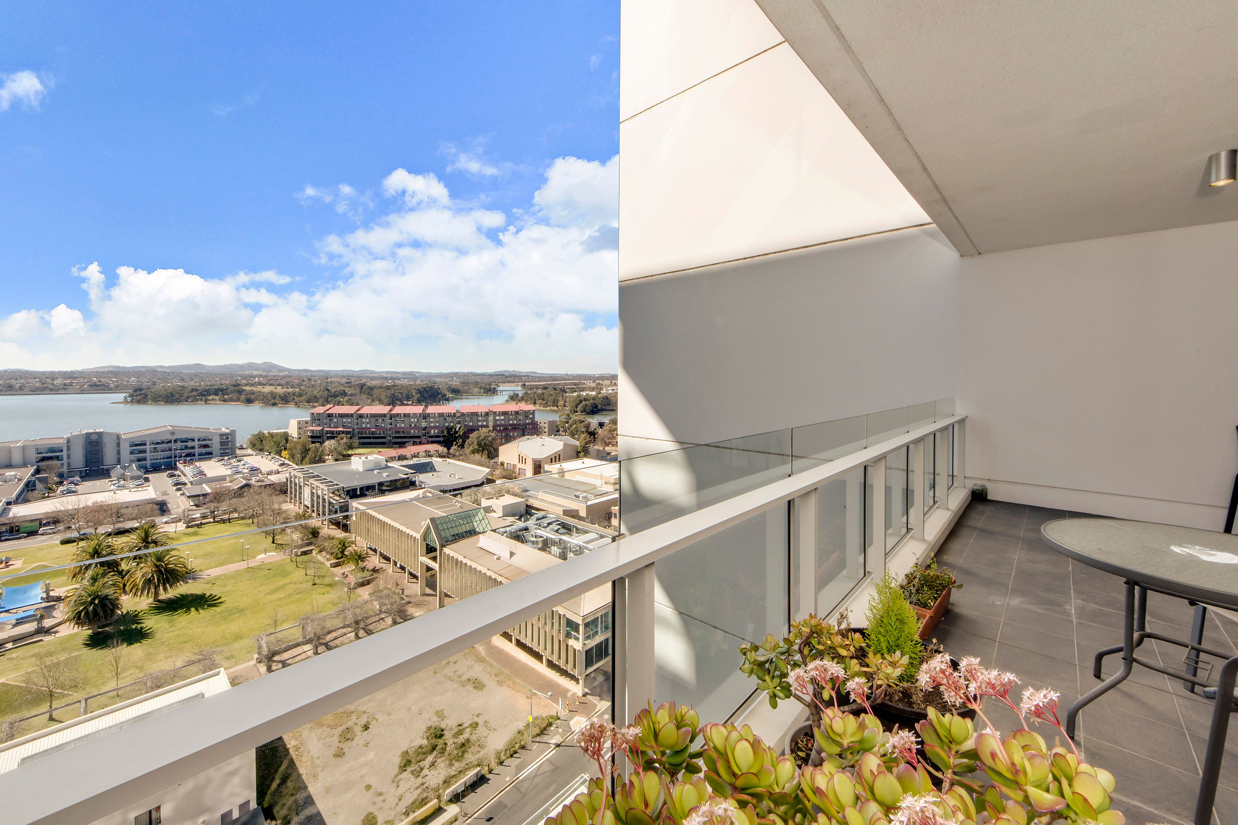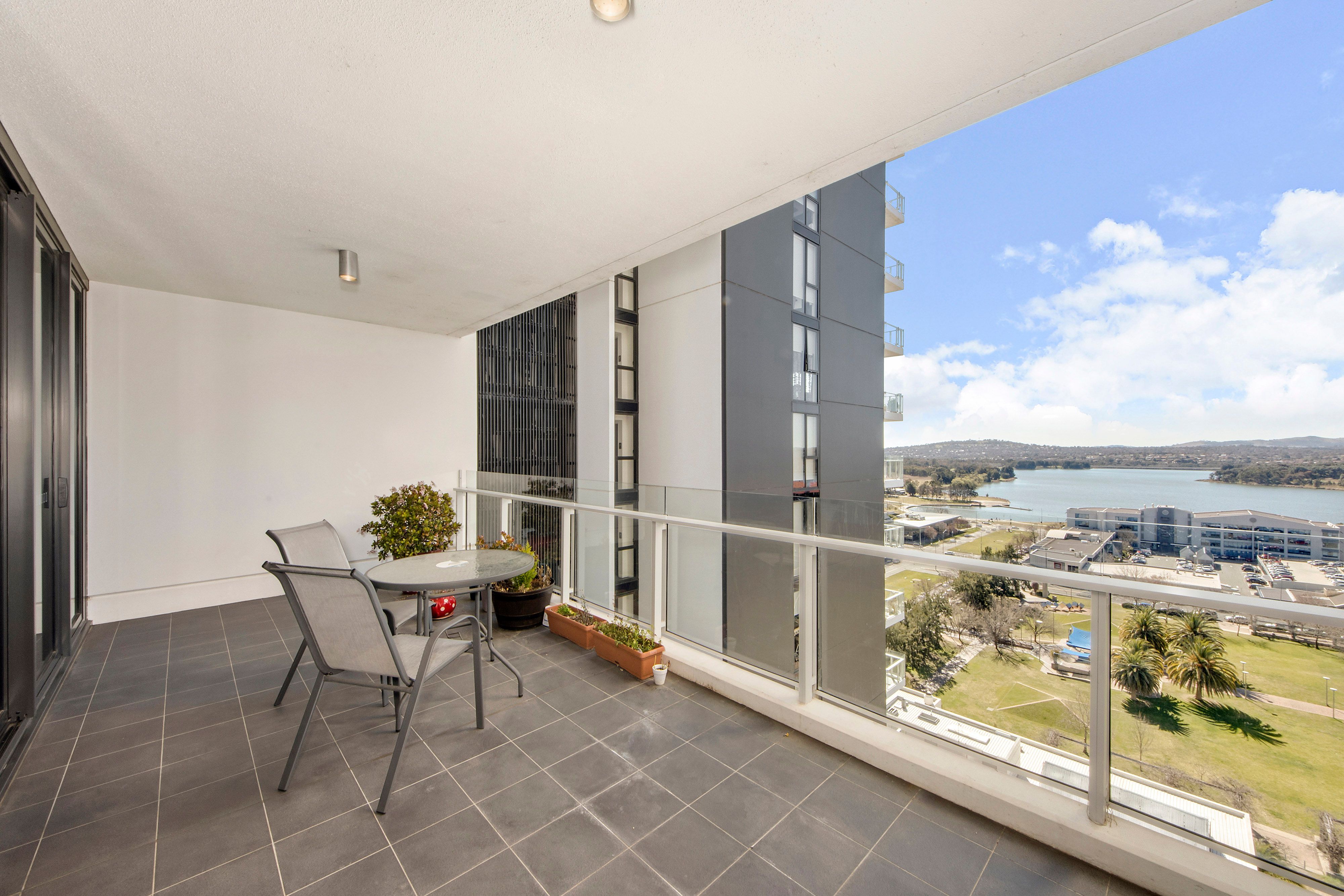Apartment: * 15th floor apartment with stunning views over Lake Ginninderra * Two bedrooms and two modern bathrooms * An abundance of storage space throughout * Spacious open plan living with access to balcony with uninterrupted water views * Well designed stylish kitchen with stone bench tops * Two large balconies - north and south facing * Master bedroom with modern ensuite and walk-through robe * High quality fittings and fixtures * Reverse-cycle air conditioning * Secure intercom entry * Two car spaces with storage area under the complex