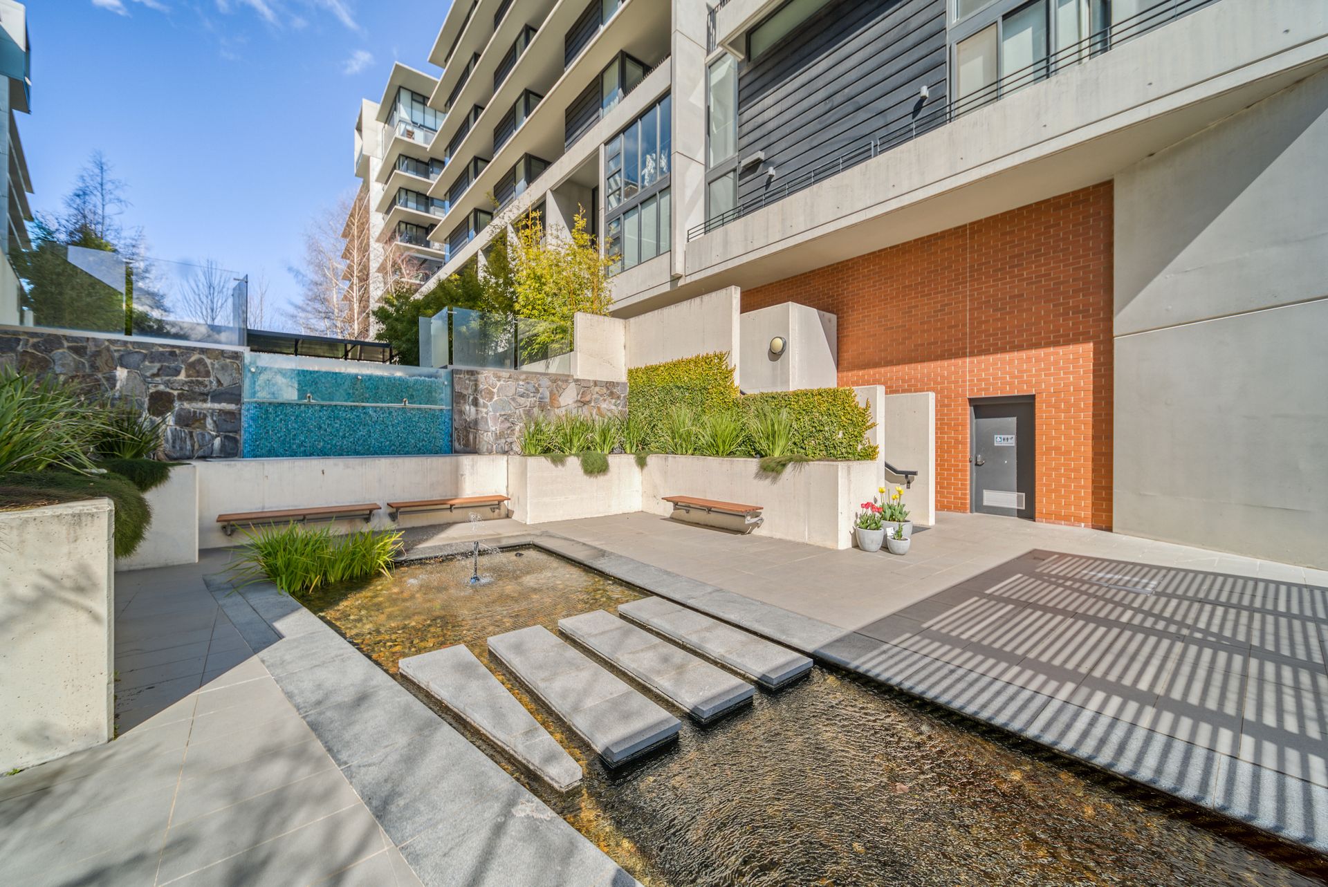 Residents of Linq enjoy resort-style amenities such as a heated pool, gym, BBQ area, a water feature, and a shared vegetable garden.