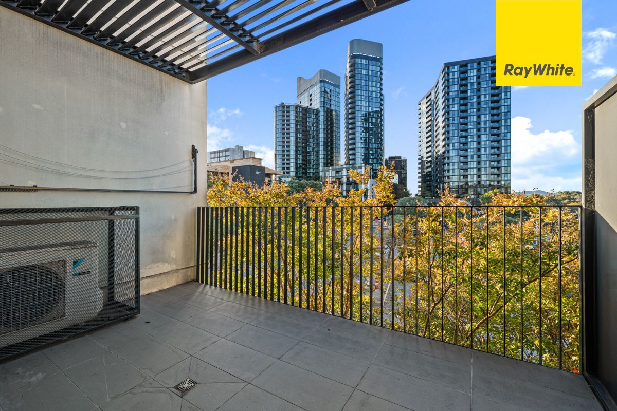 Enviably positioned on level 2, the apartment receives abundant natural light and features floor-to-ceiling double-glazed windows in the living space that frame the treetop outlook. The contemporary kitchen has a sleek, modern look highlighted by navy splashback and blonde feature cabinetry. Well appointed with a dishwasher for easy clean up and ample bench and storage space, ensuring food preparation will be a pleasure.