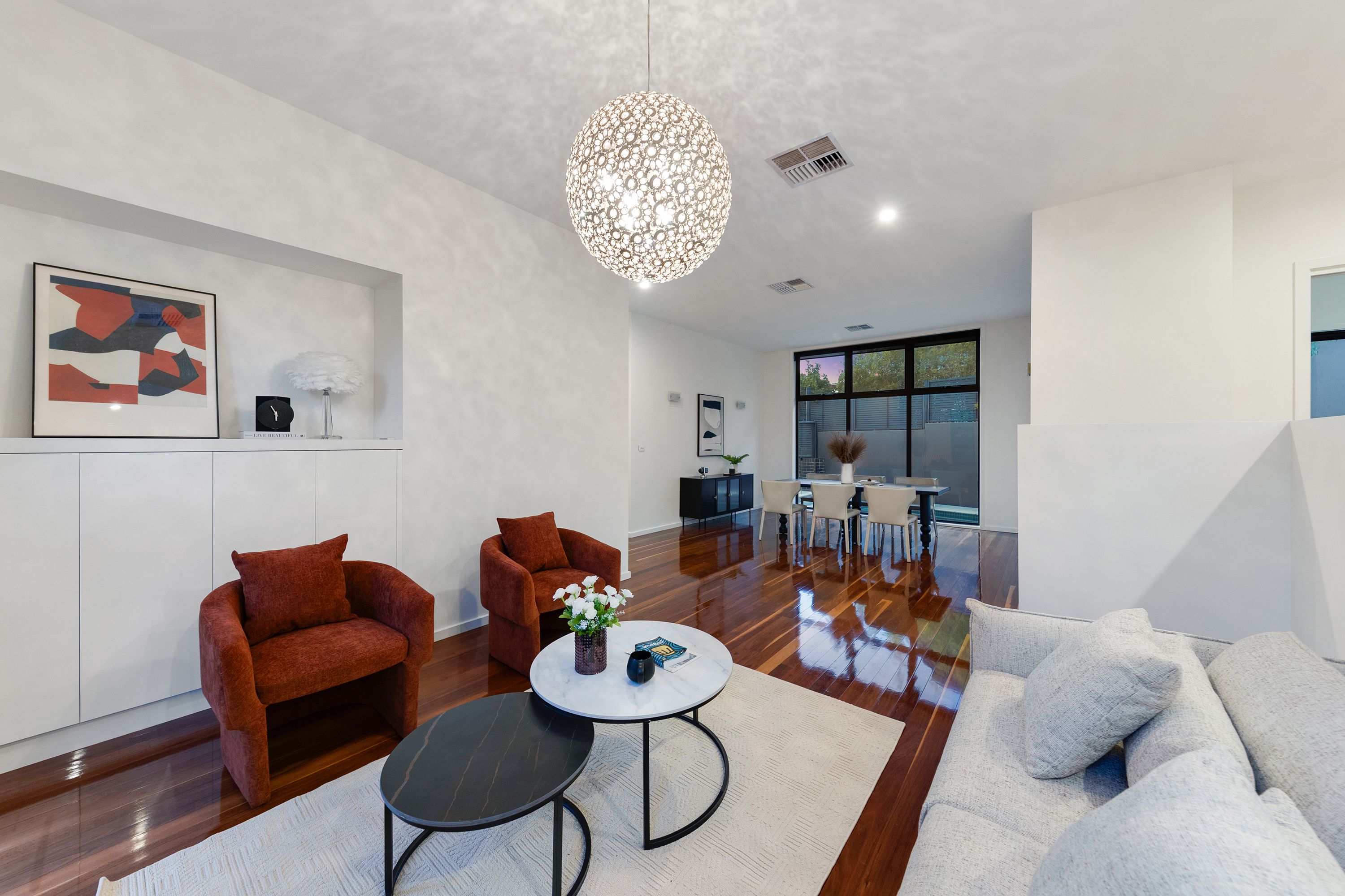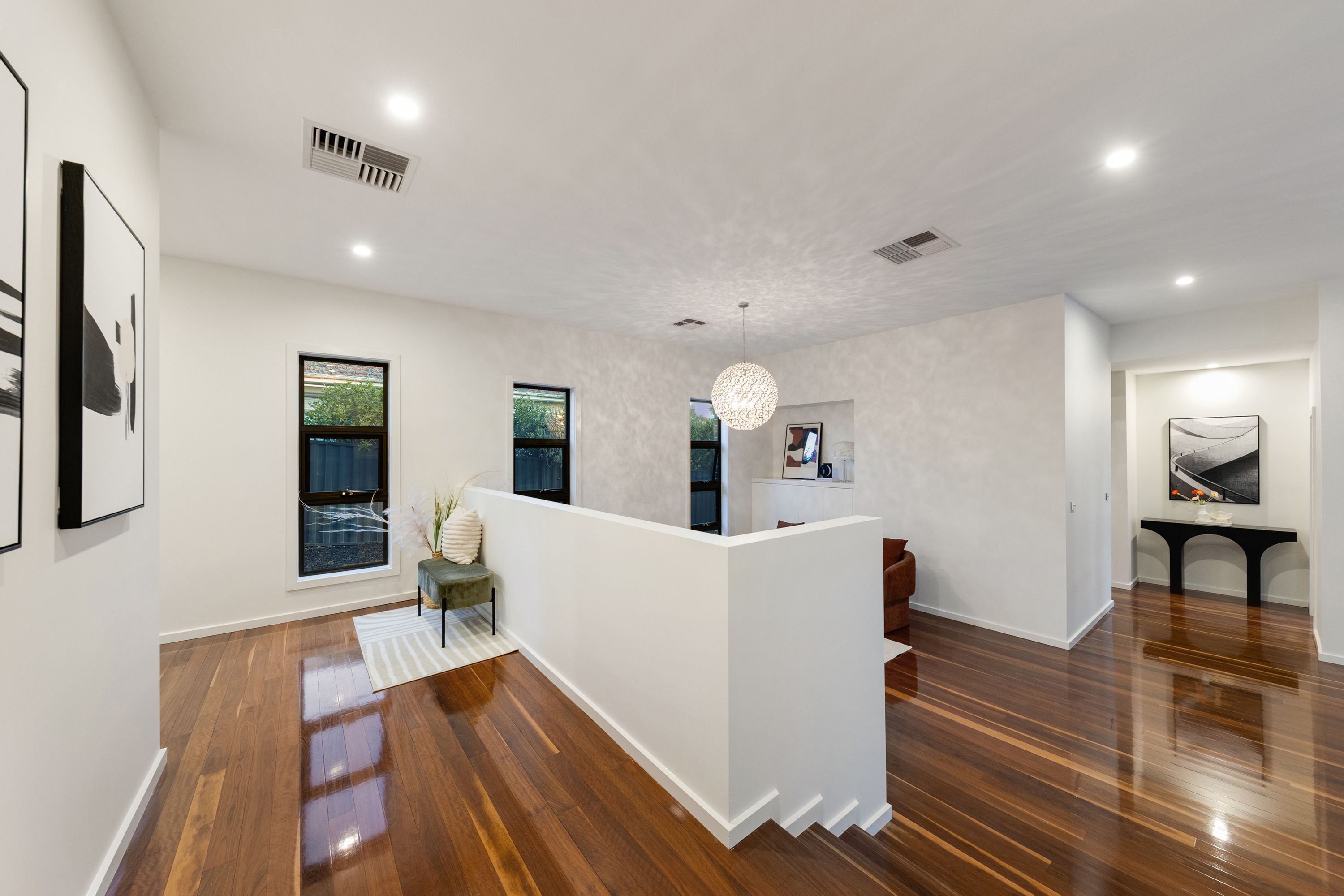 Entering into the home you straight away notice the Australian Jarrah hardwood timber floors, statement lighting and the expansive formal living and dining area. This area is complemented by a full height window overlooking the tiled concrete swimming pool. The formal entertaining area is serviced by a private spacious powder room perfect for guests when entertaining.