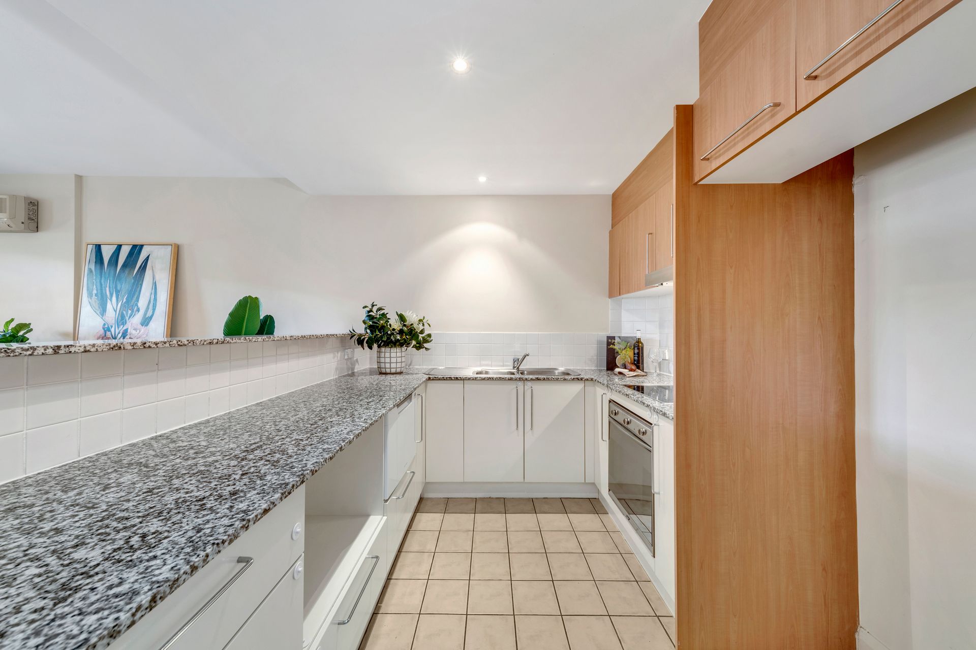 Well equipped kitchen with stone benchtops and stainless steel appliances