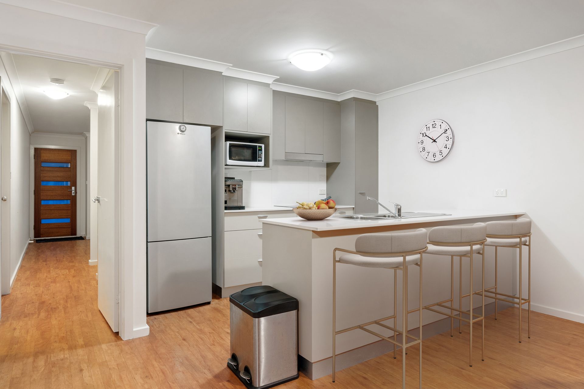 The kitchen will delight any home cook, featuring stone benchtops, ample storage, electric cooking, and a dishwasher to make clean-up a breeze.
