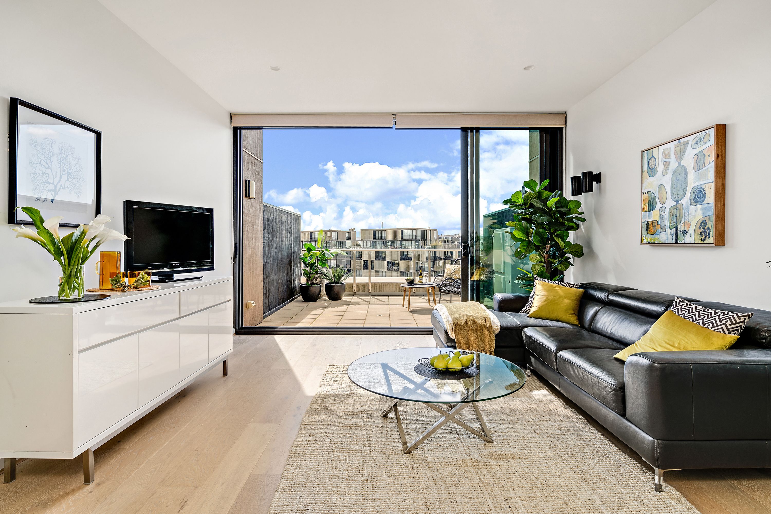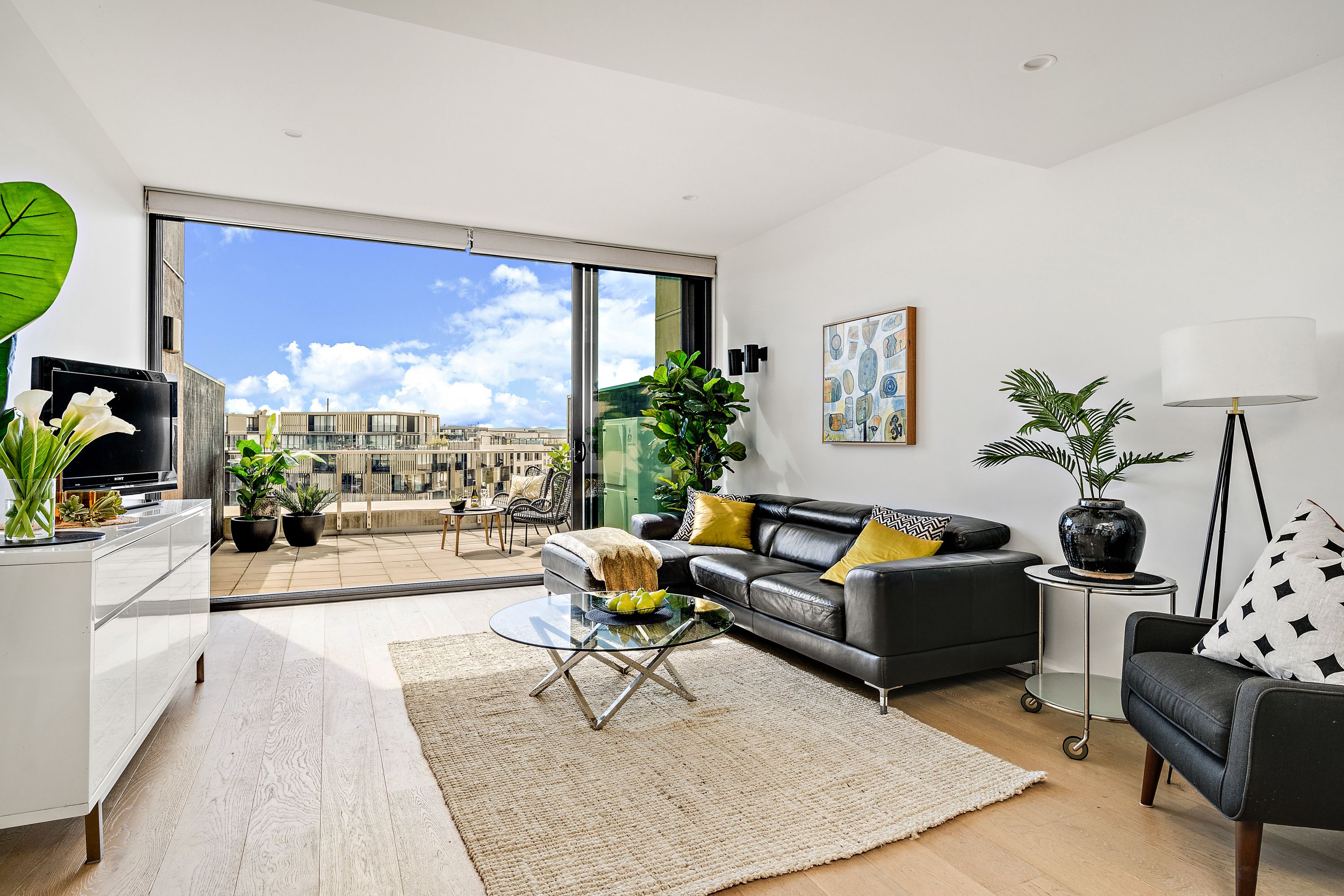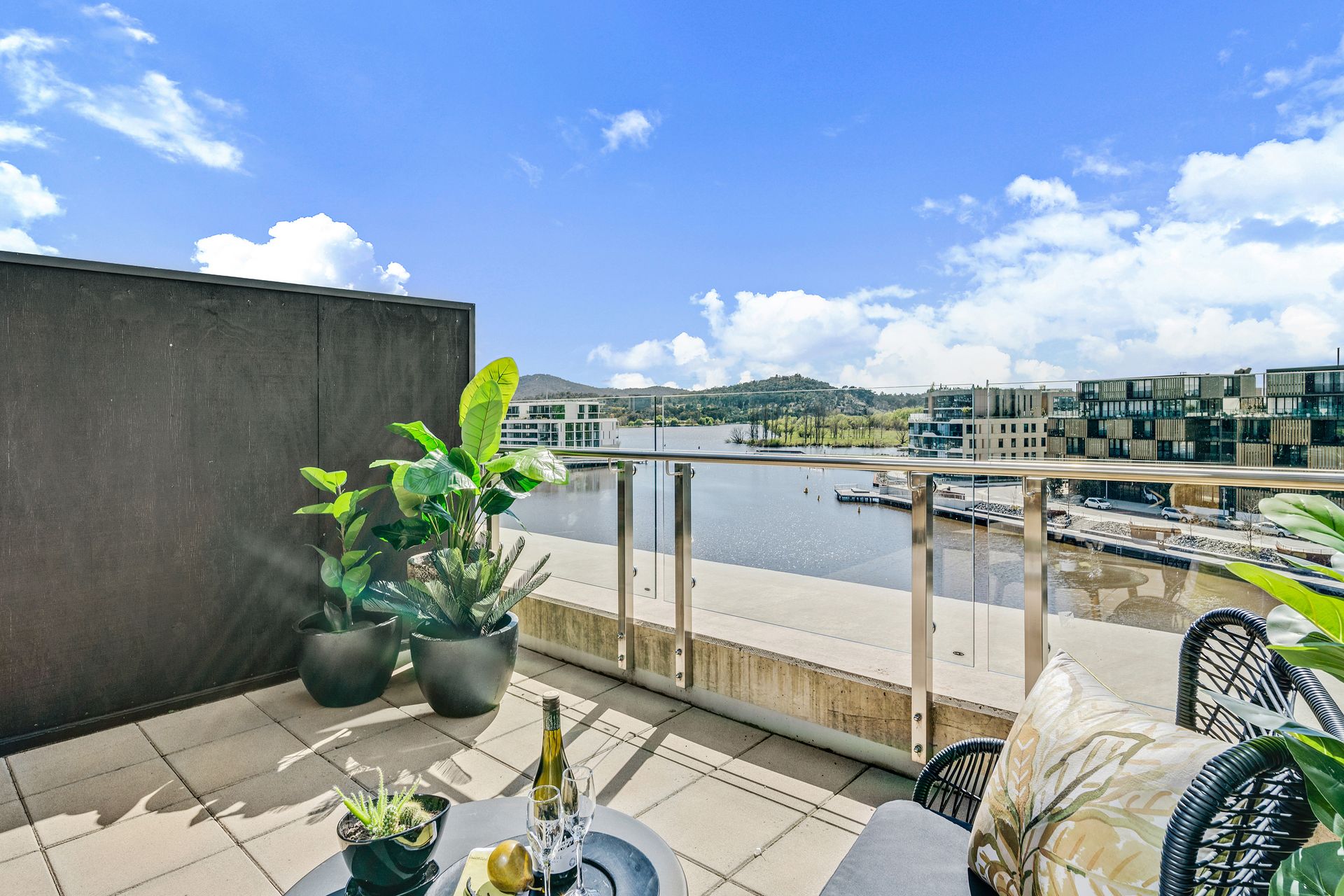 Instantly appealing and irresistible with its inclusions, this iconic penthouse style 'Sky Home' is one of just a handful available in Kingston Foreshore's Element complex. Affording breathtaking, never to be built out views, this two storey, two bedroom design on the top floor ensures ultimate privacy and refined liveability. From the entry, engineered Oak timber flooring carries you through the light filled living space to the generous alfresco. A sleek galley style kitchen with integrated dishwasher and fridge freezer is complemented with stone benches and Miele appliances. Full length sliding double glazed glass doors provide a wealth of natural light and guarantee the stunning view will always remain a prominent feature.