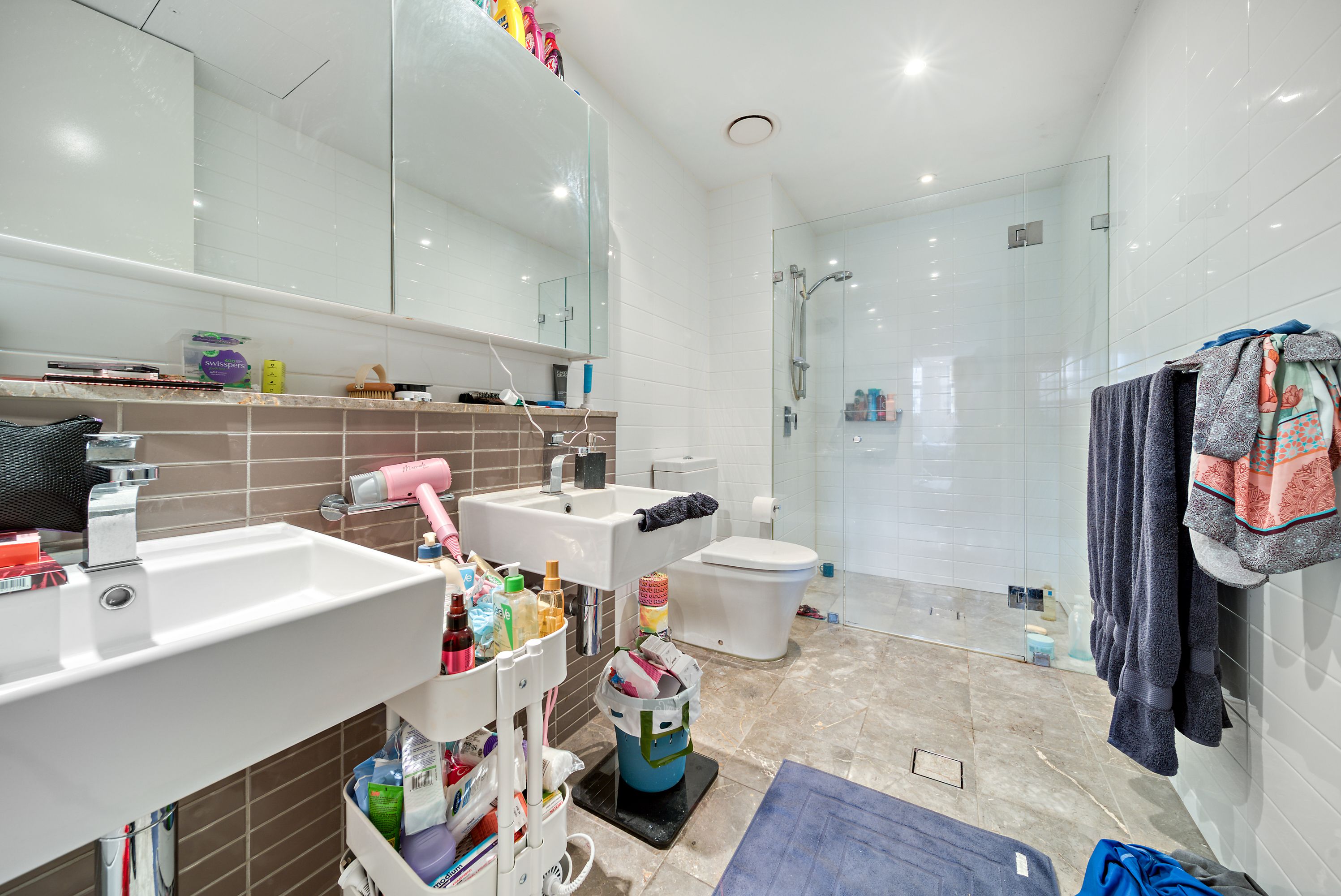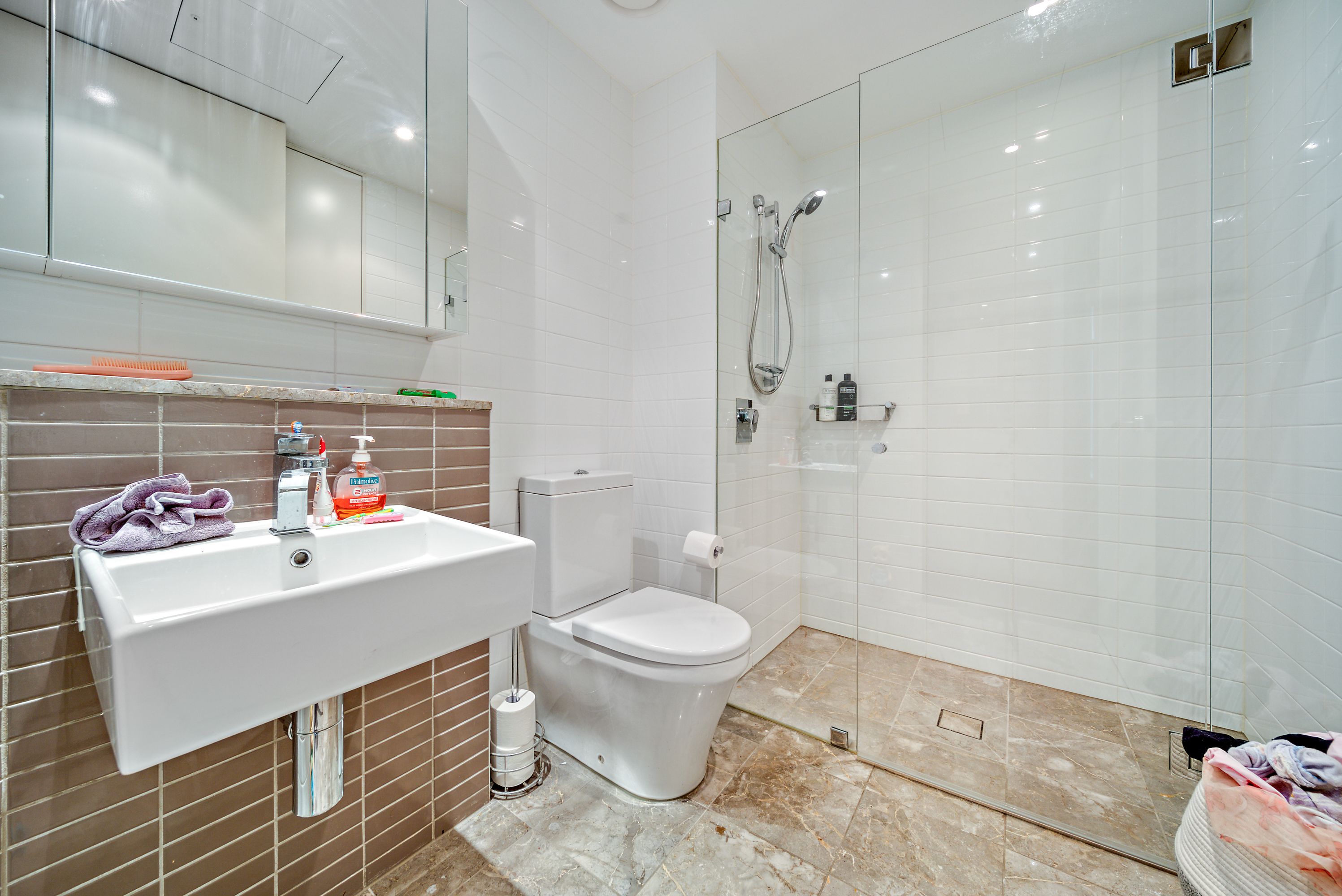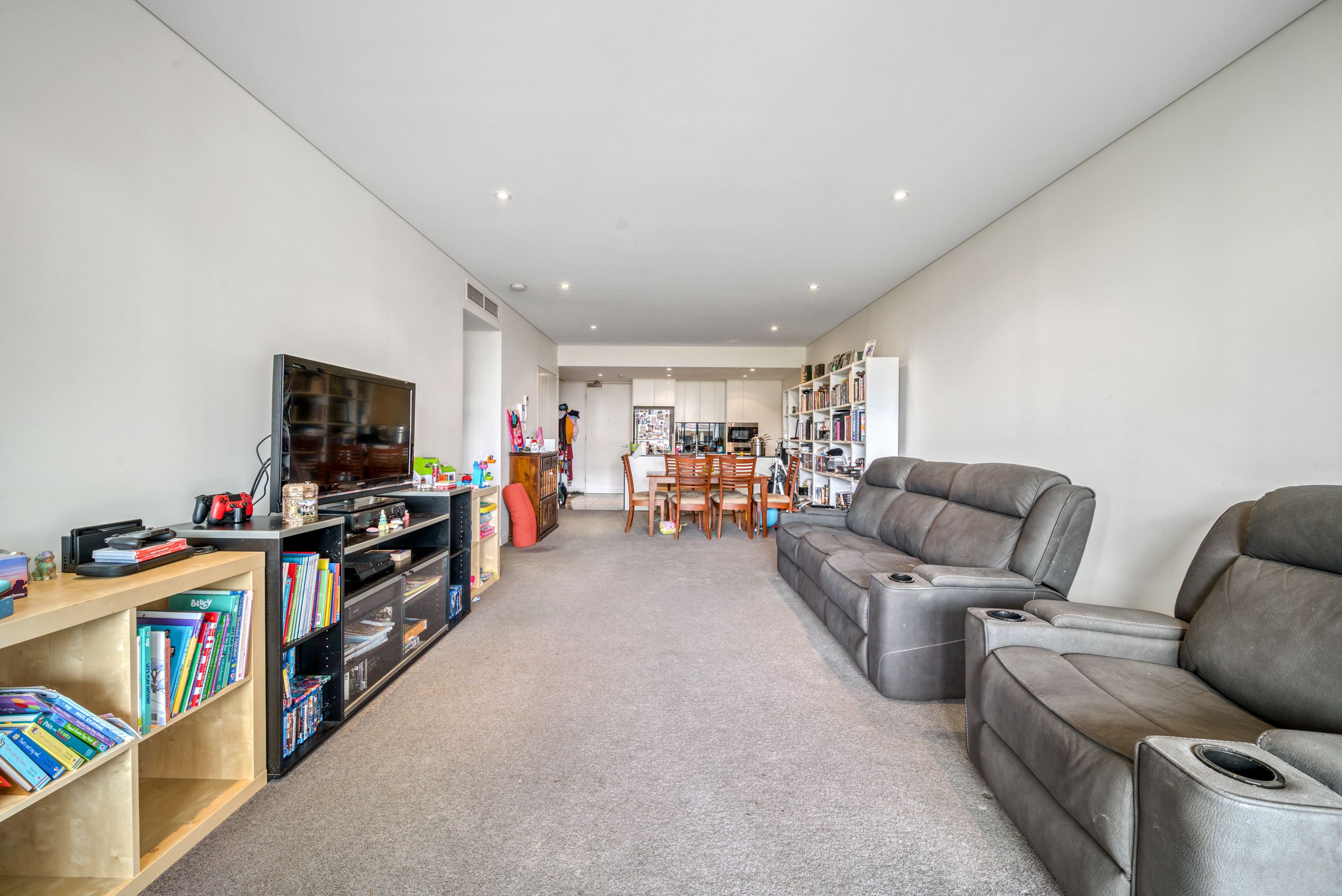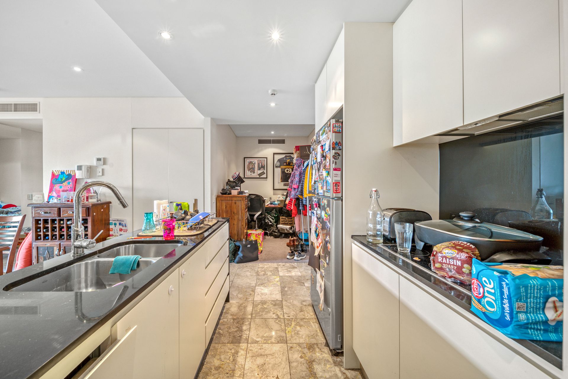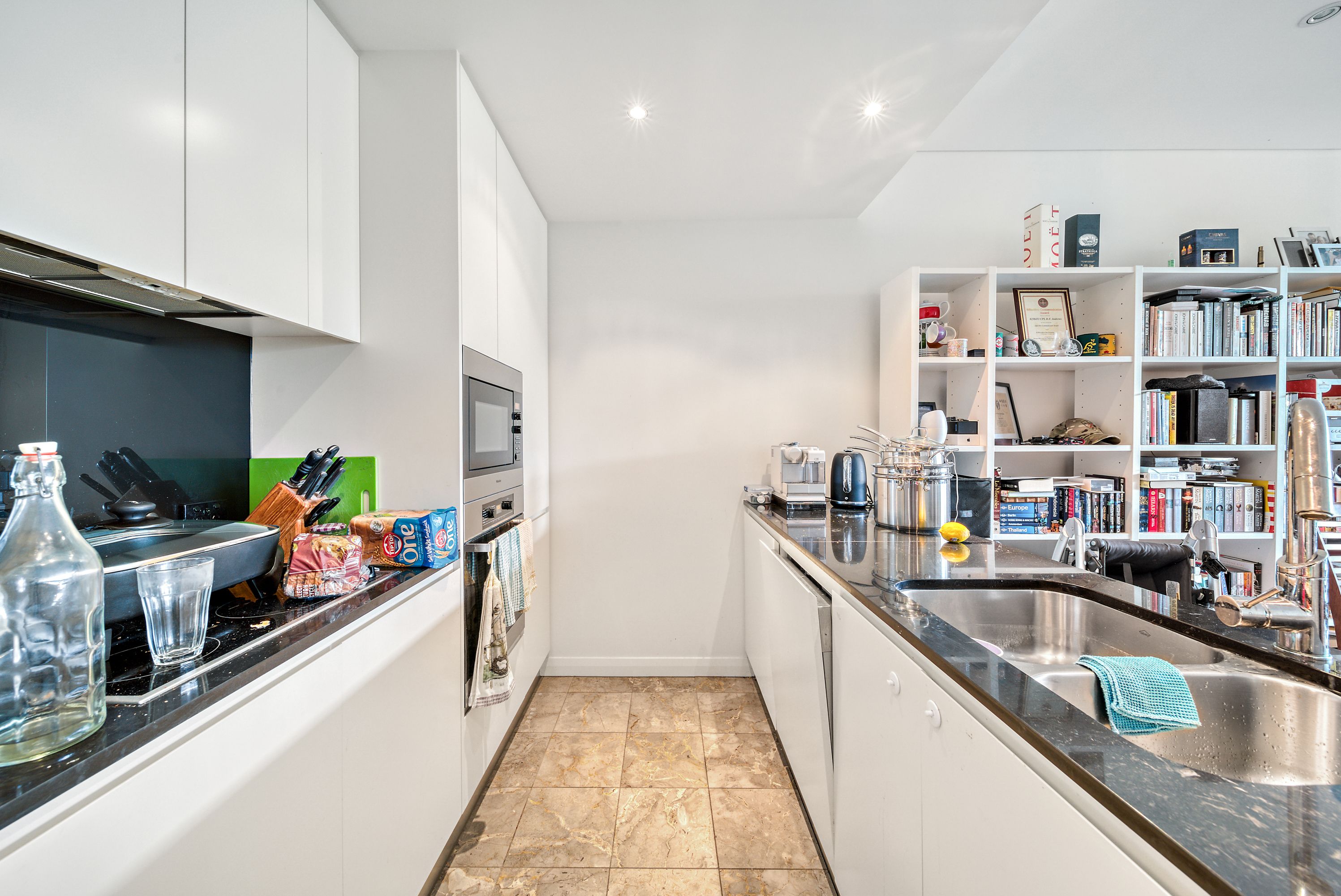 entering the apartment, you are greeted with the contemporary kitchen encompassing the open plan living area and dining room. The kitchen exudes modernity with a full suite of Miele appliances complemented by sleek stone benchtops and ample storage. At the end of the light filled living area, you open the double glazed sliding doors to the large private balcony. There is also a good sized study nook, for those who work from home or even just want a little more storage space.