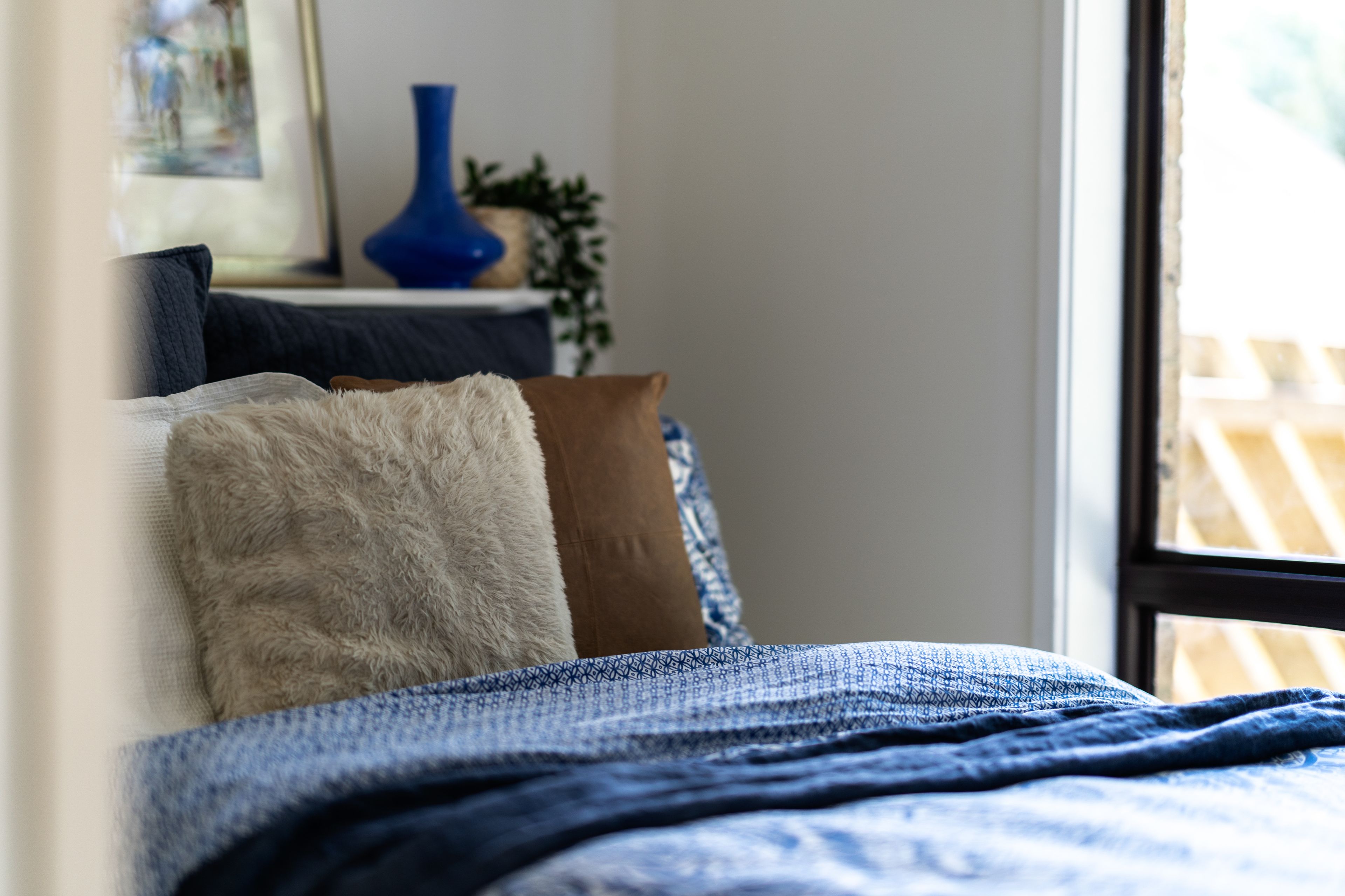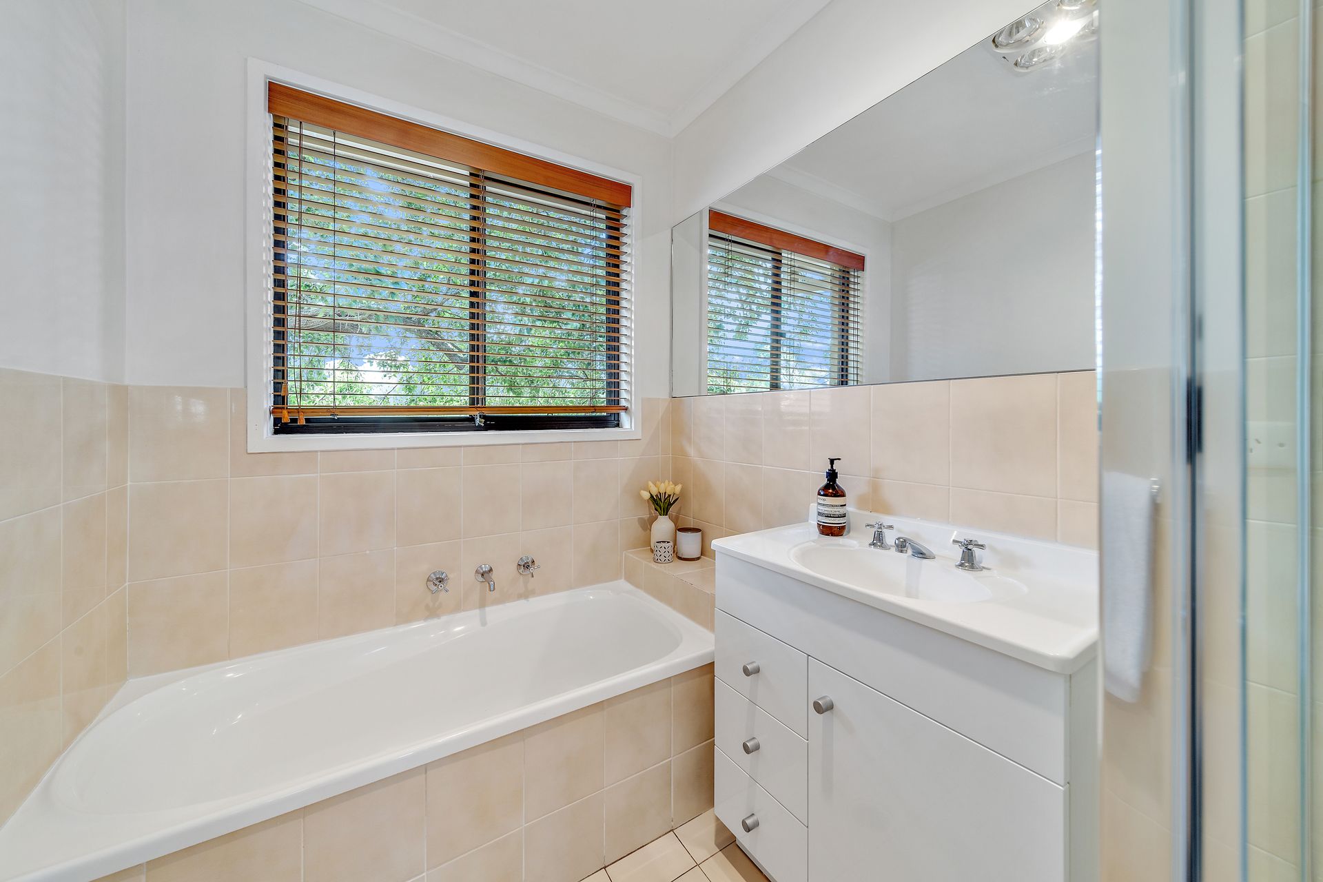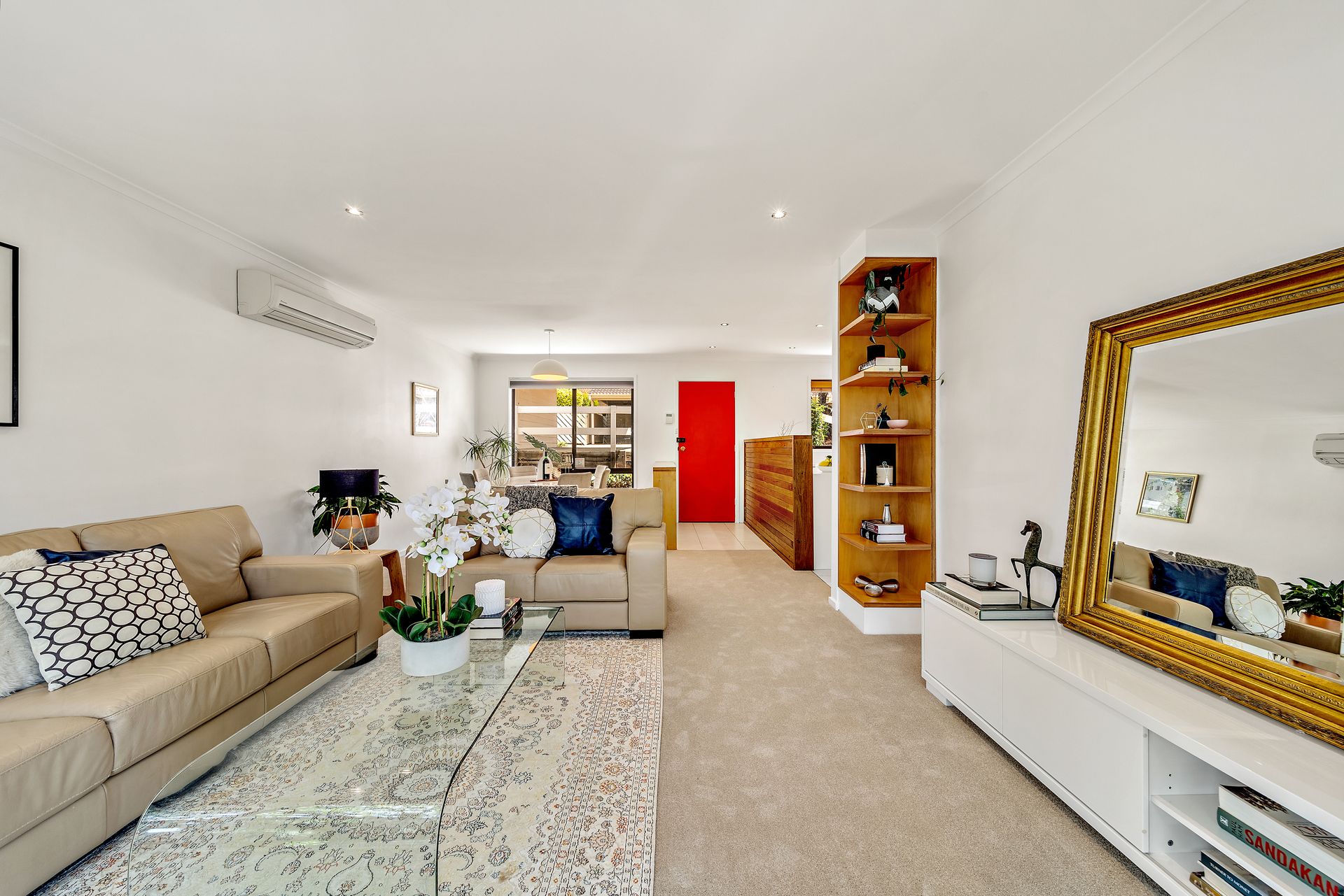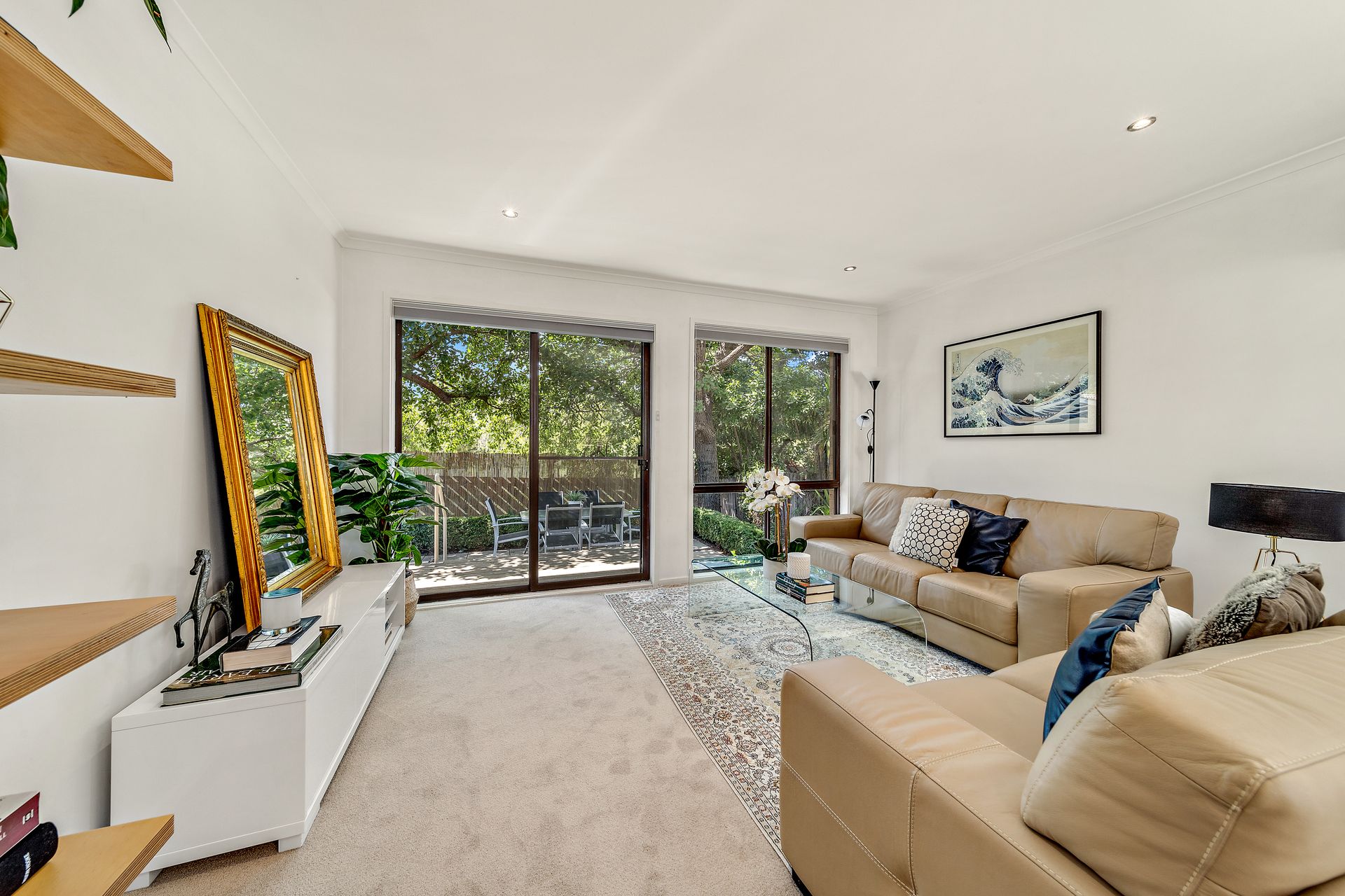 Pops of honeyed timber in feature walls and built-in shelving act as warm counterpoints. At the opposite end of the home are two generous bedrooms with built-in wardrobes. A bathroom with a large tub and separate shower services both of these rooms.