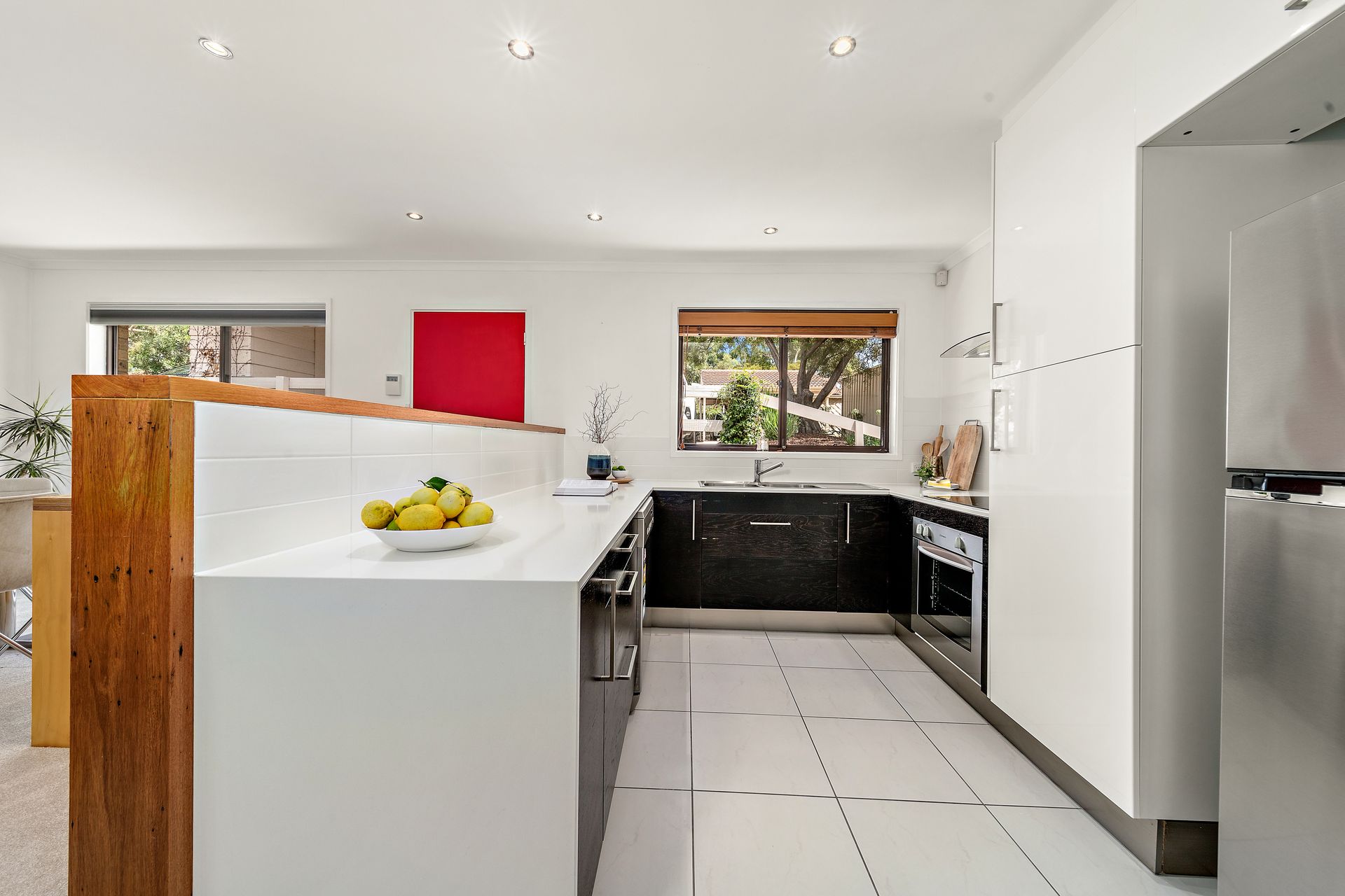 The well-appointed kitchen is a contemporary symphony with large format white floor tiles, stone benchtops, white subway tile splashback and black cupboards with stainless-steel fixtures and appliances.