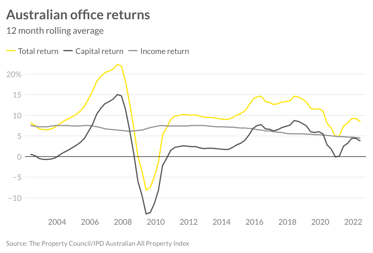 Looking across the longer term, the office market has seen much volatility moving in response to economic shocks, impacting capital and total returns. While this may result in some short-term pain for some investors, the quality returns that this asset class has enjoyed over the longer term cannot be understated. Over the past 10 years, it has returned 10.8 per cent per annum and looking back even further, including the GFC period, annual 20 year returns have also eclipsed 10 per cent.