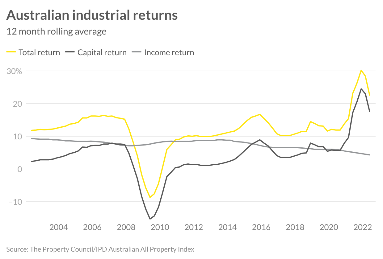 While the mismatch in supply and demand ensures income growth will continue for this asset class, the growing interest rates will put a cap on acceptable yields for industrial property in the short term. Industrial has proven to be an outstanding performer and has moved from what was considered as a secondary asset class to a premium one, given the changing way in which our community interacts with industrial property. Total returns over the last five years have hit 15.6 per cent per annum and 14 per cent per annum over the past 10 years, highlighting the longer-term attractiveness of this asset class. Considering the downturn during the GFC, total returns - even over a 20 year horizon - still achieved 12 per cent annually, highlighting the quality, longer-term opportunity on offer for industrial assets.