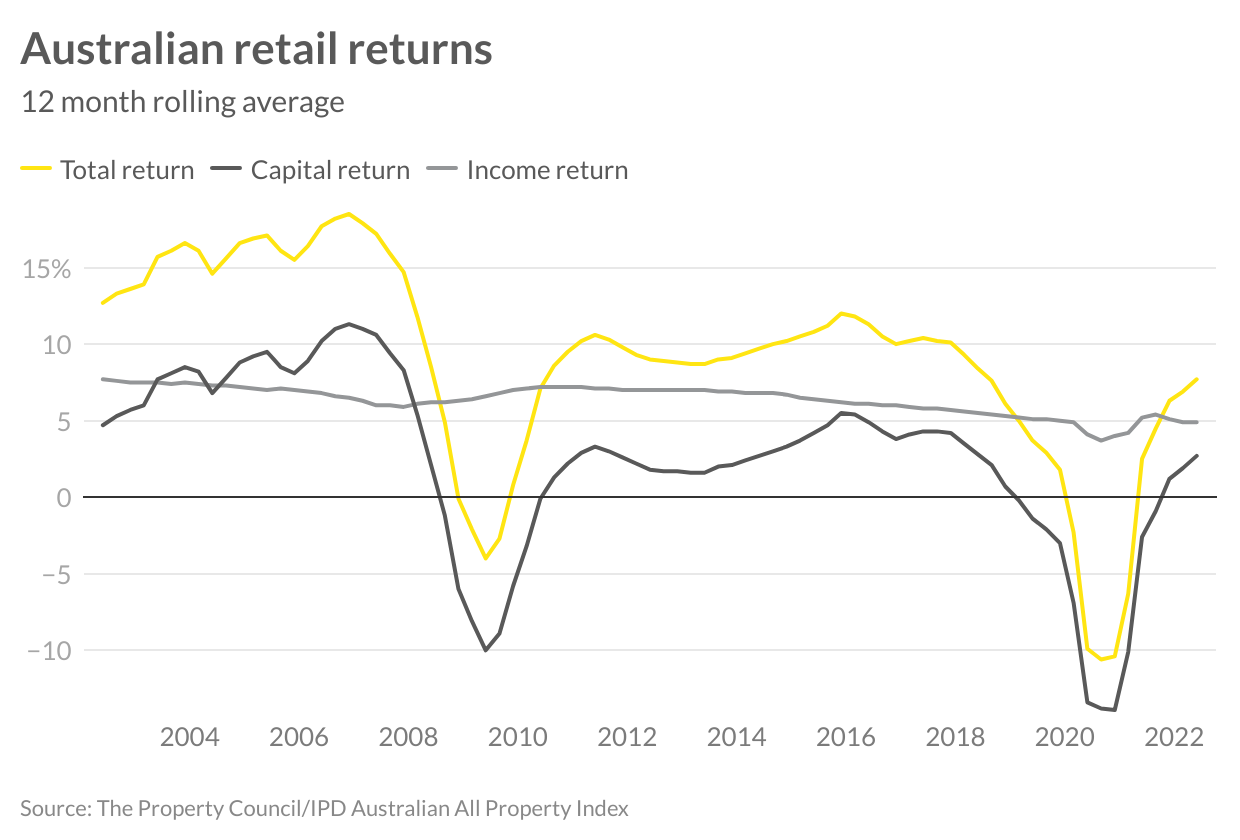 Over the past 10 years, retail property has been under the microscope, and during the last few years not enjoyed the same level of investment demand as other commercial real estate. Despite this, total returns still averaged six per cent per annum, while over the longer term (20 years), total returns achieved nine per cent annually, highlighting that commercial assets are a long-term investment play.