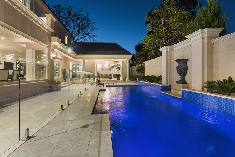 The landscaping, a compliment to the French Provincial exterior, includes a bespoke swimming pool complete with a sparkling water feature.