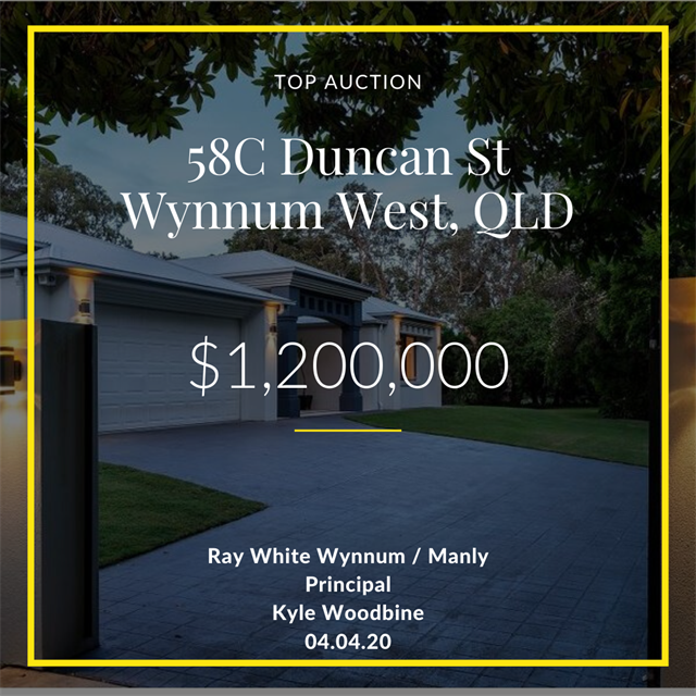 Principal Kyle Woodbine of Wynnum | Manly took out the top auction sale of the group with the sale of 58C Duncan St, Wynnum West which saw five registered bidders battle it out. Auctioneer Phil Parker kept them entertained online before his gavel came down at $1.2 million.