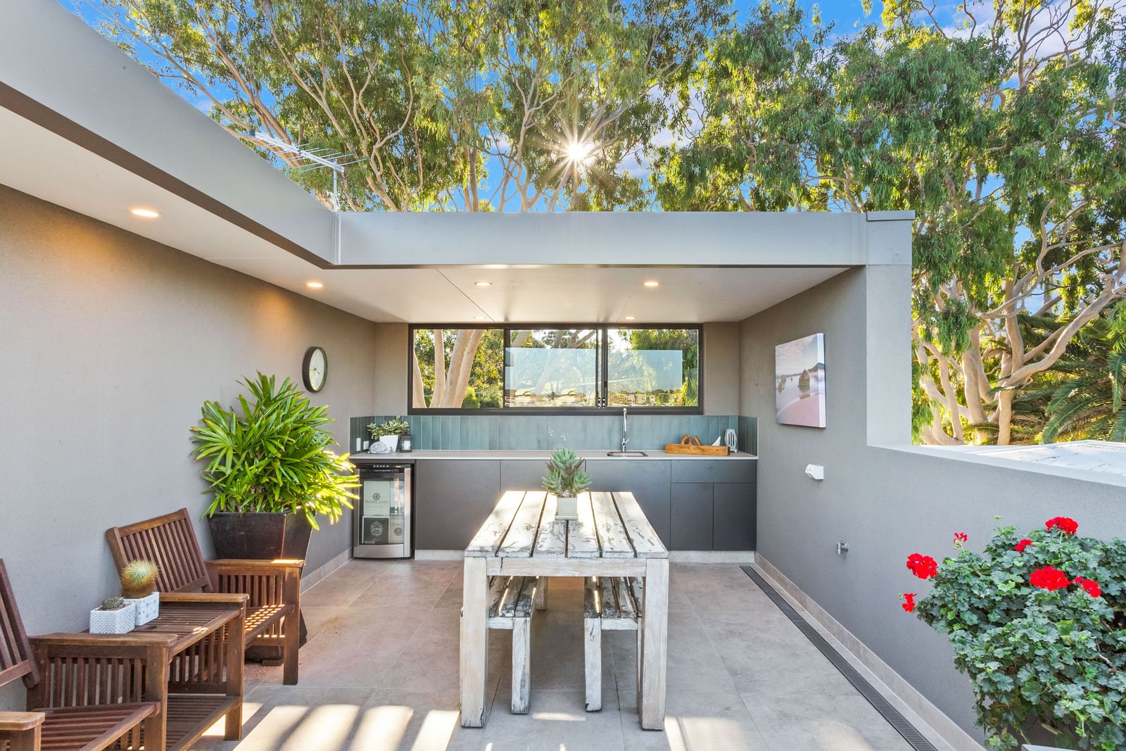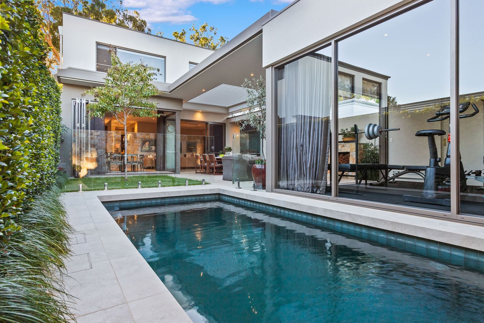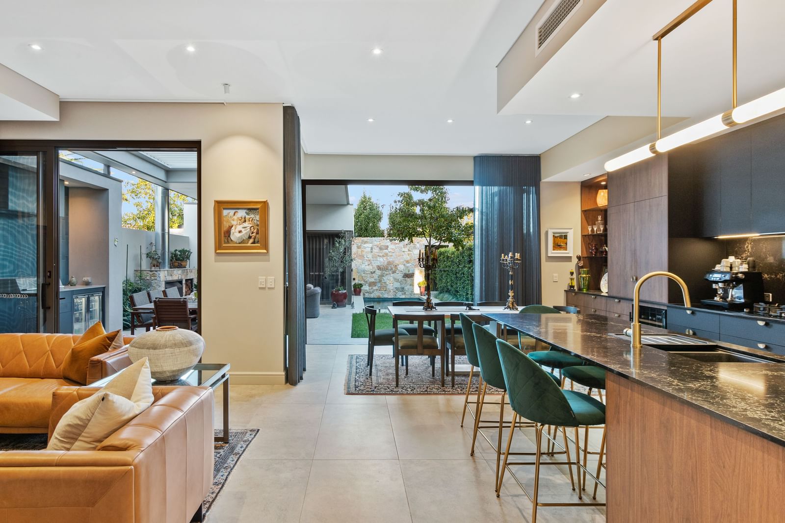 “I do love coming home and walking into the living space which opens up completely (bifolds and stackers across the whole 10 metre rear façade) to the softness of the al fresco with its stone features, the reflection of the swimming pool, mature gardens and feature lighting and with no overlooking just treetops on all sides,” Mr Tait said.