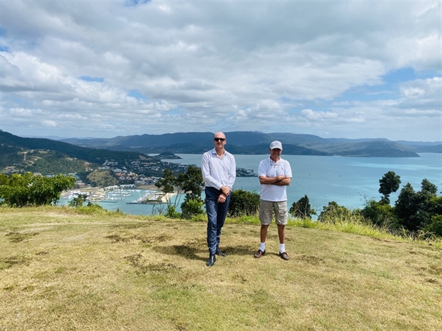 Ray White Whitsunday Principal Mark Beale (left) with Hog's Breath Founder Don Algie (right) at Chesapeake Whitsunday.