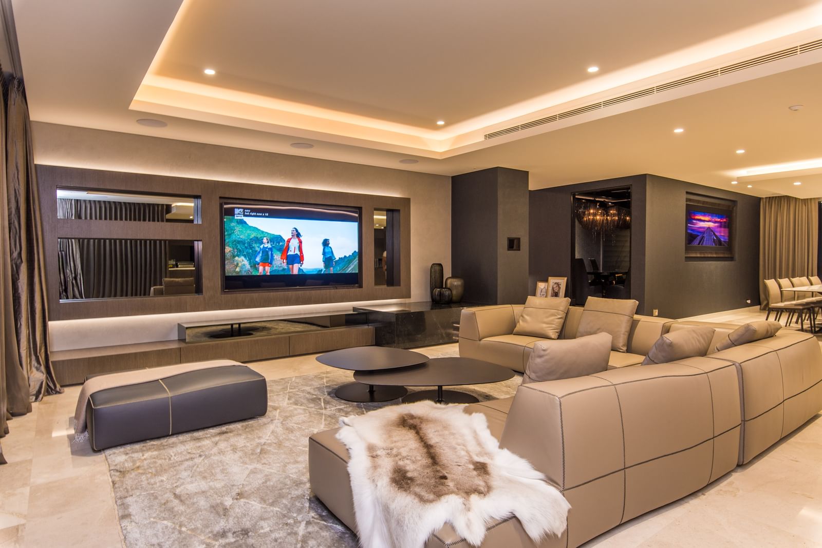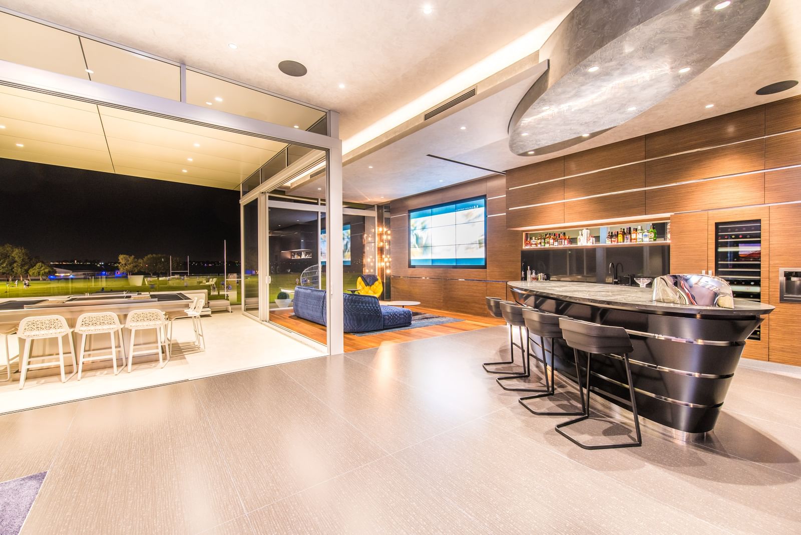 The home is equipped with extensive high-definition display technology, 24 integrated LED displays positioned throughout the residence, including a custom video wall in the entertaining lounge.