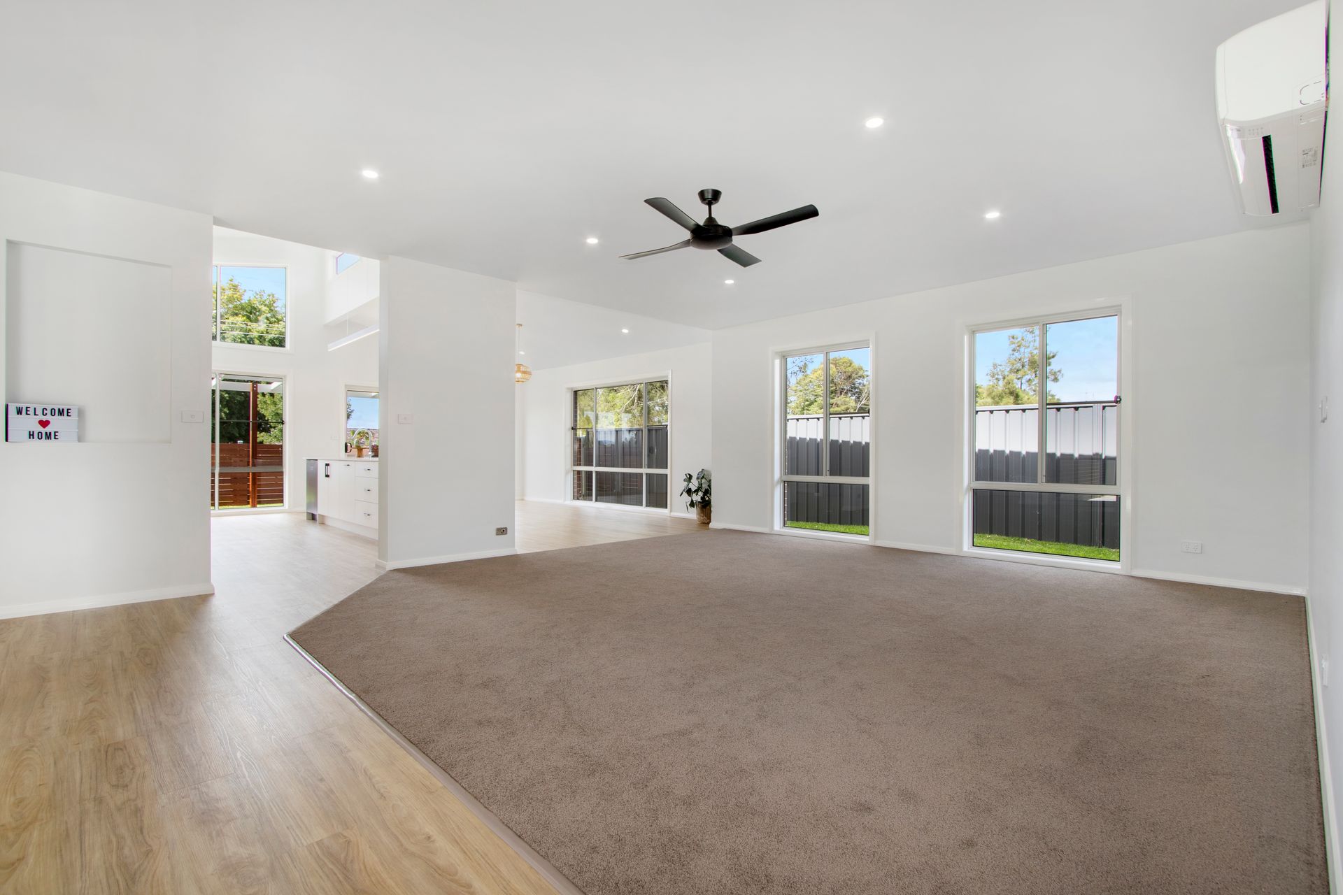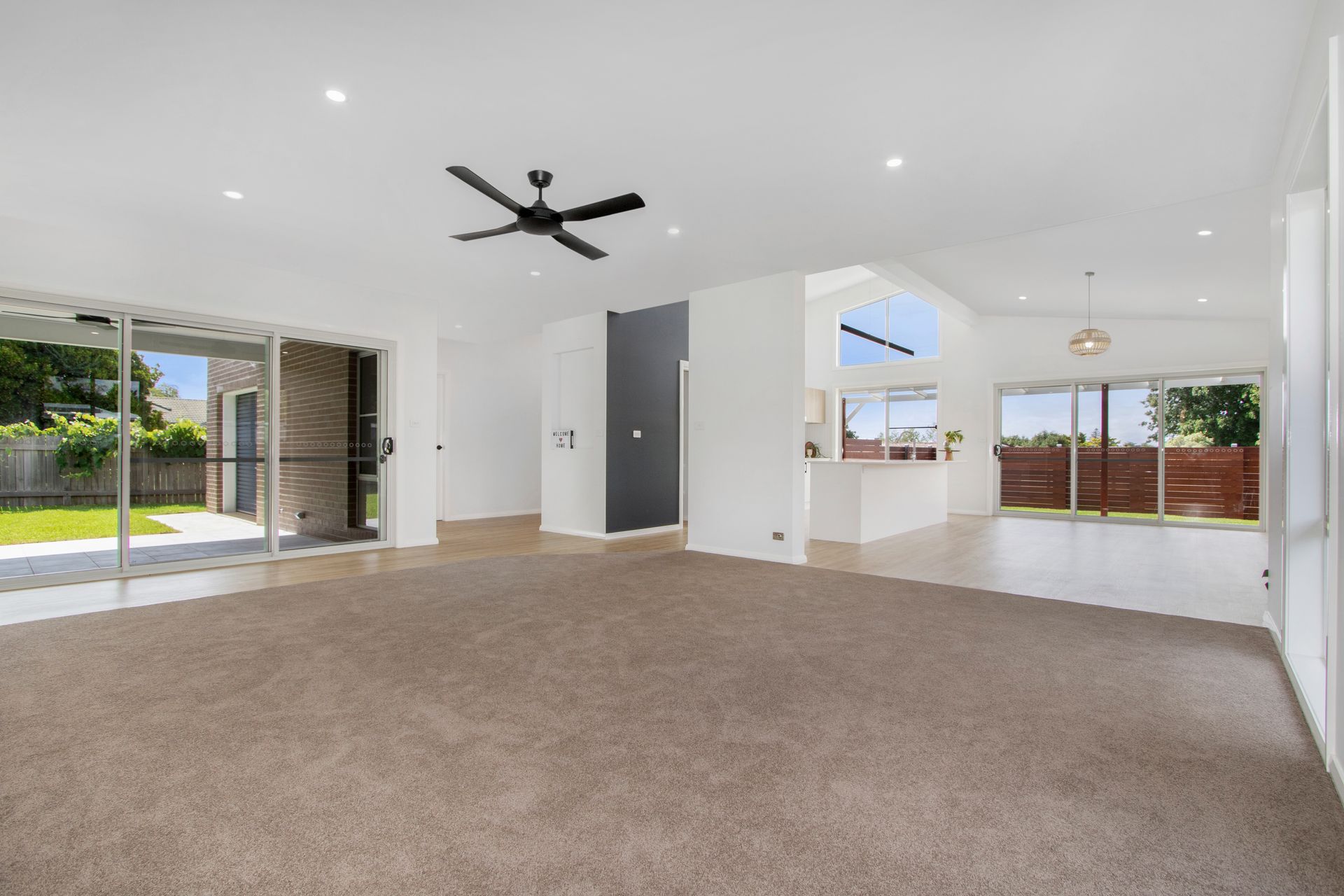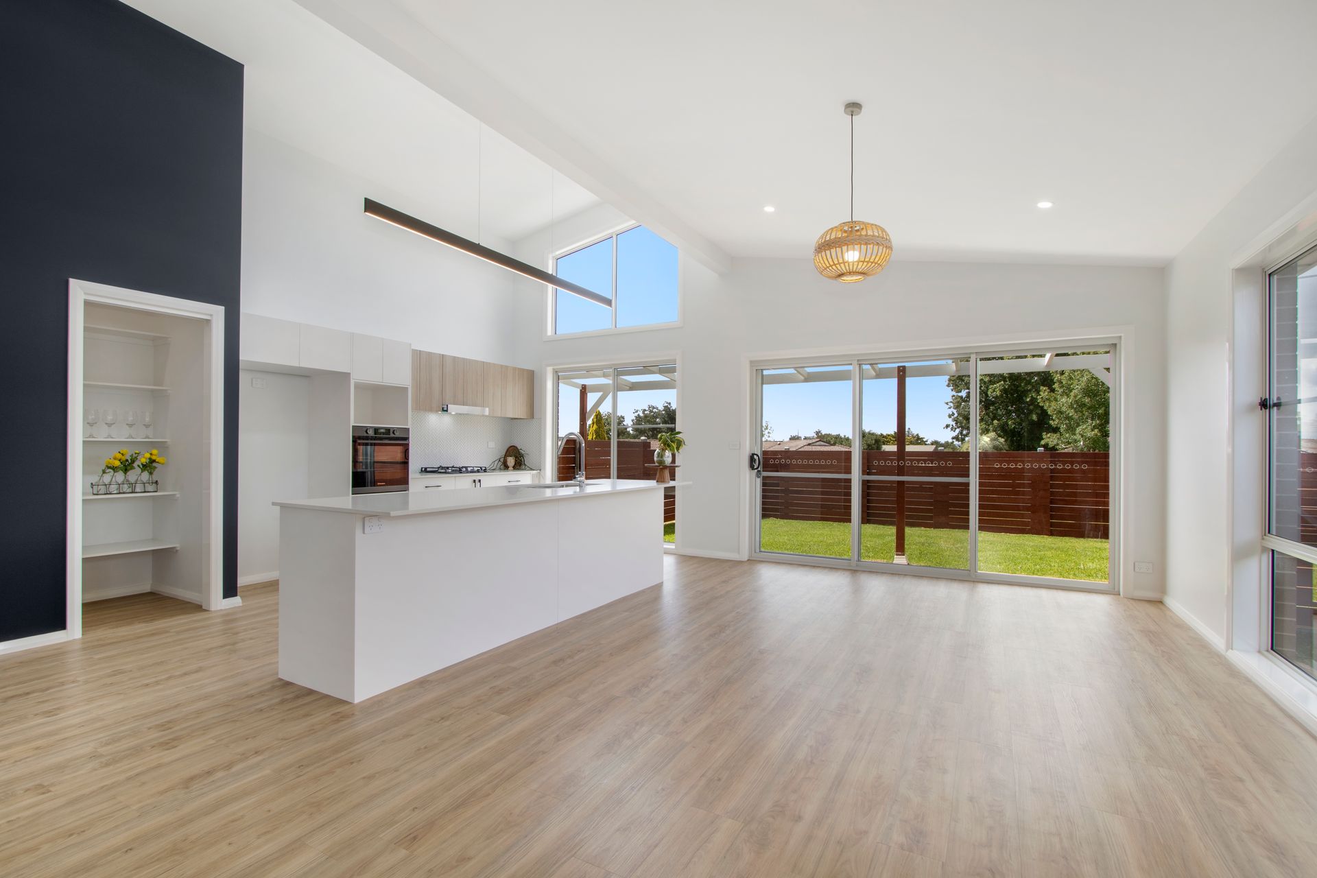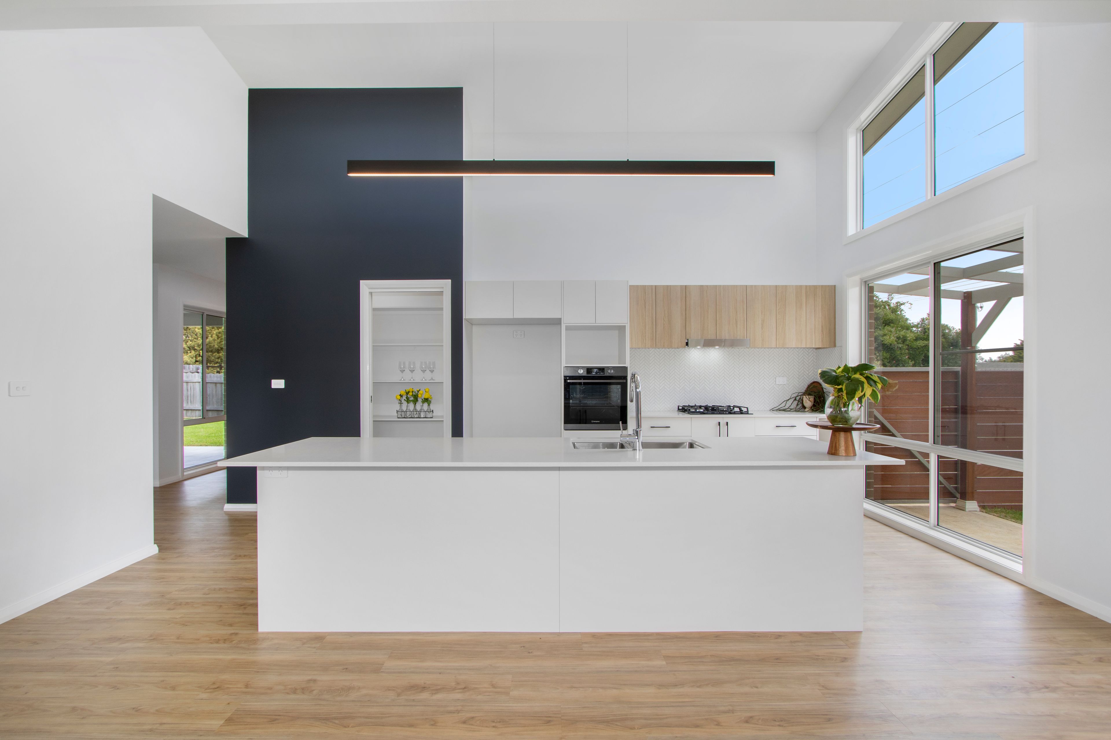 A sprawling open plan and generous north facing living dining and kitchen area captures loads of ambient light due to the tall sprawling sliders and solar passive design. This large space easily accommodates the demands of a large family, and still has room to entertain many extra guests.
