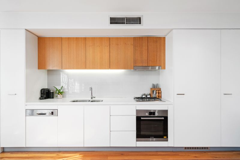 - Galley style kitchen includes stainless steel Bosch appliances, Caesarstone bench tops, ample storage and gas cooking