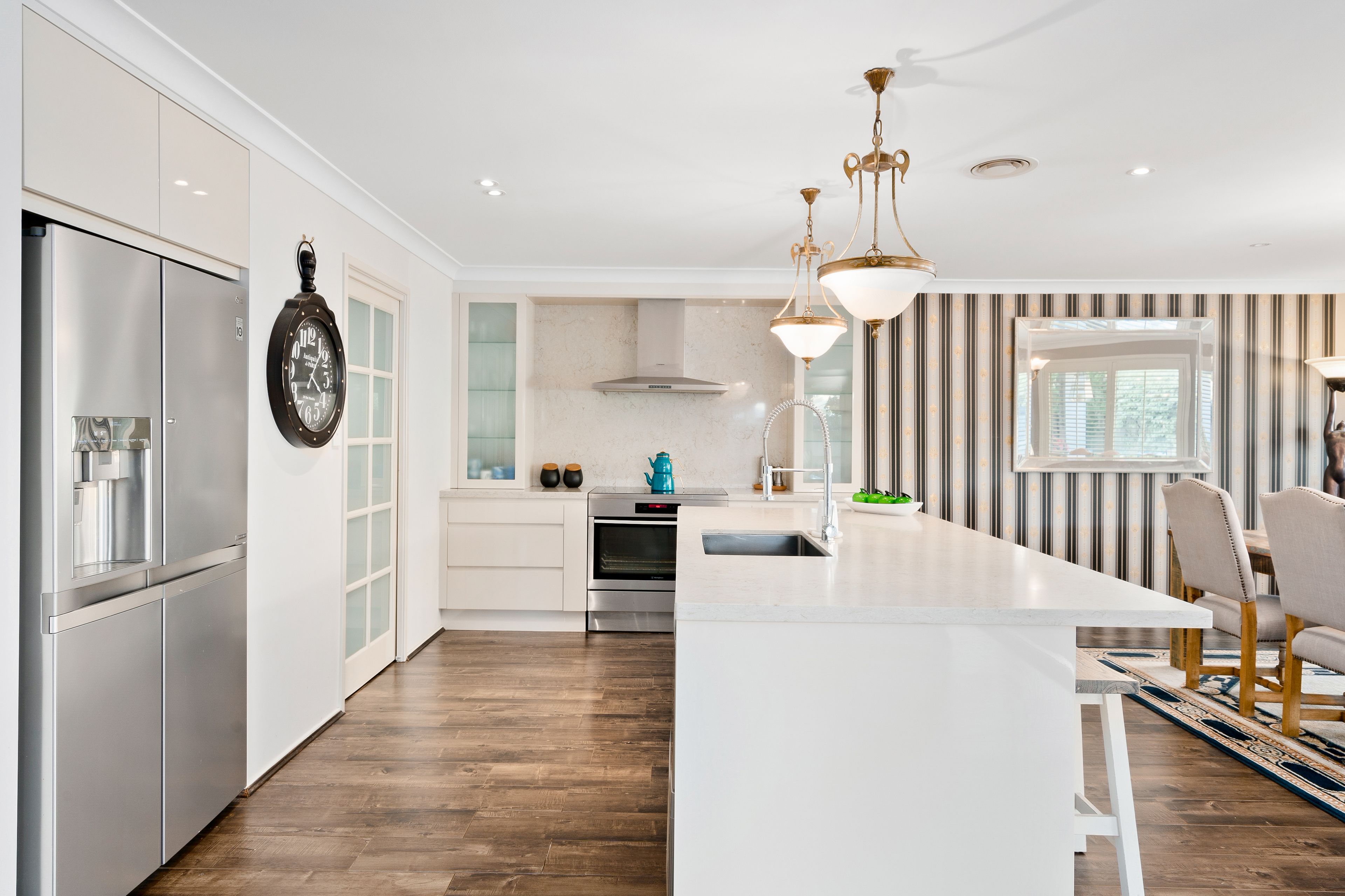 The ground floor plays host to a fifth bedroom adorned with a ceiling fan and a built-in robe plus a separate study area and a well-placed powder room. The kitchen stands as a dream come true for any entertainer, boasting a 40mm marble countertops, top-of-the-line European stainless steel appliances, a 900mm cooktop, and a butler's kitchen/pantry. The expansive floor plan of this property has been tailor-made for family gatherings, offering both formal & informal living, while a fireplace in the living room imparts warmth and character to the space.