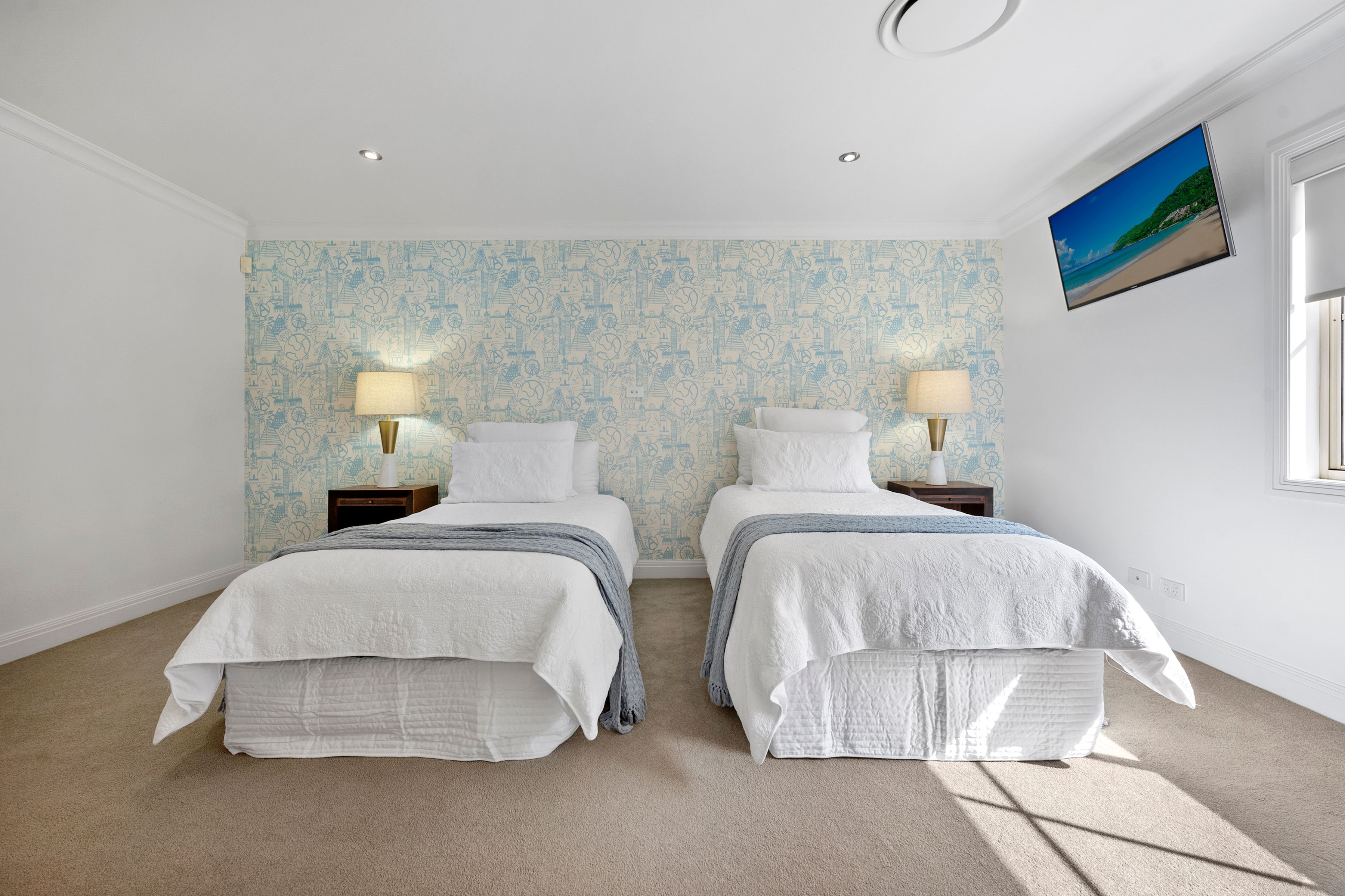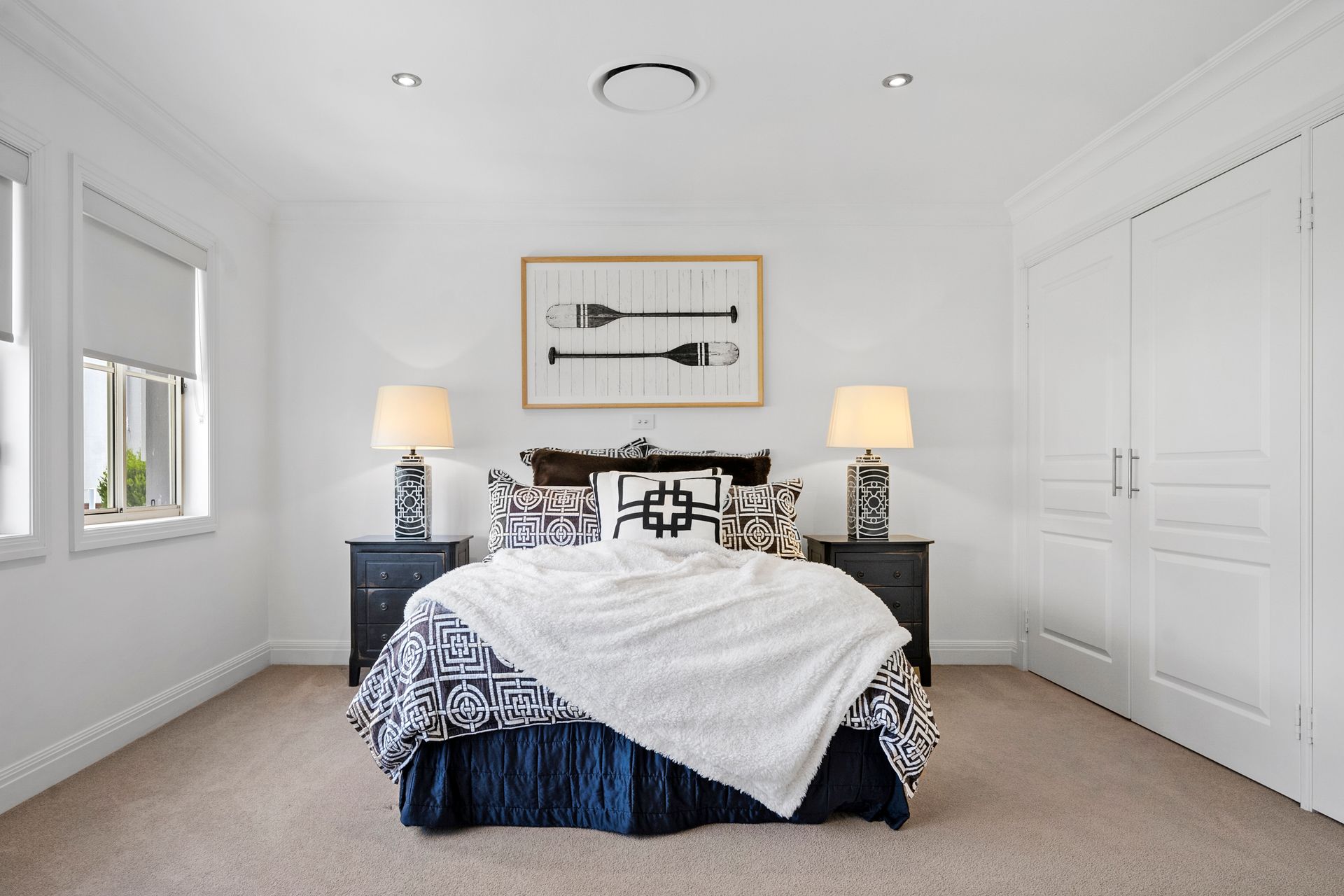 Upstairs accommodation comprises five generously sized bedrooms and two bathrooms, all carpeted for comfort. The north-facing main suite enjoys a private balcony, walk-in wardrobe, and a two-way marble-finished ensuite. All bedrooms feature ducted air conditioning and smart TVs.