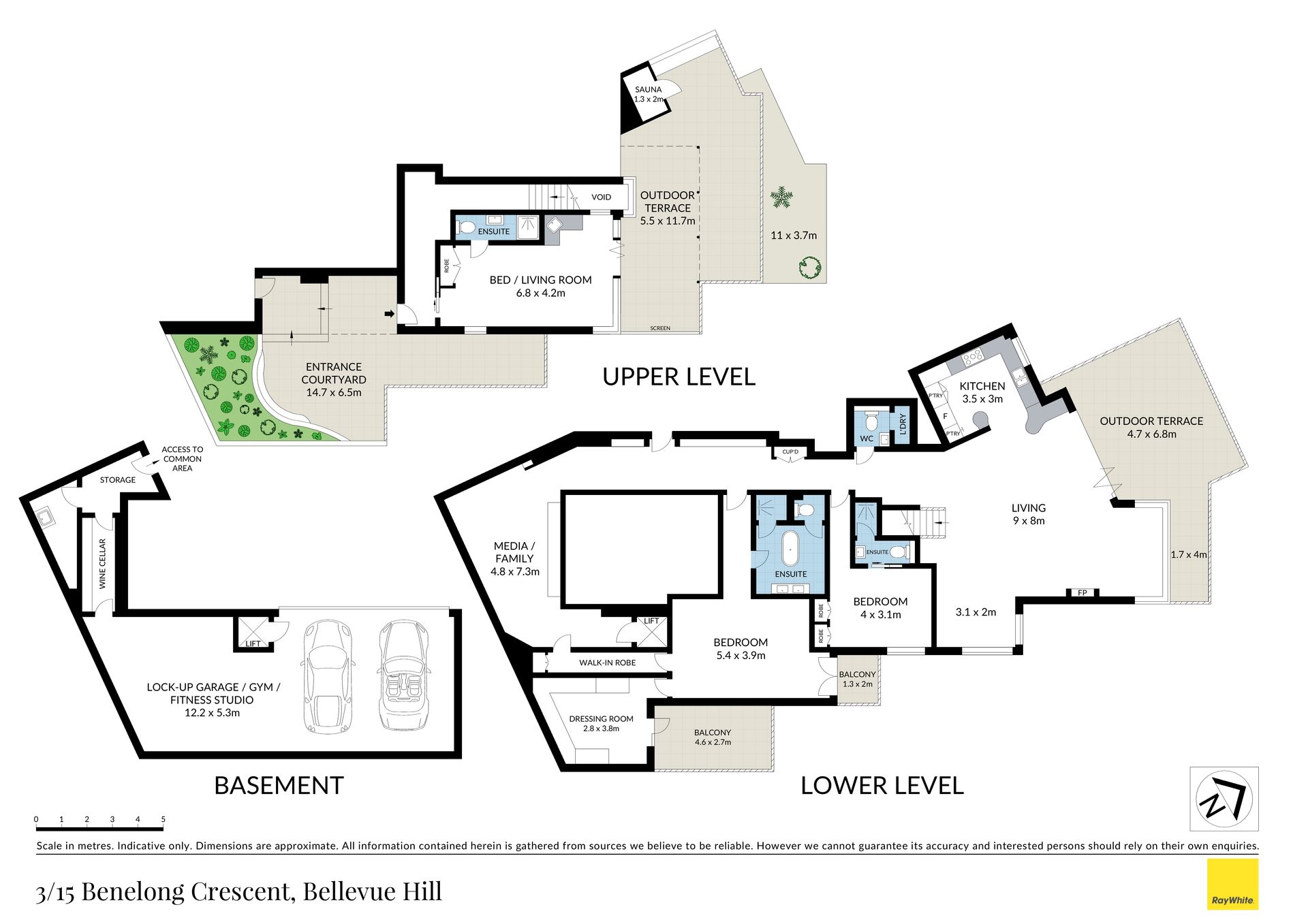 - 3 bedrooms, 3.5 deluxe bathrooms, large 2 car garage - Private entrance into a landscaped courtyard - Sleek gas kitchen, large media/family room, fireplace - All bedrooms with built in robes and ensuite bathrooms - Parquet floors, high ceilings, quality fittings throughout - Private lift, level access, intercom entry - Private gym/studio, sauna, wine cellar, storage rooms
