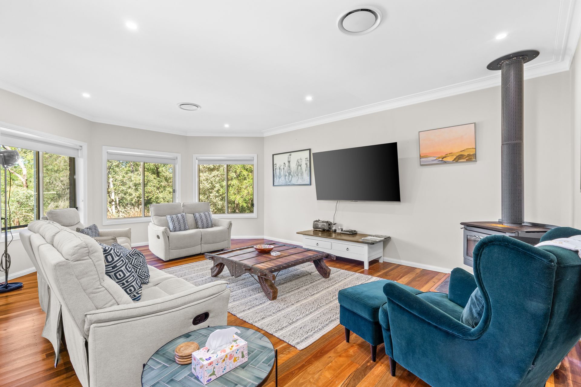 High ceilings, warm timber floors, and ducted air conditioning and slow combustion fire ensure year-round comfort, while the wraparound verandah invites you to unwind outdoors, whether you're enjoying a morning coffee, a sunset drink, or simply soaking in the peaceful landscape.