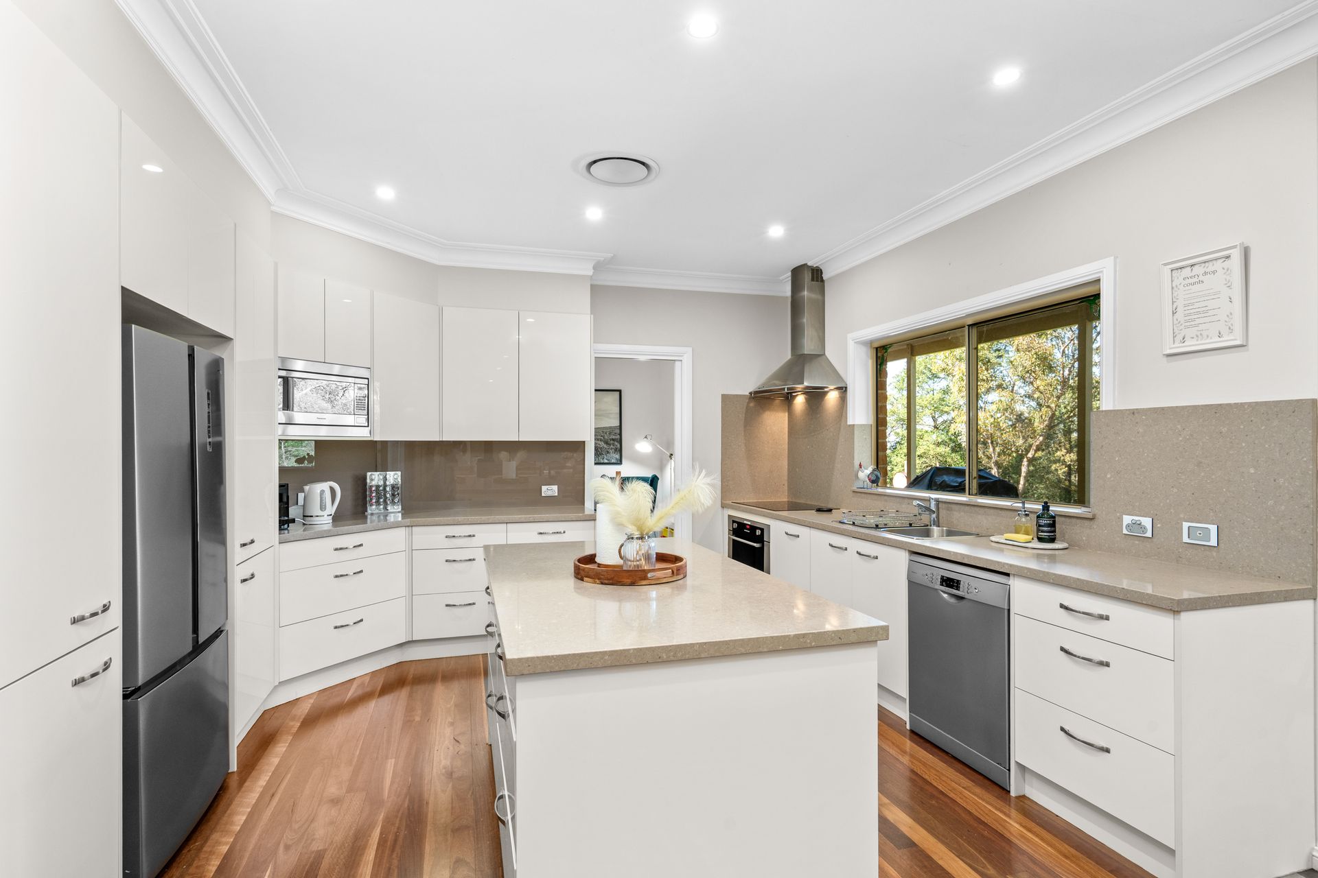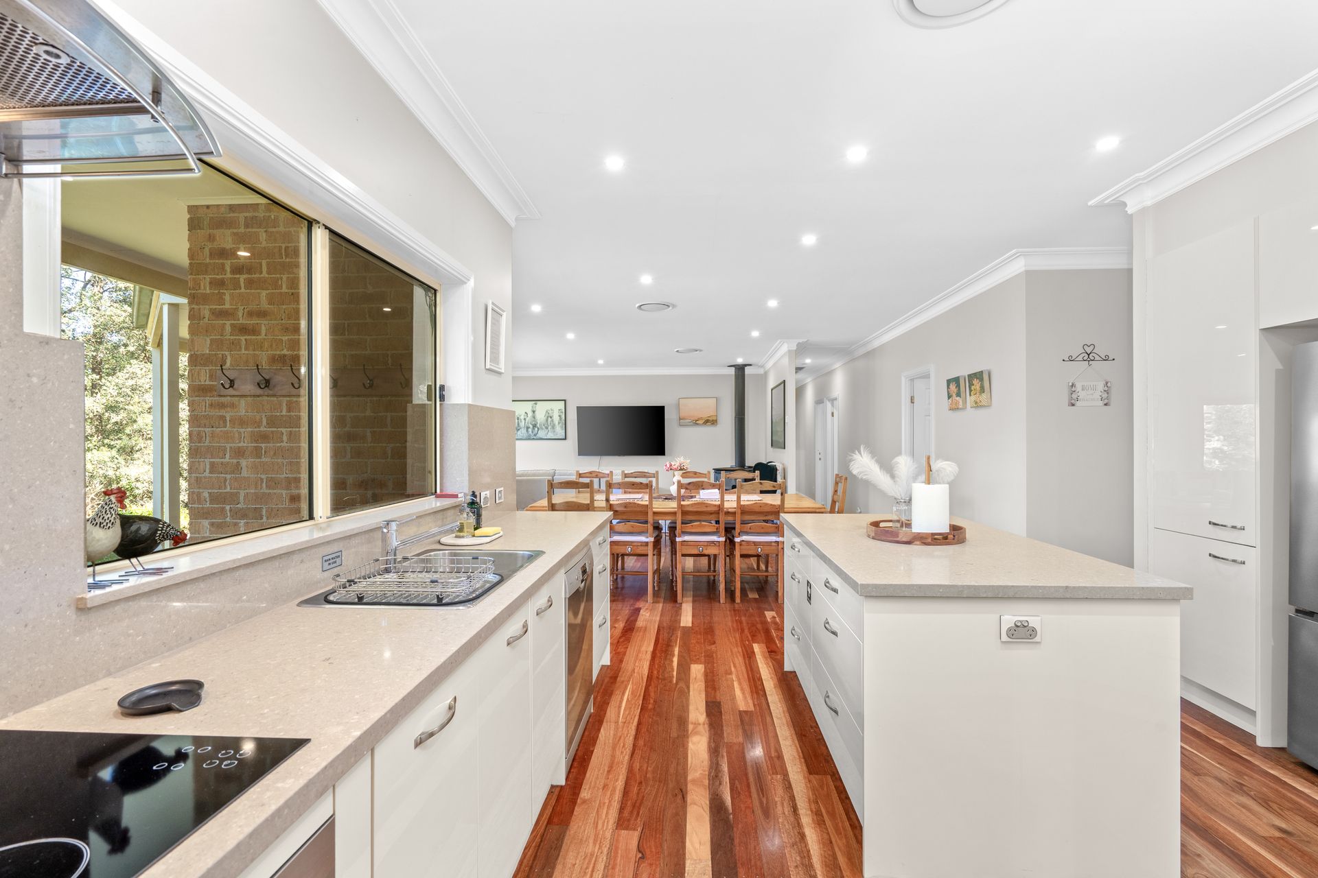 Step inside the beautifully presented home and you'll immediately feel a sense of calm and welcome. The heart of the property is its gourmet kitchen, where stone benchtops, high-end appliances, and ample workspace make cooking and entertaining a joy. Flowing seamlessly into the open-plan dining and living areas, the home has been designed to frame the surrounding natural beauty from every angle.