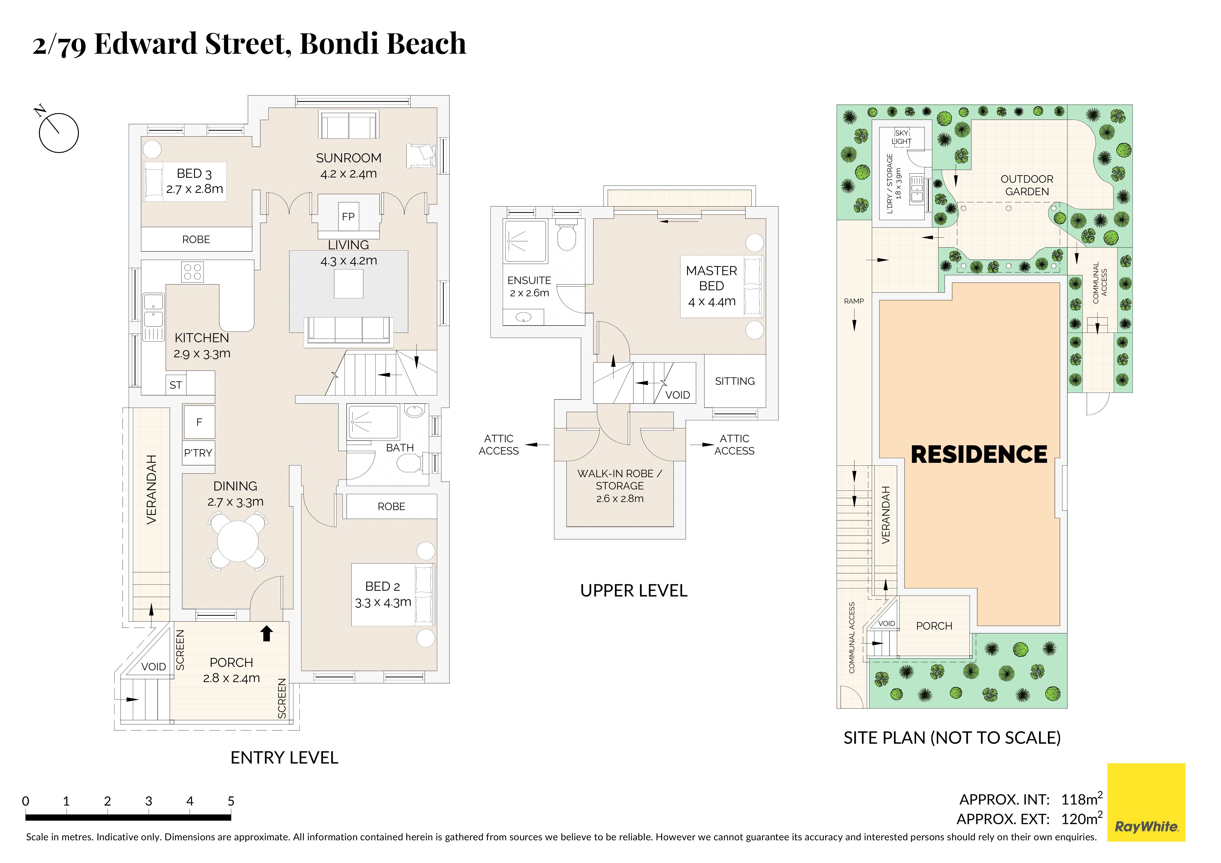 - 3 bedrooms with storage, 2 bathrooms - Open plan living/dining, timber floors - Courtyard and serene established garden - Generous stone kitchen boasts gas cooktop - Private top floor main bedroom, ensuite - Sunroom, study, soaring ornate ceilings - Full brick, stroll to Bondi Public School