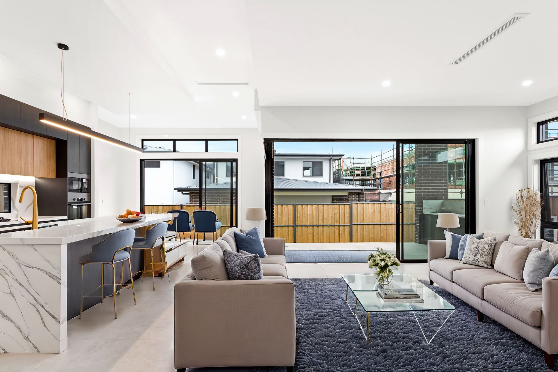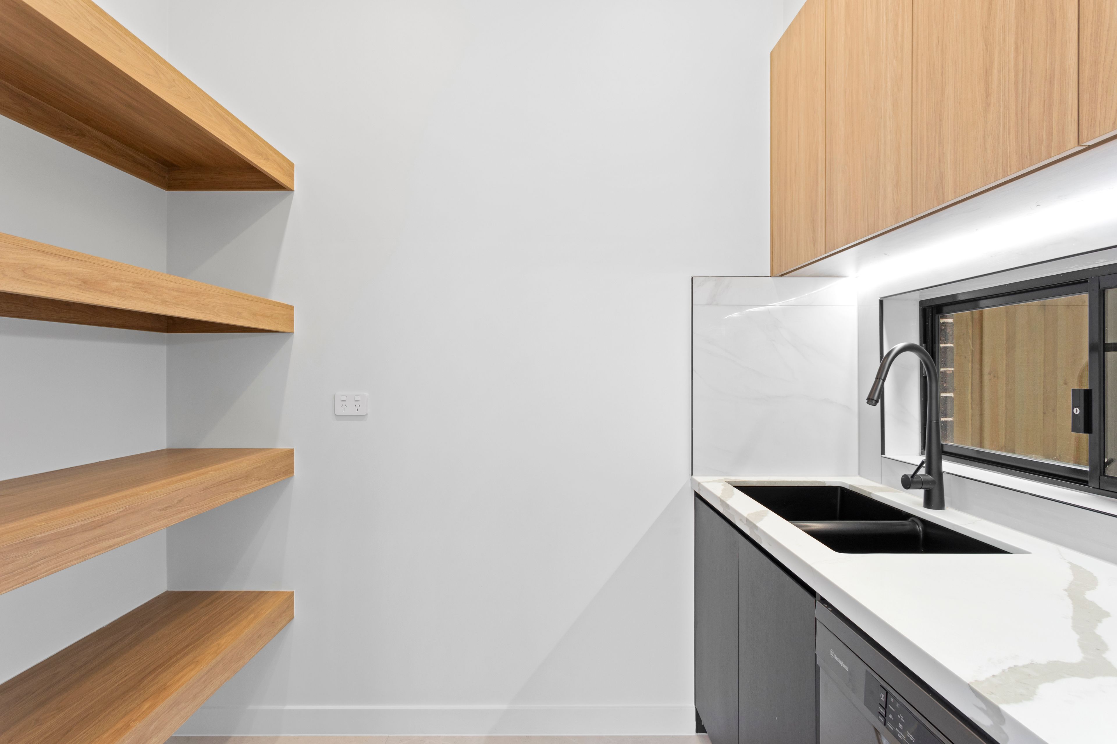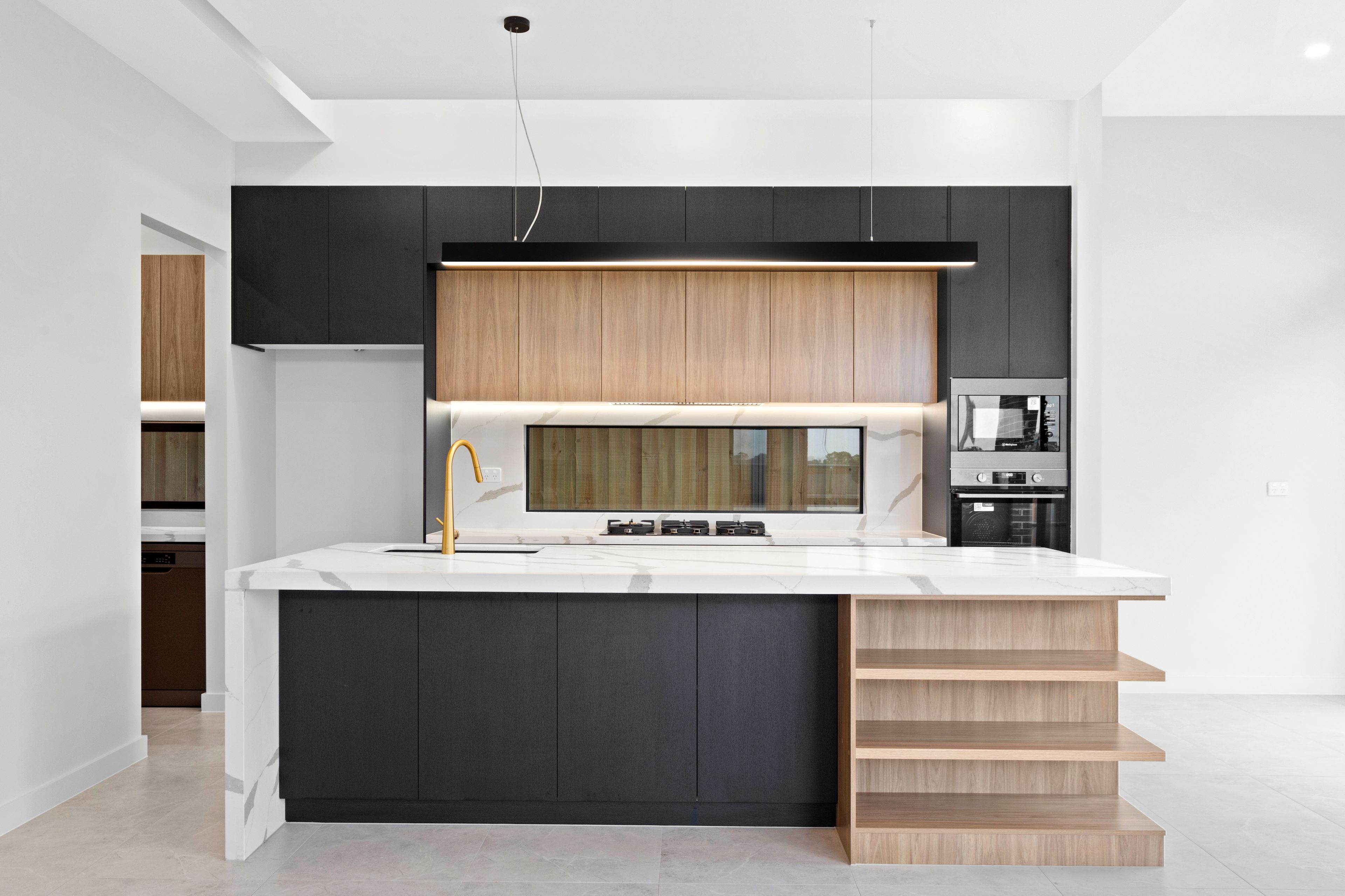 The gourmet kitchen is a true masterpiece, thoughtfully designed to inspire your inner chef. It boasts top-tier appliances, including a high-performance burner gas cooktop, oven, and built-in microwave. The kitchen's aesthetic is elevated by marble stone benchtops and splashbacks, and stylish lighting that casts a warm, welcoming glow. The centrepiece is the waterfall island benchtop with an eat-in breakfast bar, providing a perfect spot for casual meals. The butler's walk-in pantry is an added luxury, featuring a dishwasher, additional sink, and ample storage to keep everything organized and within reach.