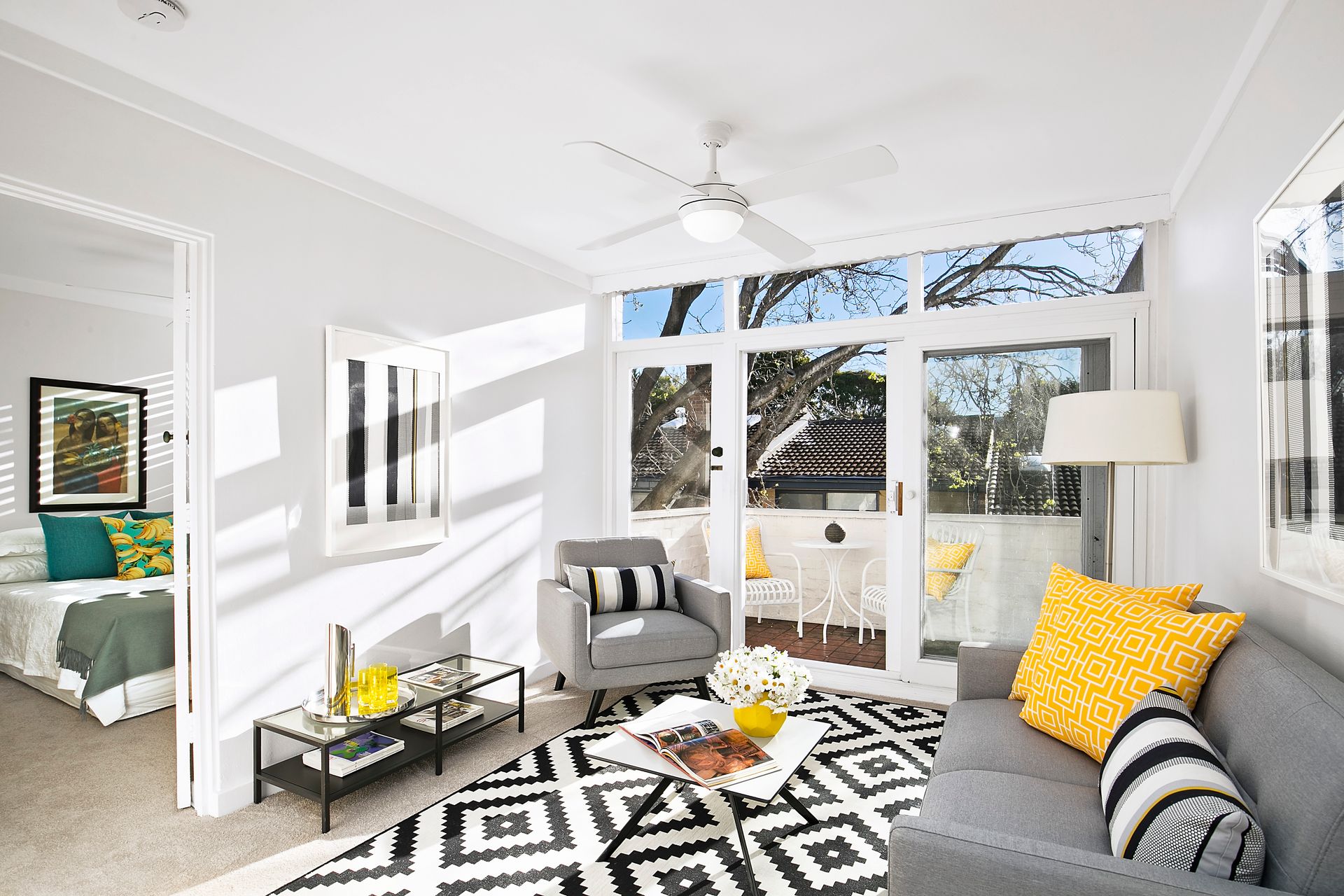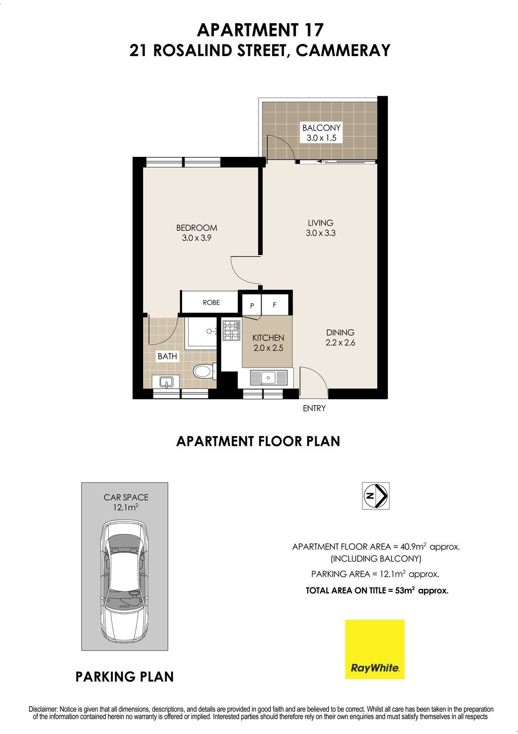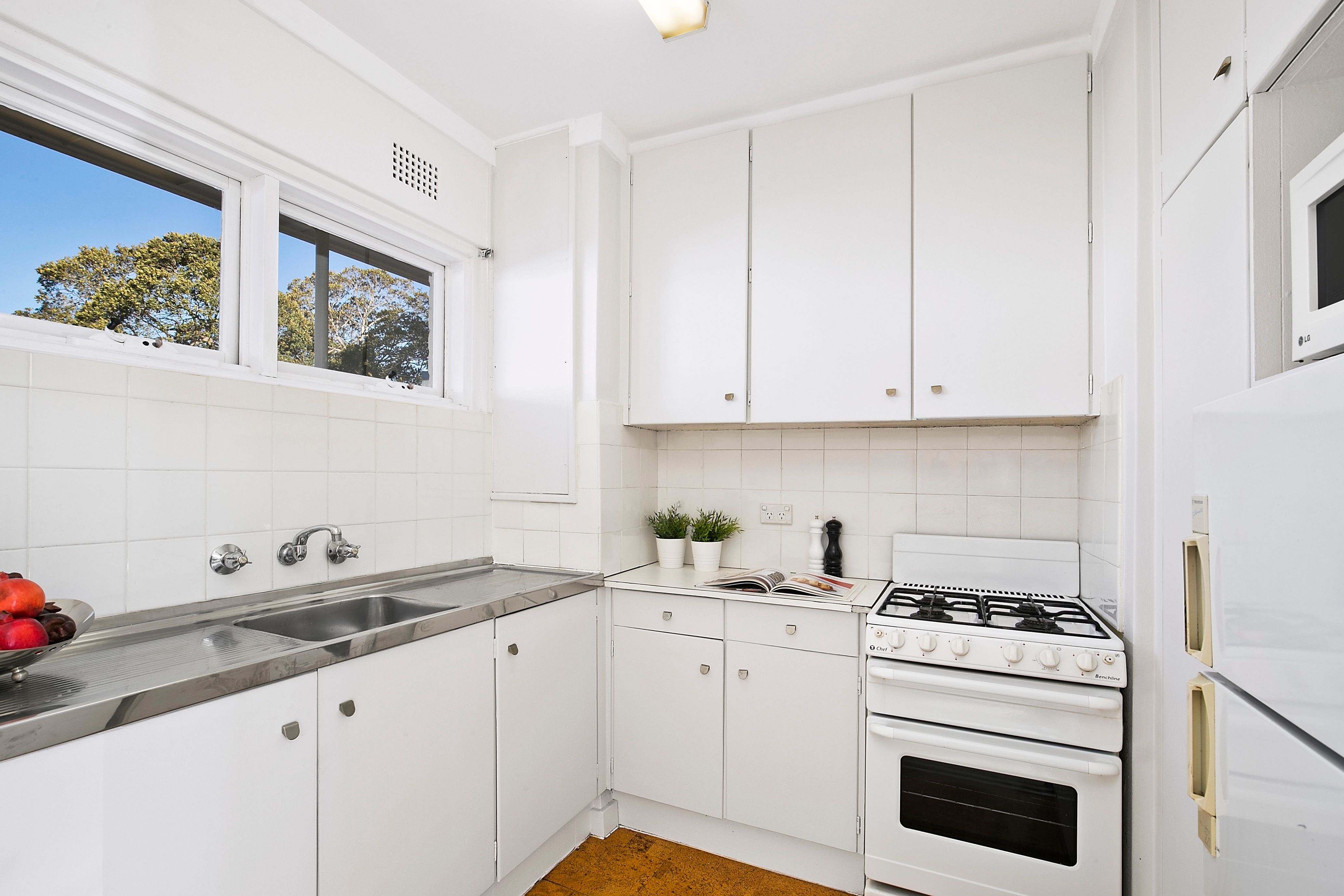 * Combined living and dining room opening to a leafy balcony * Basic white kitchen, light and bright with gas cooking * Double bedroom with built-in wardrobe and plantation shutters * Classic white and teal tiled bathroom with walk-in shower in excellent condition