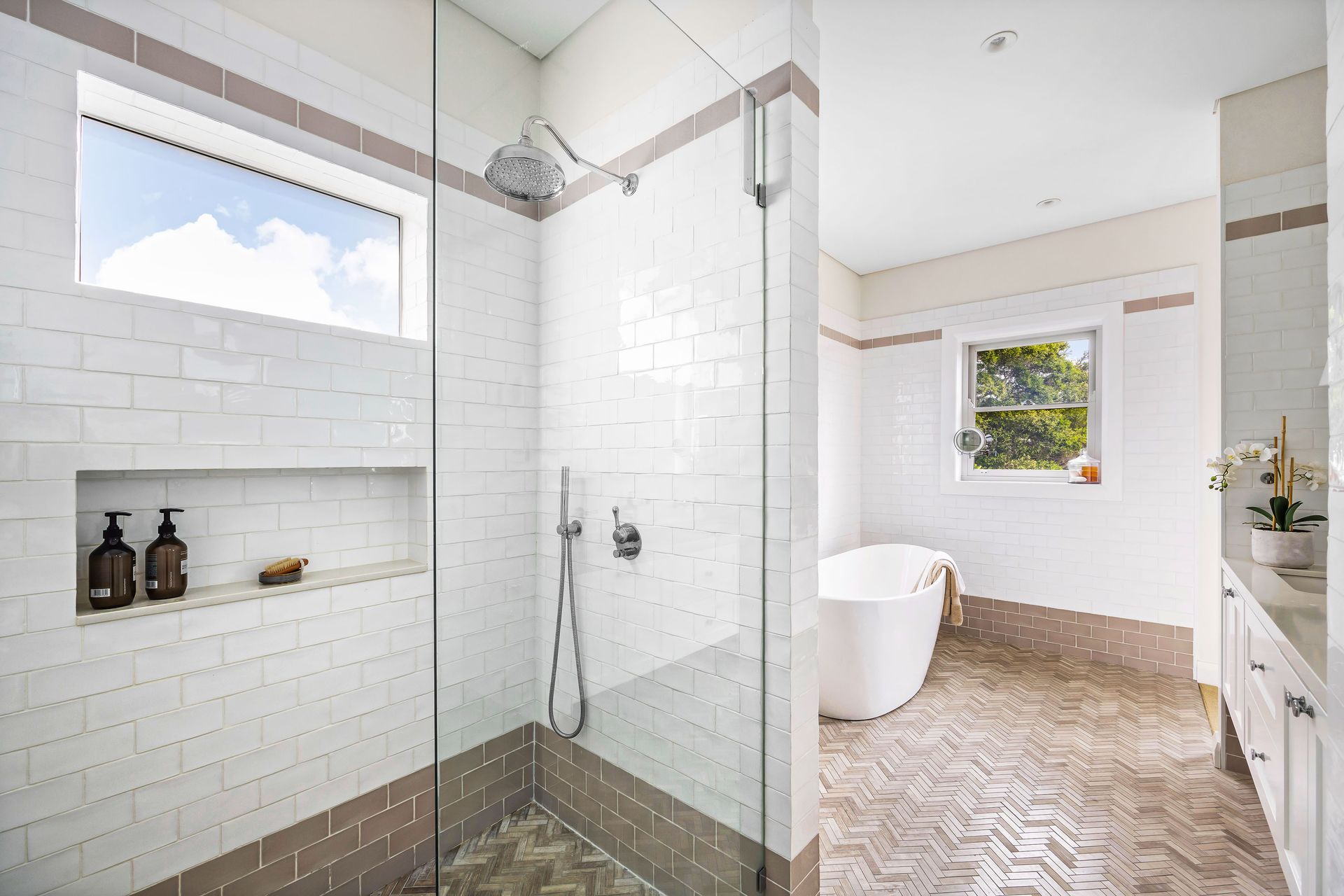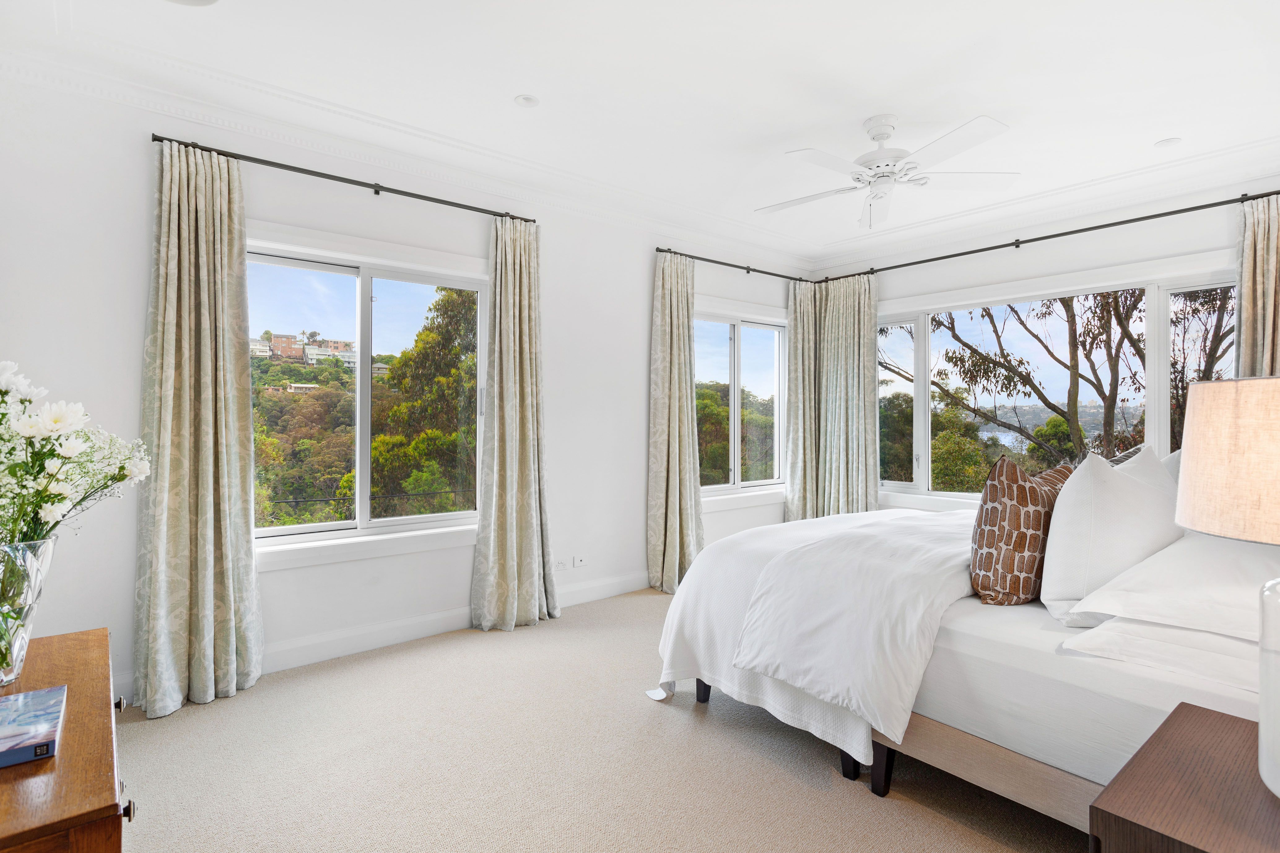 Topped by three inviting bedrooms, the king-sized master suite channels north easterly views across to Middle Harbour. Two luxe bathrooms service the home including a spectacular five-star ensuite with leafy outlook, under floor heating and freestanding designer bathtub.