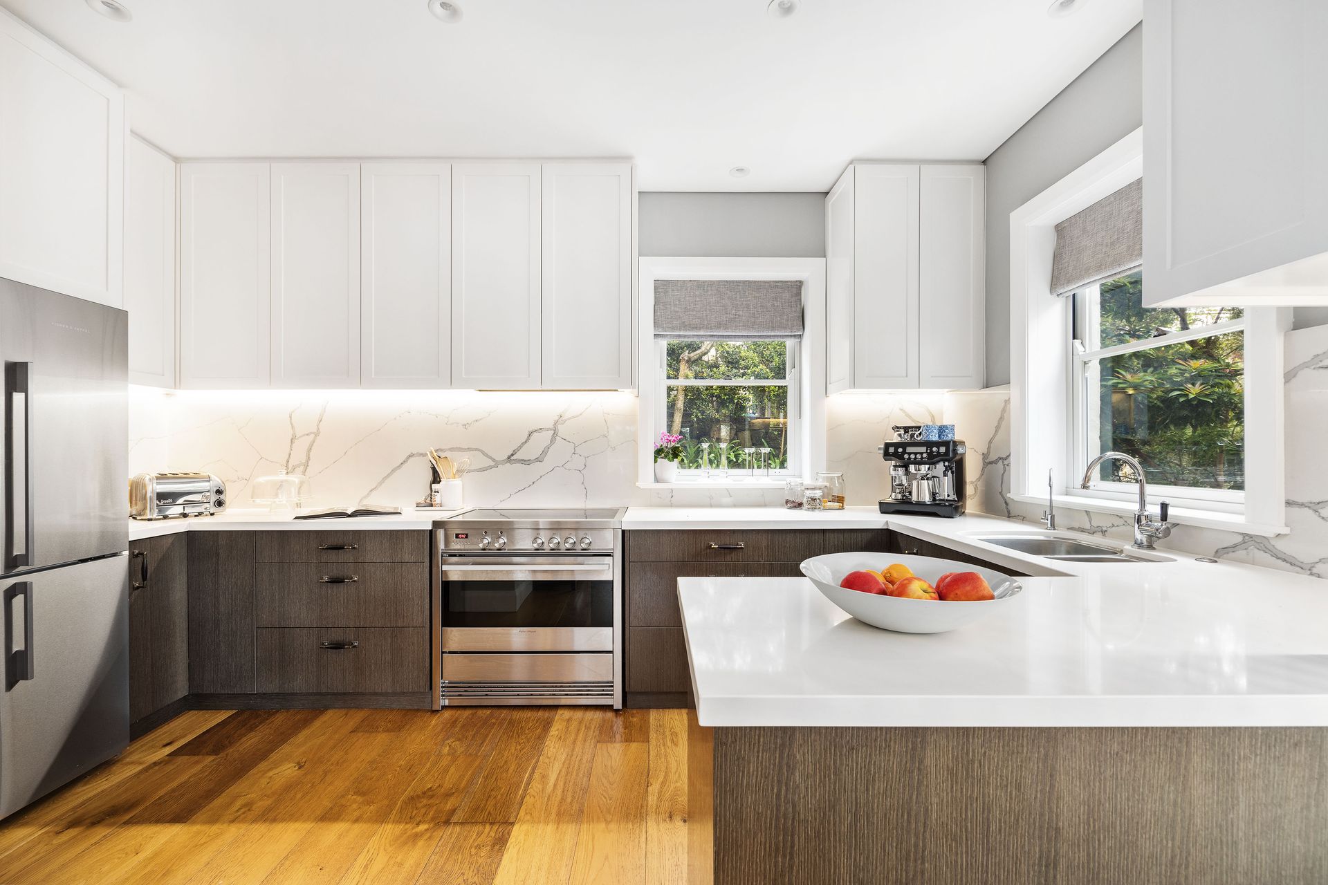 Welcoming in all day northern sun, stunning greenscapes are superbly framed through a series of picture windows. Immaculately presented, high-end upgrades bring an elevated standard of comfort to the home. Heated tiles warm the entry and the living level above. A gas fireplace anchors the refined living space along with a timeless colour scheme. Open plan in its design, the custom kitchen combines rich walnut veneer joinery with marble veined engineered stone in a perfect configuration maximising efficiency and storage.
