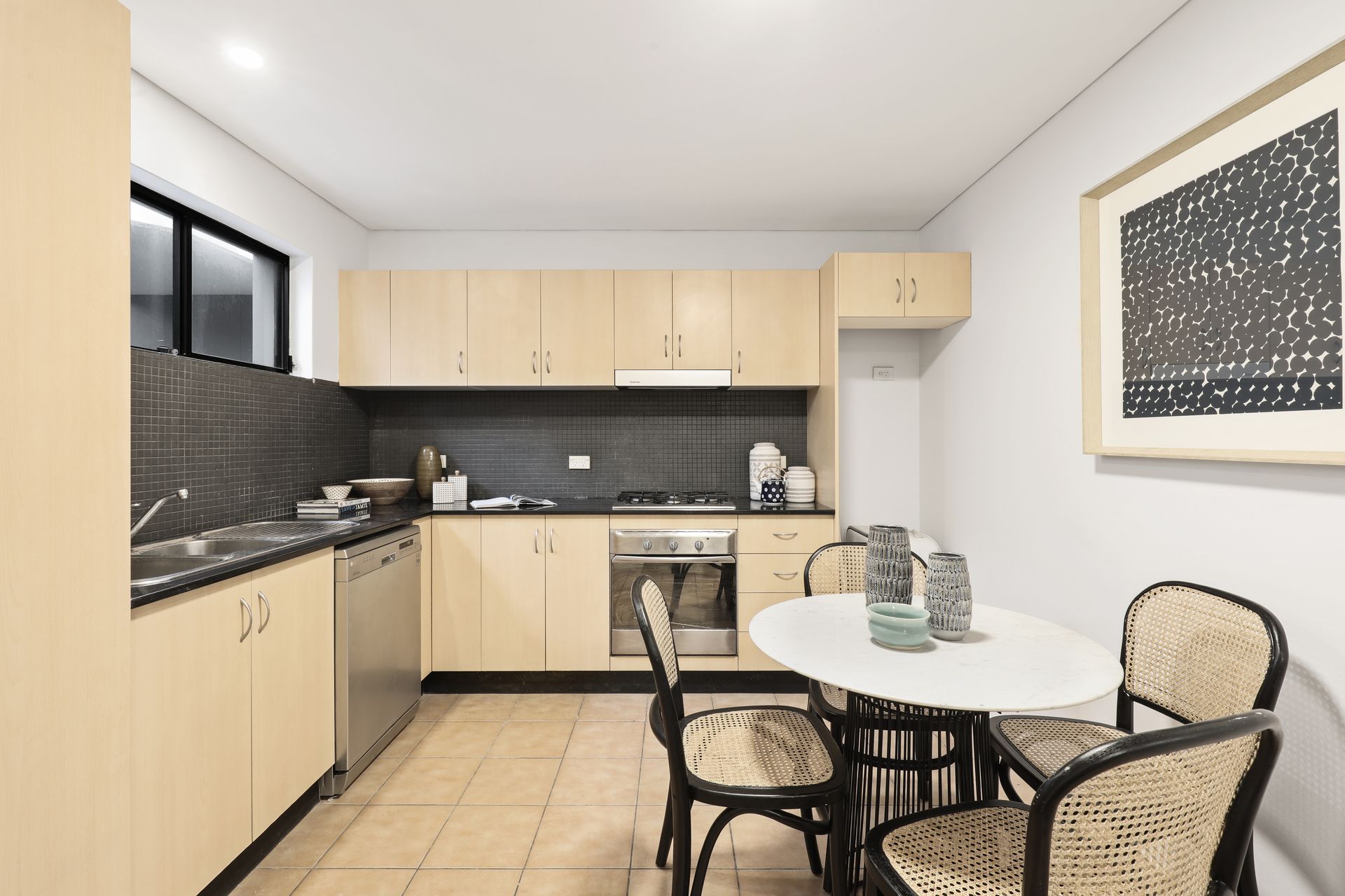 - Integrated stainless steel appliances, mosaic tile splashback