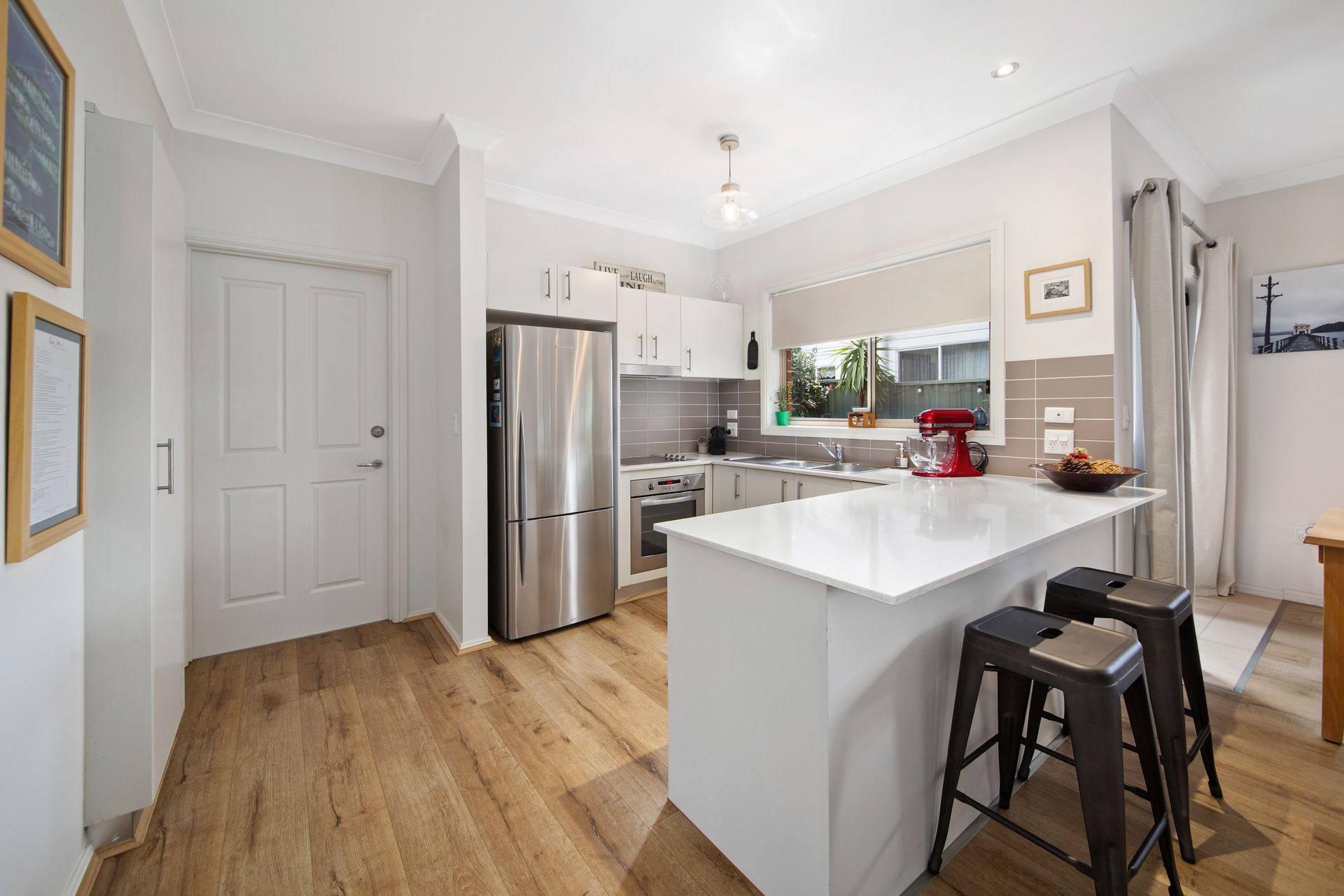 - Spacious open plan layout, timber floors, separate lounge and dining with split system air conditioning - Stone-finished kitchen with stainless steel appliances - Generously sized and carpeted master bedroom; built-in robes to both bedrooms - Newly renovated bathroom - Extra-large automatic single garage with internal access to laundry - Grassed front yard and beautifully maintained courtyard, ideal for entertaining, child's play area and pets - Conveniently located to shops, schools, cafes, childcare, golf course, Shark Park and transport