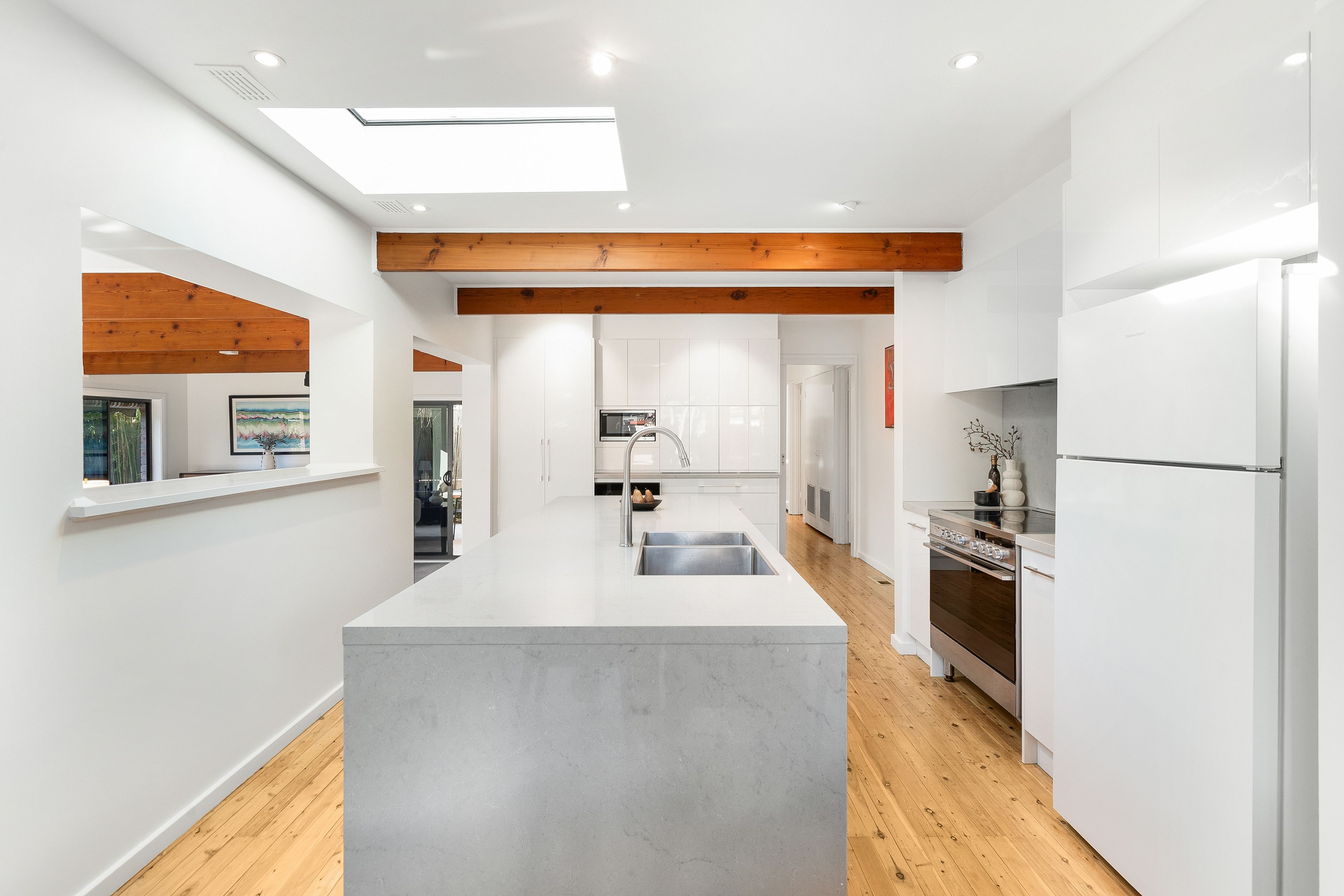 Step inside to a home completely reimagined for contemporary living. The spacious open-plan living and dining areas are bathed in natural light, flowing seamlessly from one to another. The gourmet chef's kitchen is a masterpiece of design and functionality, boasting high-end Fisher & Paykel, Qasair, and Franke appliances. The kitchen's oversized island with a breakfast bar is bathed in natural light from the skylight above. Natural timber floors and charming timber beams on the ceilings create a warm, mid-century modern aesthetic, while the updated bathrooms, featuring a BelBagno toilet, add a touch of luxury. The home is equipped with a highly efficient Daikin ducted reverse-cycle air conditioning system and added roof insulation for year-round comfort and energy efficiency.