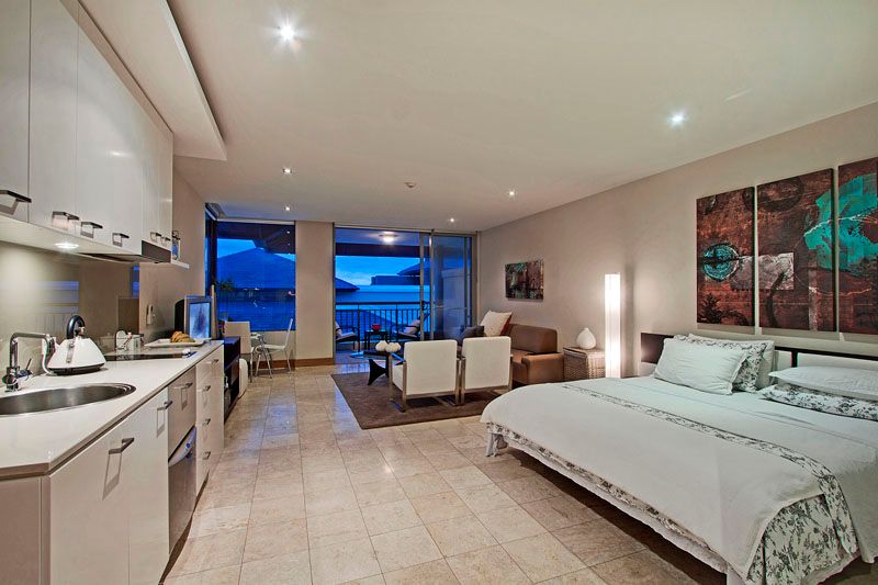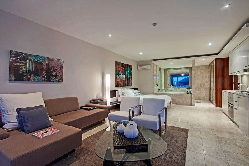 Each apartment mimics the Indonesian island's dominant earthy hues while capturing cooling ocean breezes and evoking meditative vibes through lush tropical backdrops. Glass sliders merge the open sleeping quarters, meals area and living space with a private poolfront balcony while the bathroom inspires personal indulgences and relaxation through a feature spa bath and a monsoon shower. The compact designer kitchen boasts all the mod cons of a house including stone surfaces, a cooktop, a microwave convection oven, a dishwasher drawer, feature lighting and glass splashbacks while a combined washer/drier is conveniently tucked away with laundry necessities.