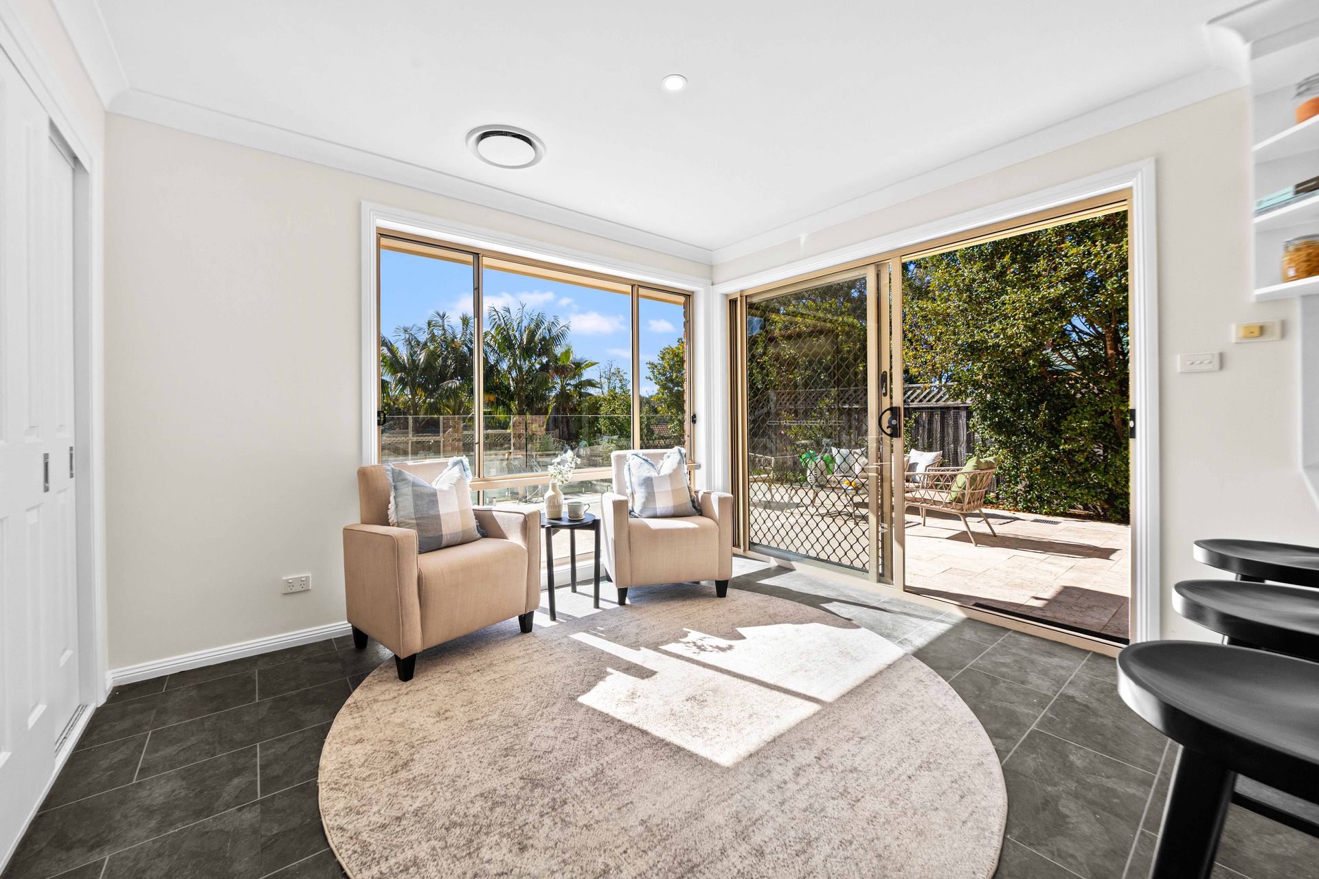 Intuitive indoor-outdoor entertaining leads a travertine-paved alfresco zone to a sparkling pool, soothed by the sounds of a waterfall and framed by leafy district views. Thoughtfully arranged bedrooms and bathrooms over both floors, invites easy guest accommodation paired with flexibility for growing families.