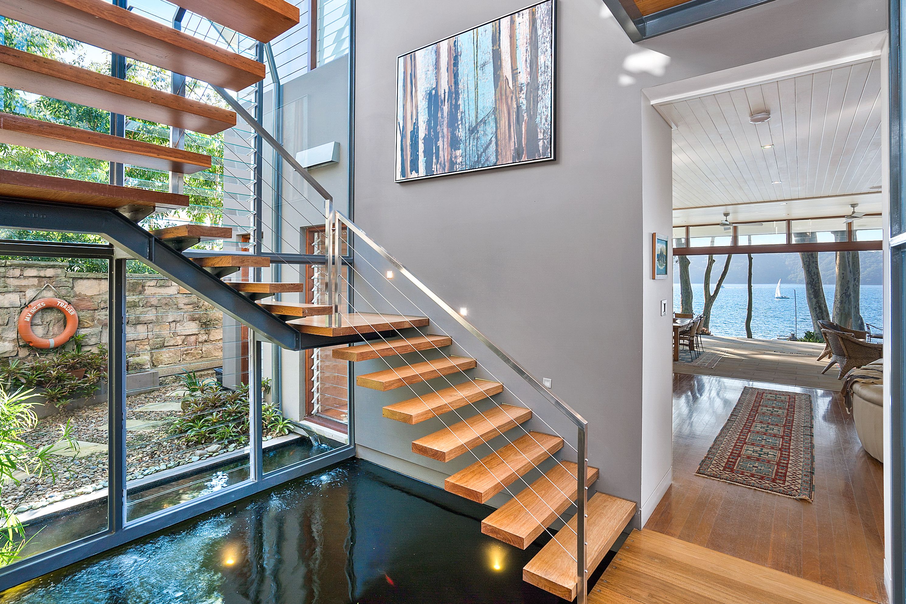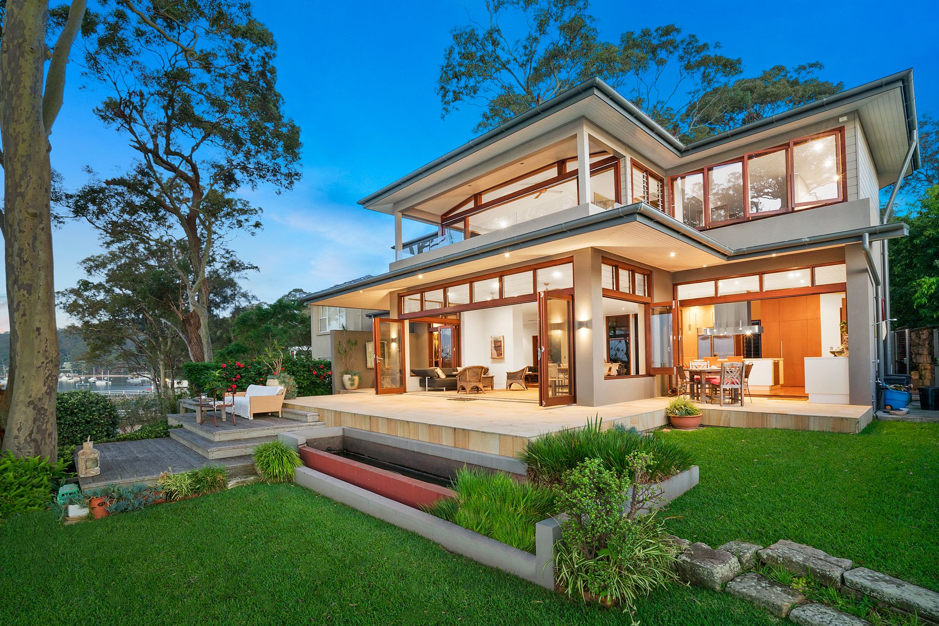 The tranquil landscaped gardens lead down a few steps to the beautiful boathouse and jetty. Waterfront living doesn't get any better than this.