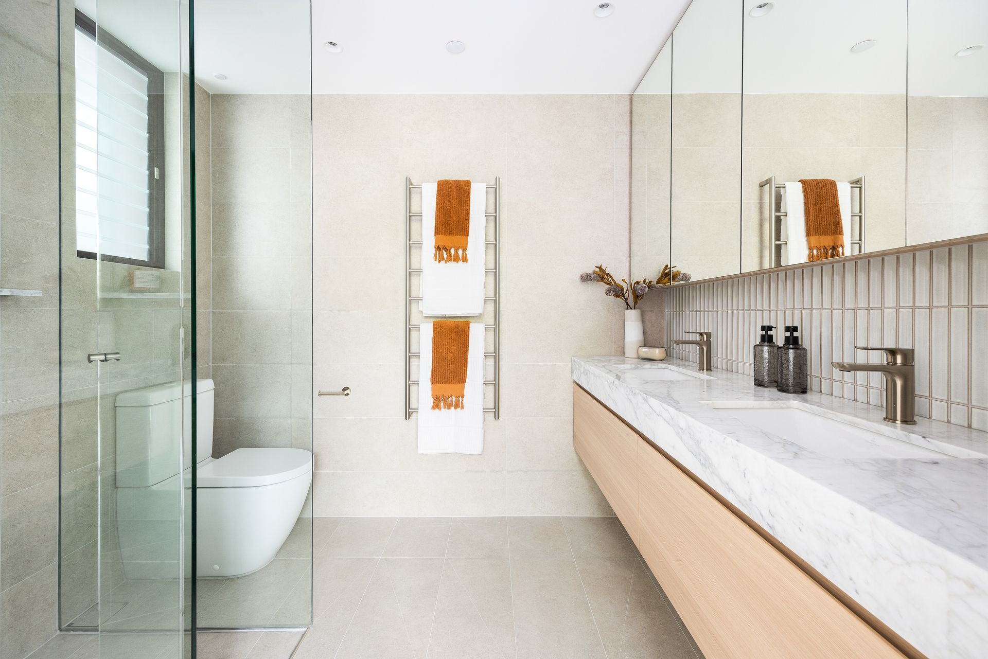 Bathrooms & Laundry • Bathrooms finished in premium Italian stone • Heated flooring and heated towel rails • Freestanding bath and frameless glass showers • Custom vanity joinery with mirrored cabinetry • Separate internal laundry with Miele washer and heat-pump dryer