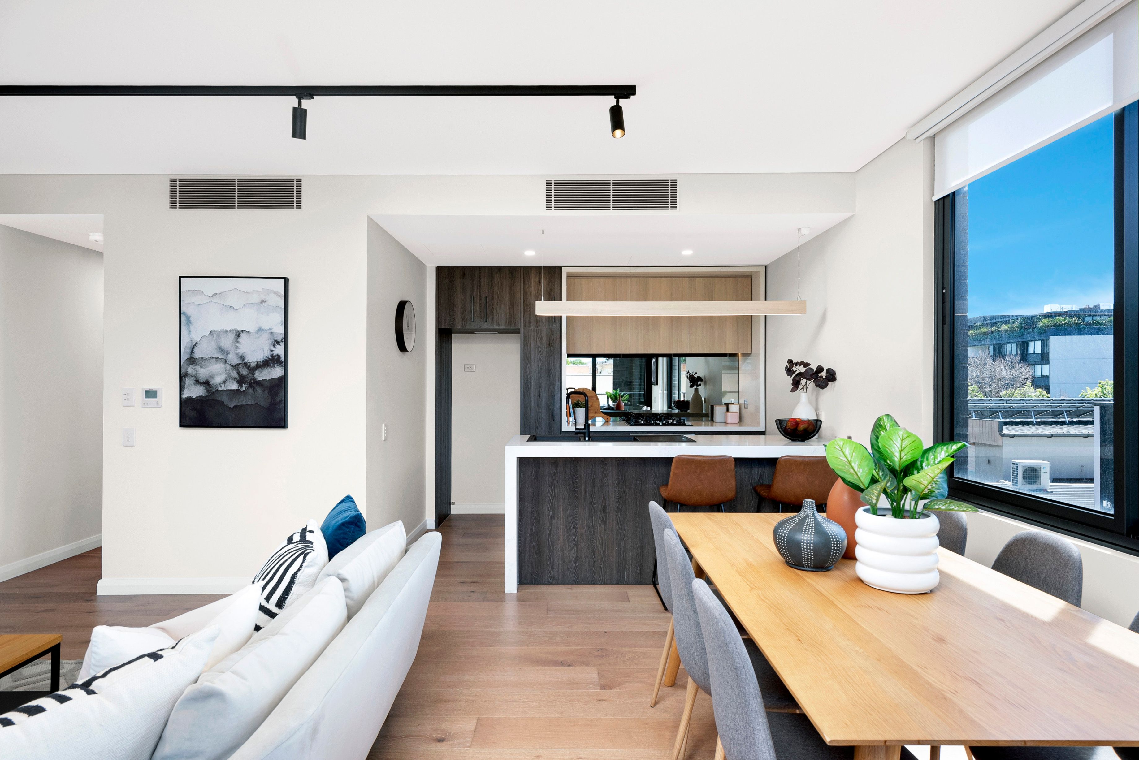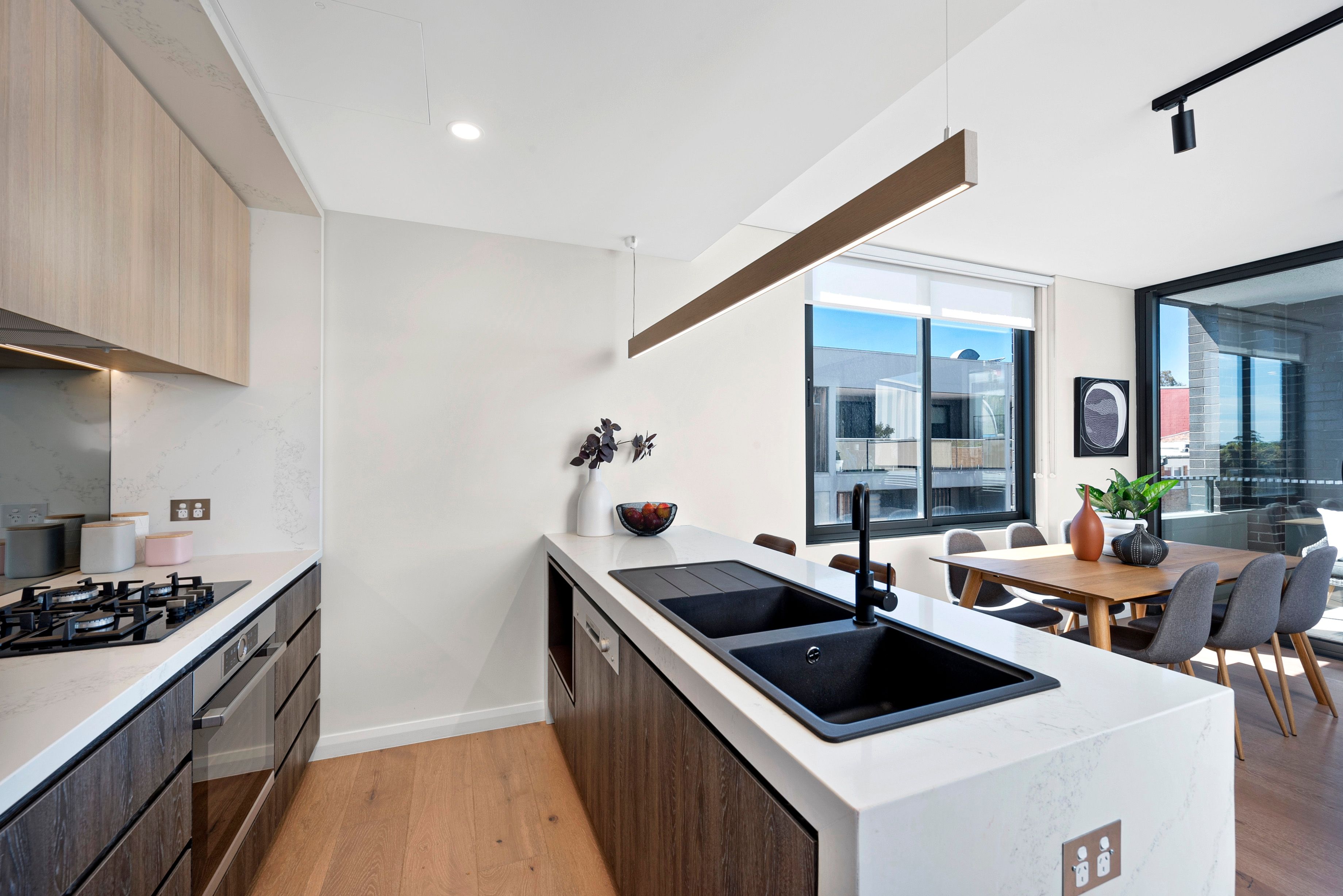 • Light filled living and dining with elegant timber floors extends to the expansive balcony • Bespoke stone kitchen with waterfall bench, dual Corian sinks and Bosch gas appliances • Stylish, fully tiled bathrooms feature frameless walk in shower with rainwater head • Two generously sized bedrooms with built-in's, master with ensuite and balcony • Zoned, ducted air conditioning, video intercom, lift access, laundry cupboard • On title car space in basement parking, 250m to highly anticipated Metro station