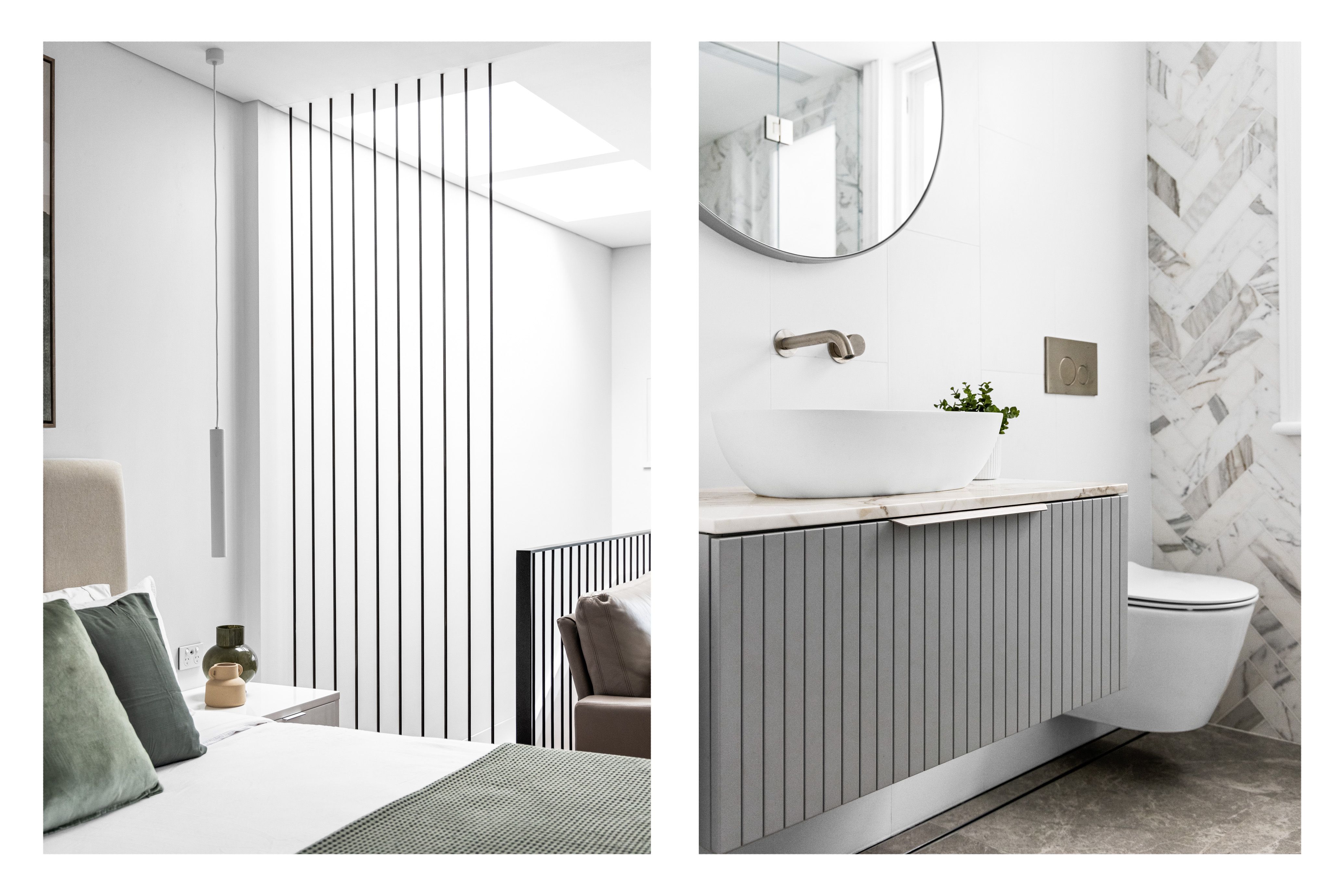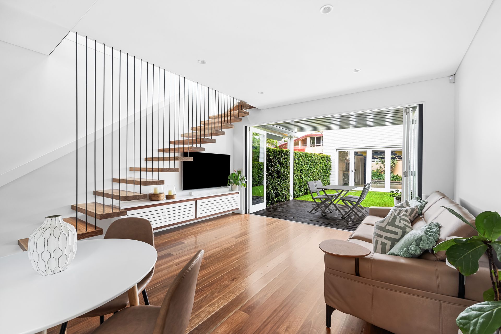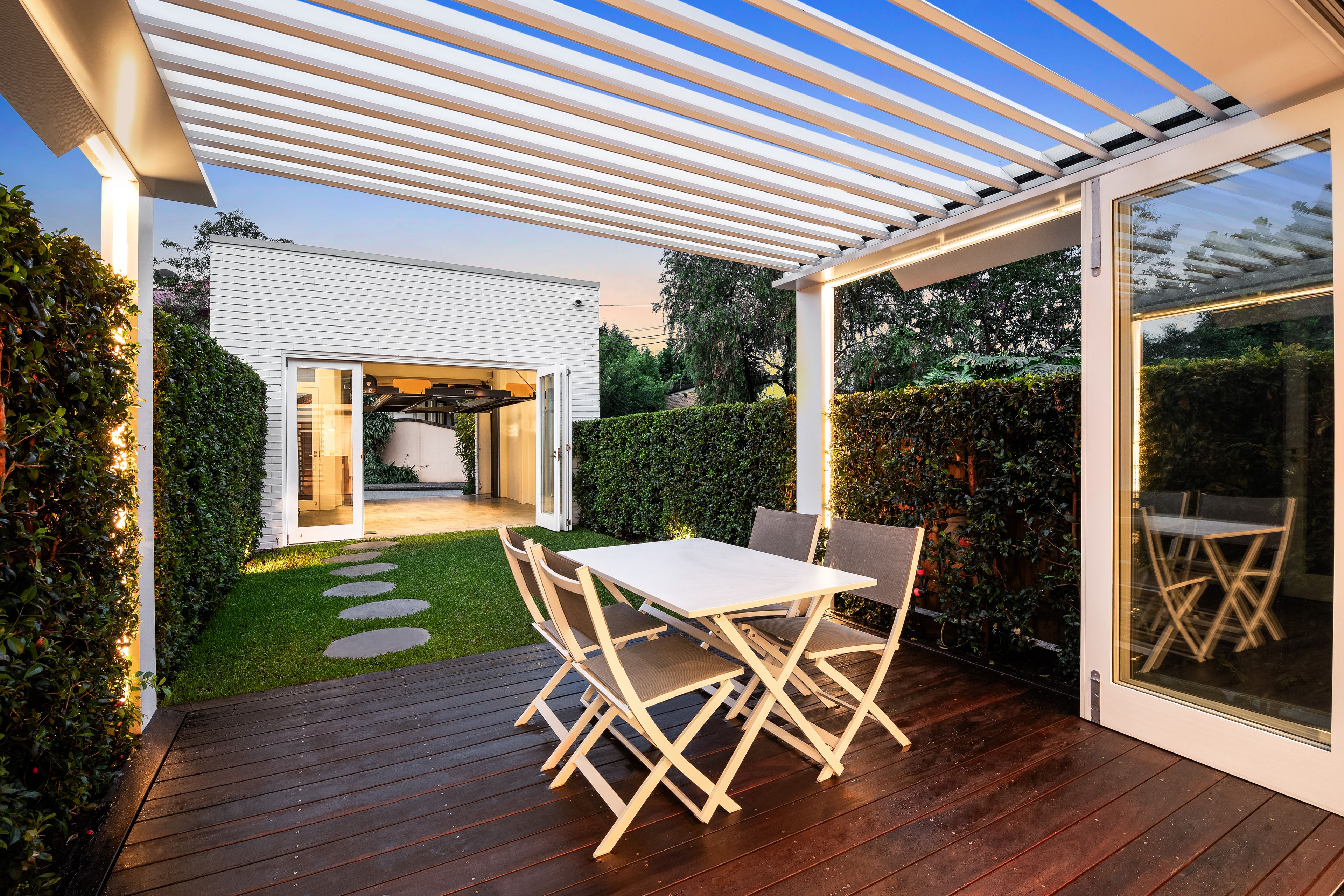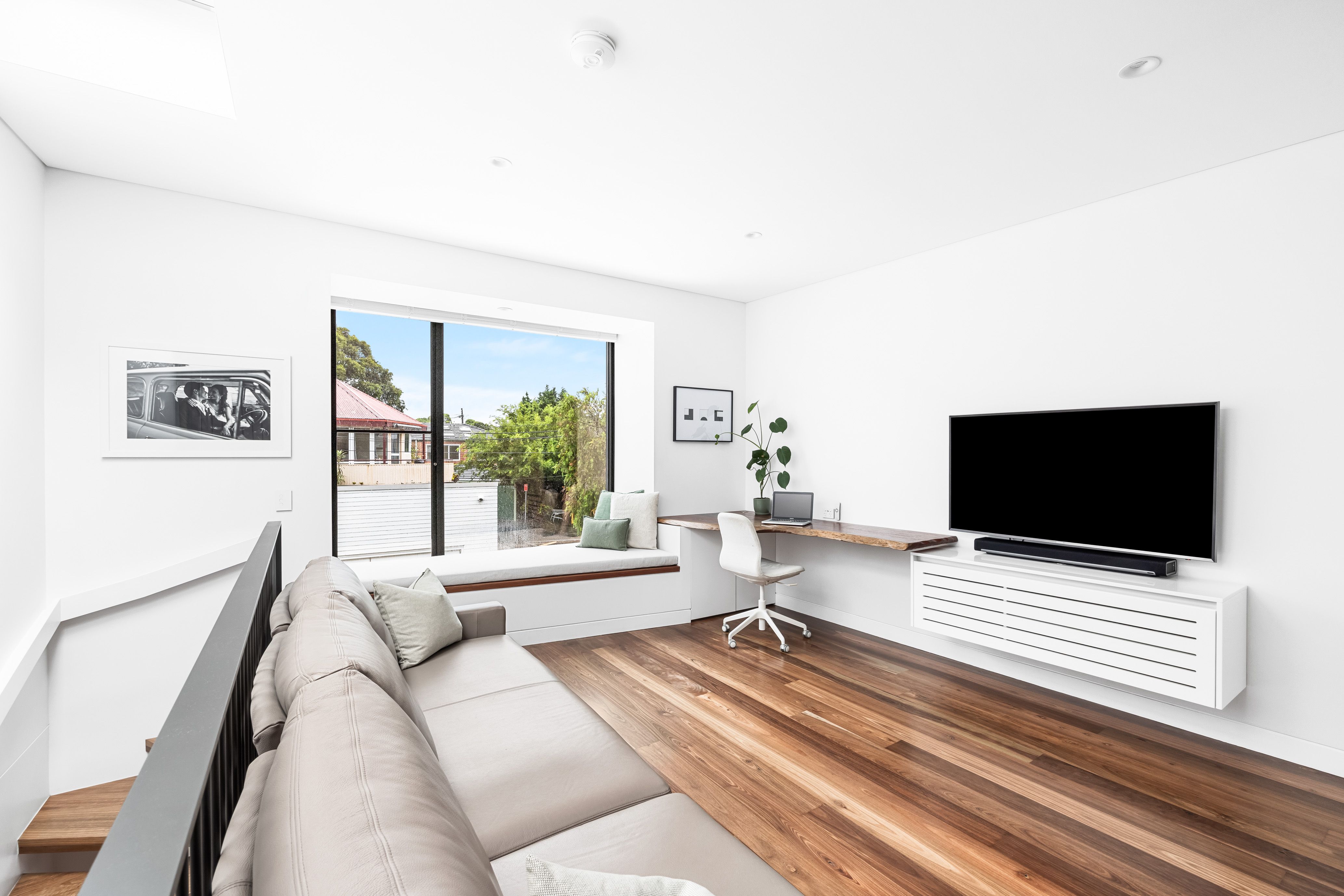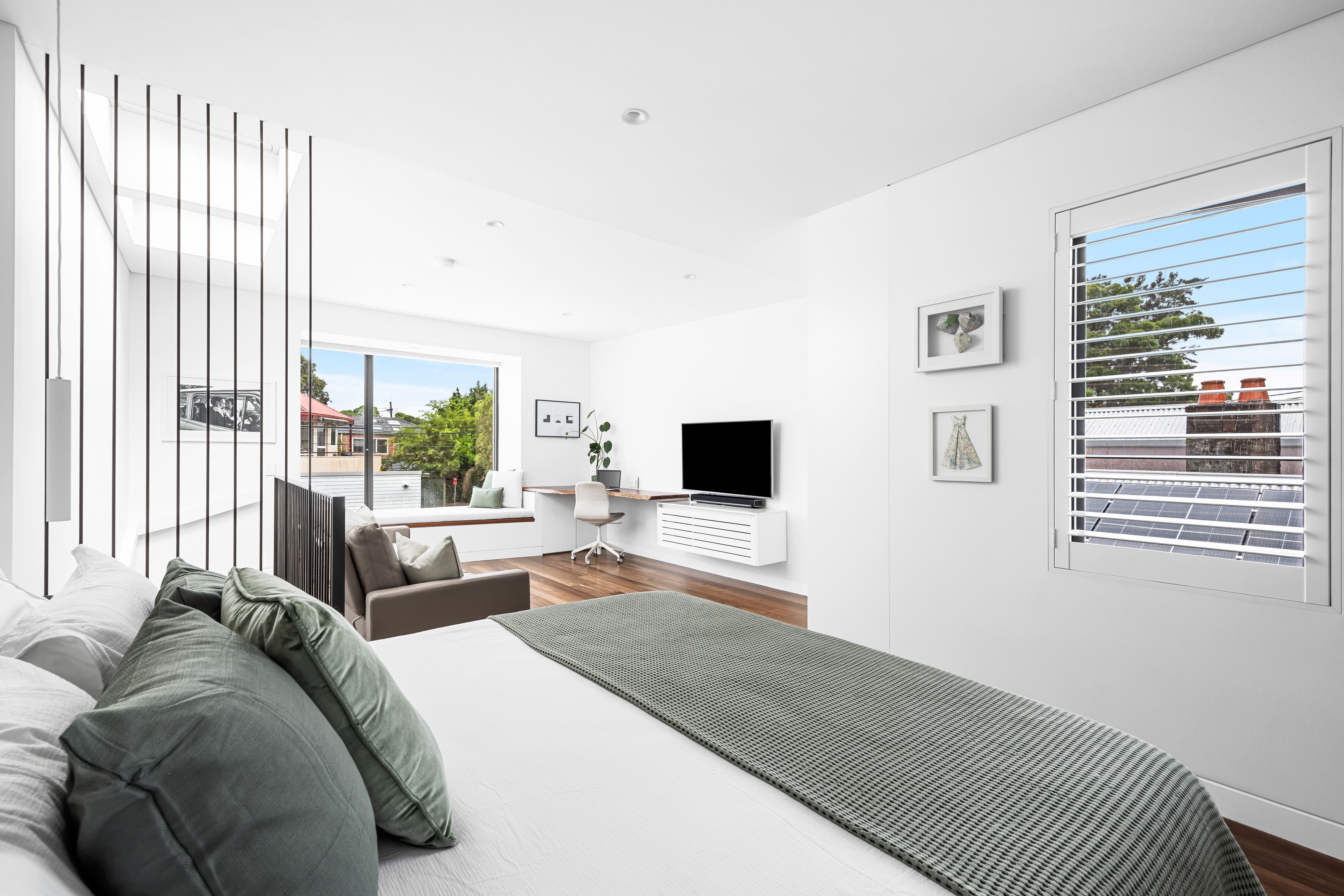 The spectacular transformation continues inside through streamlined yet timeless design choices. A finely crafted holistic renovation ensures a superior level of quality and comfort throughout. Opening to the north through a wall of bi-fold doors, natural light is effortlessly filtered inward across both levels. A strategic fixed window sits above an upholstered daybed in the whole floor parents' retreat next to an open study personalised by a striking repurposed Red Gum timber desk.