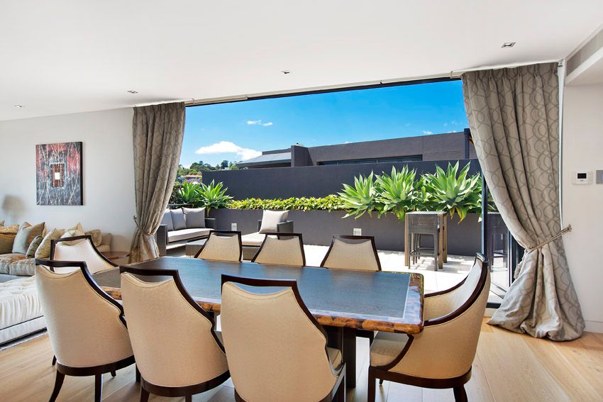 Encompassing a chic CaesarStone Miele gas kitchen, the generous sun-soaked entertaining space is framed by bi-folding doors opening to an expansive alfresco terrace for effortless indoor/outdoor living.