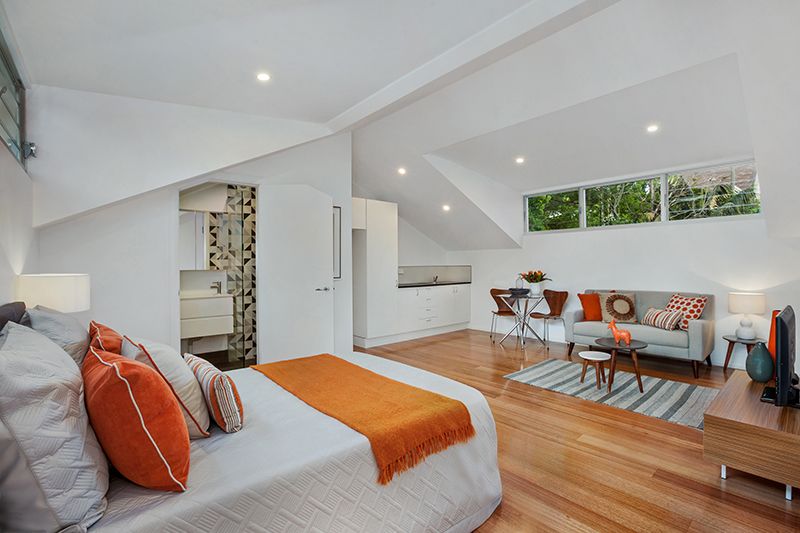 Self-contained studio with private rear entrance Large open plan design with hardwood flooring Sheltered barbecue deck and private grassed garden Additional living area or fourth bedroom Upper-level parents' retreat with ensuite and study Double garage with auto access from the rear lane Ducted air-conditioning, alarm security, attic storage