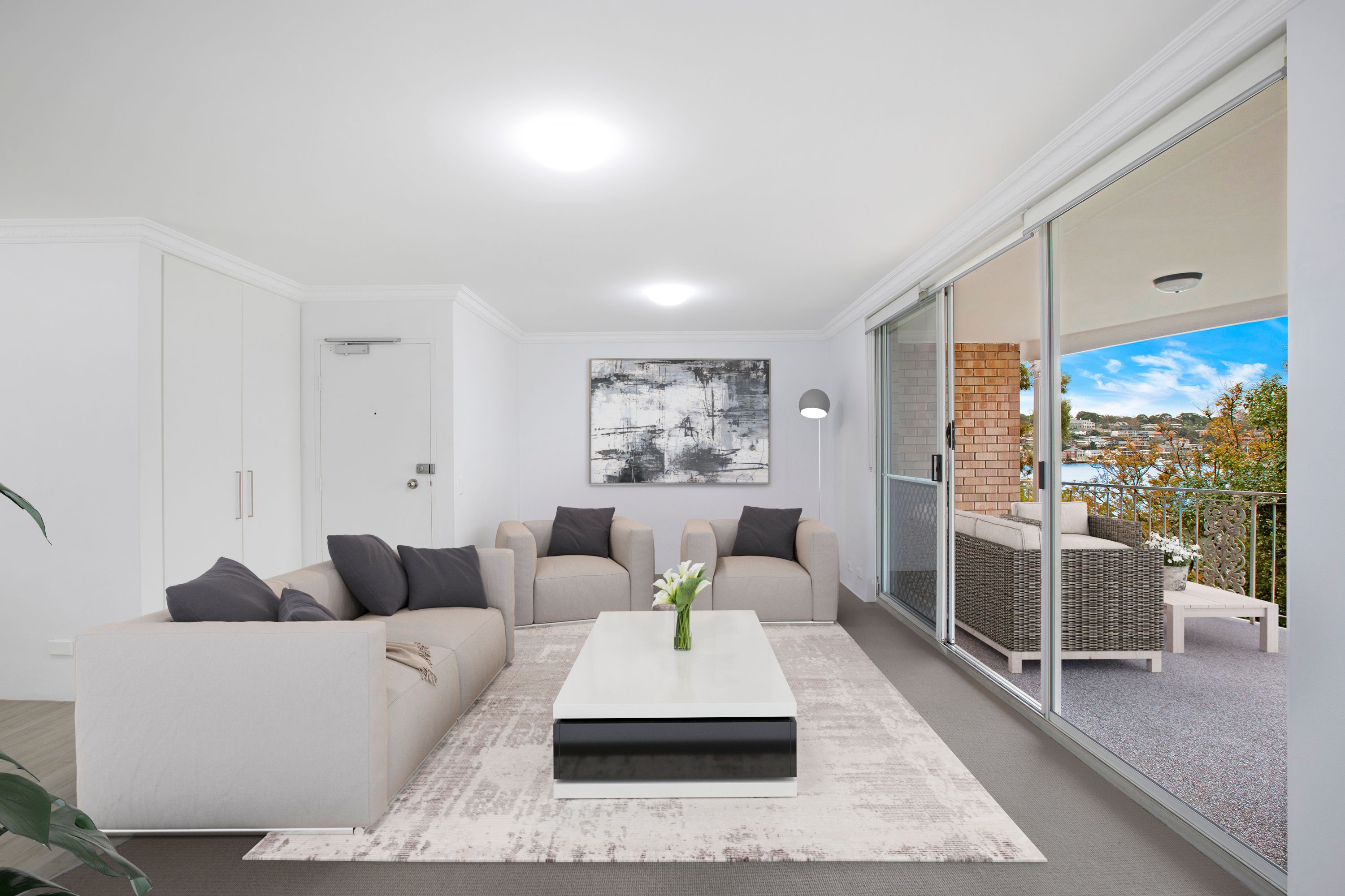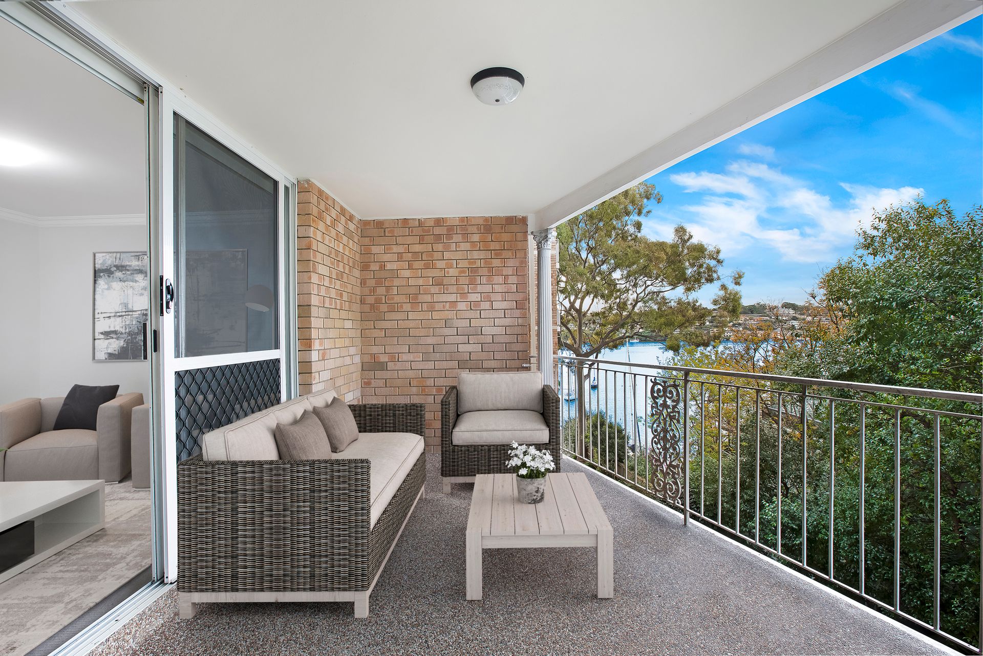 • Level access and interiors basking in northern sunlight • Living flows to entertainment terrace with water views • Neat kitchen, full bath and a separate internal laundry • Two bedrooms with built-ins, master also has an ensuite • Large open study with second balcony • Lock-up garage, communal gardens to the water's edge