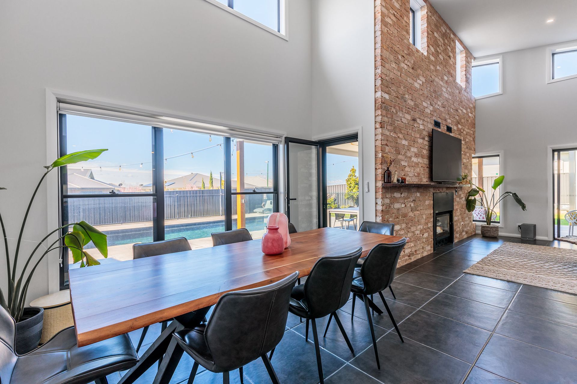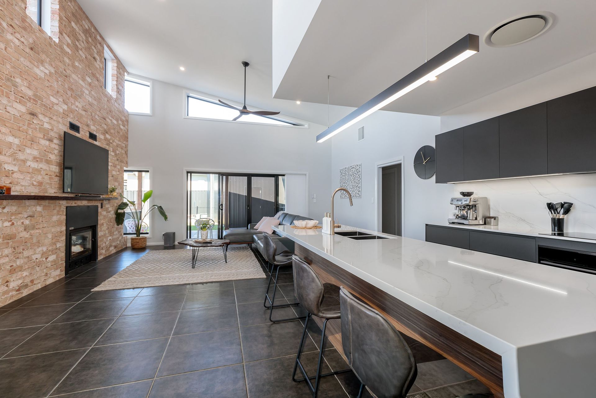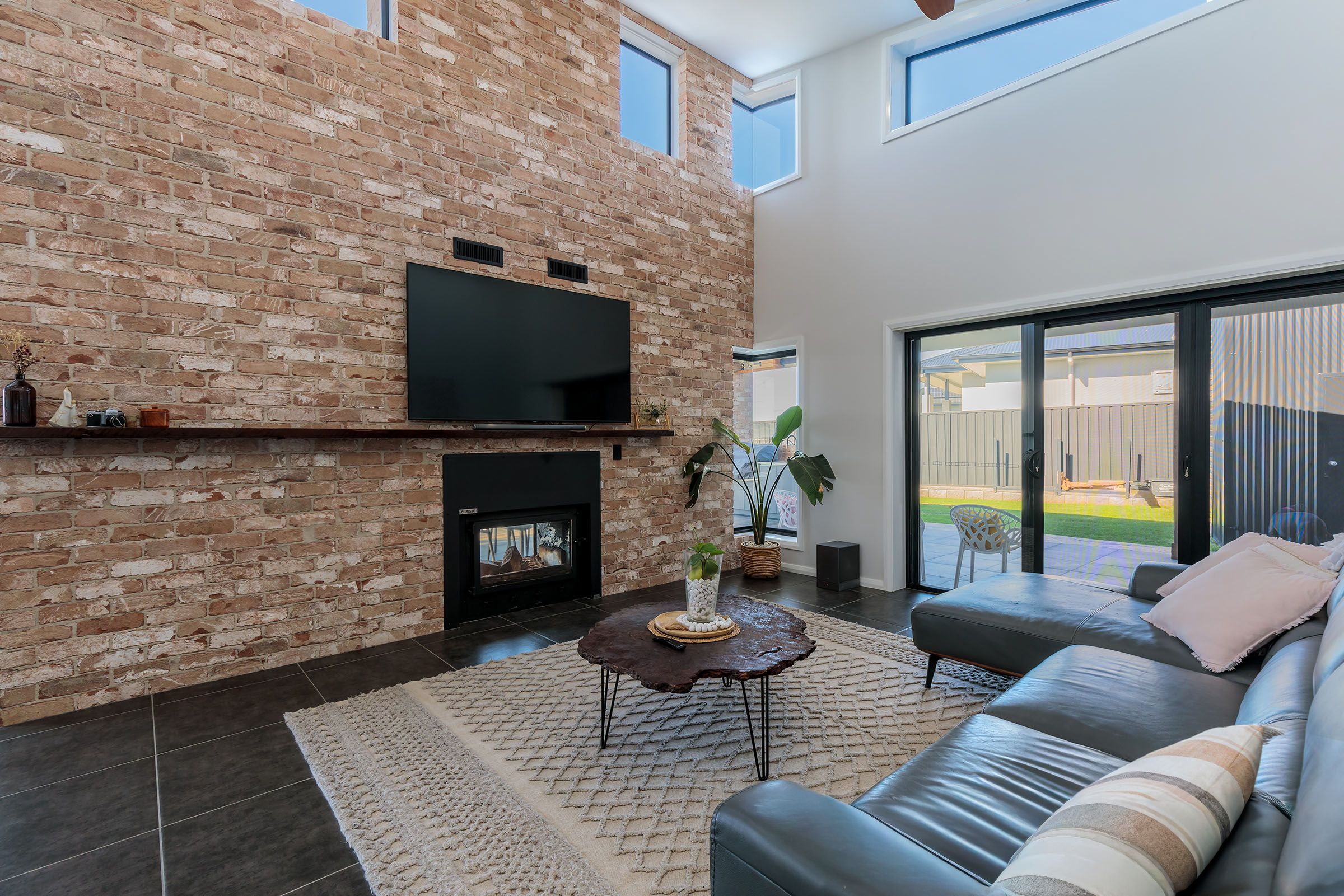 From the moment you step inside, you'll be struck by the soaring raked ceilings and stunning recycled brick feature walls, framing a light-filled open-plan living area that feels both spacious and inviting. At its heart sits a double-sided wood fireplace, bringing warmth and character to both the indoor living space and the adjoining alfresco area - a seamless fusion of indoor and outdoor living.