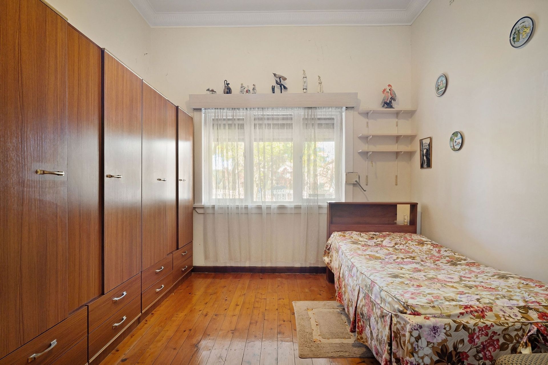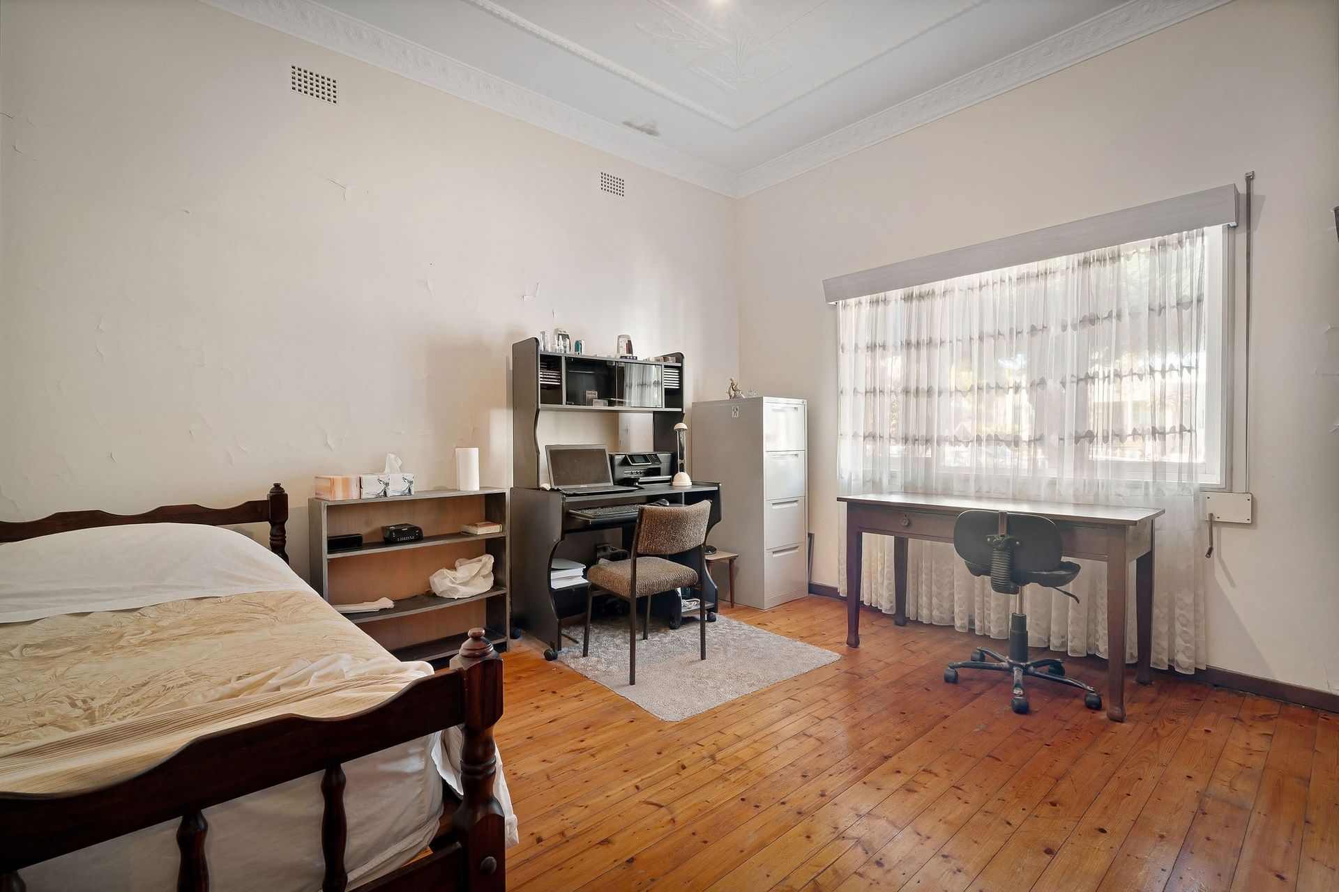 Features Include: - Three spacious bedrooms each filled with natural light and featuring high ornate ceilings. - Multiple living zones including a formal lounge, dining area, and a versatile study or additional sitting room - Original kitchen with ample cabinetry and a charming retro design, the perfect canvas for a stylish modern update - Neat and functional bathroom with classic tiling and a combined shower/bath. - Expansive backyard with level lawns, mature fruit trees, and a garden shed. - Wide side driveway leading to a lock-up garage and additional off-street parking. - Period details including decorative ceilings, timber flooring, and vintage light fittings that add warmth and character throughout.