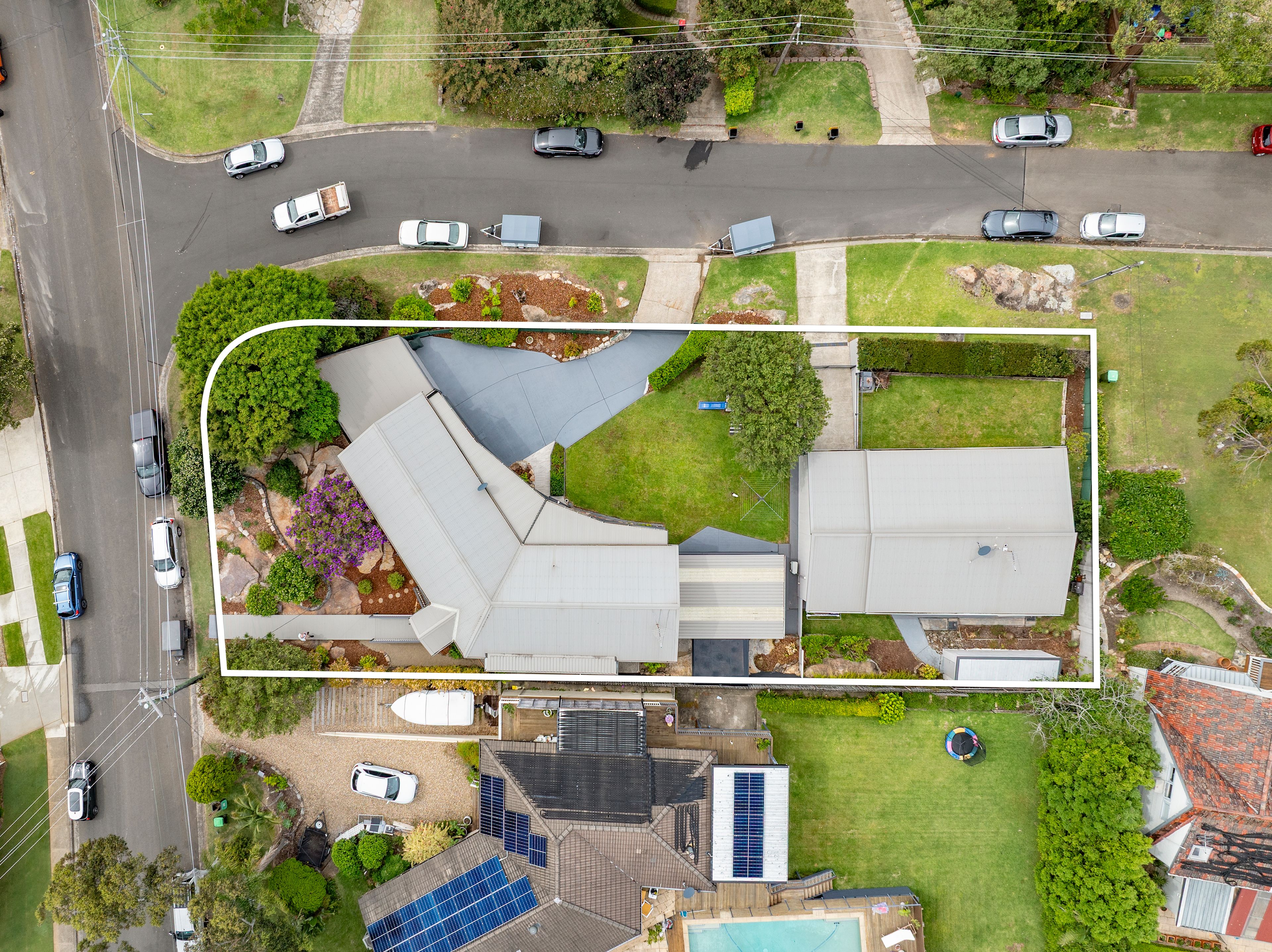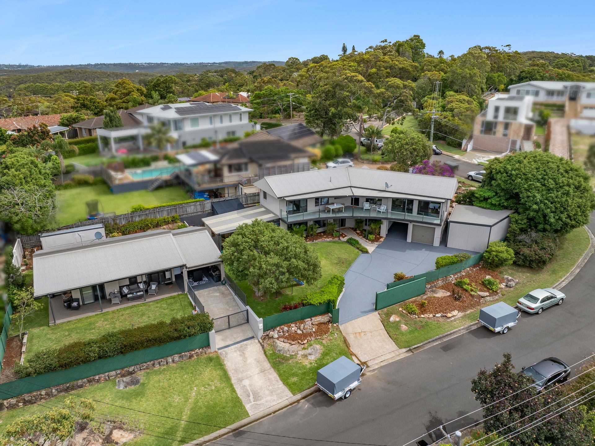 As unique as it is spectacular, this superbly designed and appointed dual-level residence offers versatile living options for multigenerational families, and it comes complete with a separate fully approved self-contained two-bedroom cottage with a flexible utilities room being used as a 3rd bedroom & its own private street address. Showcasing expansive leafy district views and ocean panoramas from both residences, the main house is double-brick and features bright open living and dining spaces flowing to a sun-drenched northeast ocean-view terrace and a sleek stone kitchen. The lower-level retreat area with a living space, bedrooms, a bathroom and a kitchenette flowing to an oversized alfresco outdoor living area offering flexible options for extended families or extra income. Set on 1,069sqm in a private corner position with enclosed, near-level sunlit lawns and landscaped gardens, it is only metres to the prestigious Elanora Country Club, a five-minute stroll to Elanora Heights Village and minutes to schools, Warriewood Square and beaches.