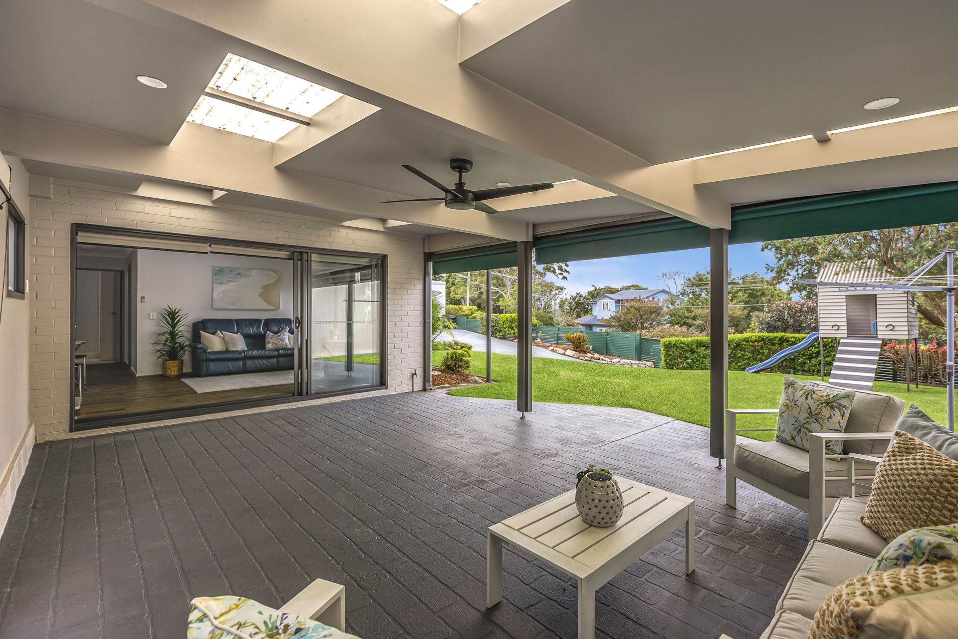 • Sweeping covered northeast entertainers' terrace • The main house is double brick • Oversized alfresco outdoor entertainment area • Beautifully landscaped tropical garden surrounds • The cottage has a carport and a lock-up storeroom • An ocean-view terrace extends from the cottage • Both dwellings have private enclosed lawns • Electronic gates access the lawn and parking • An enormous storage shed sits next to the garage • Auto double lock-up garage with internal access