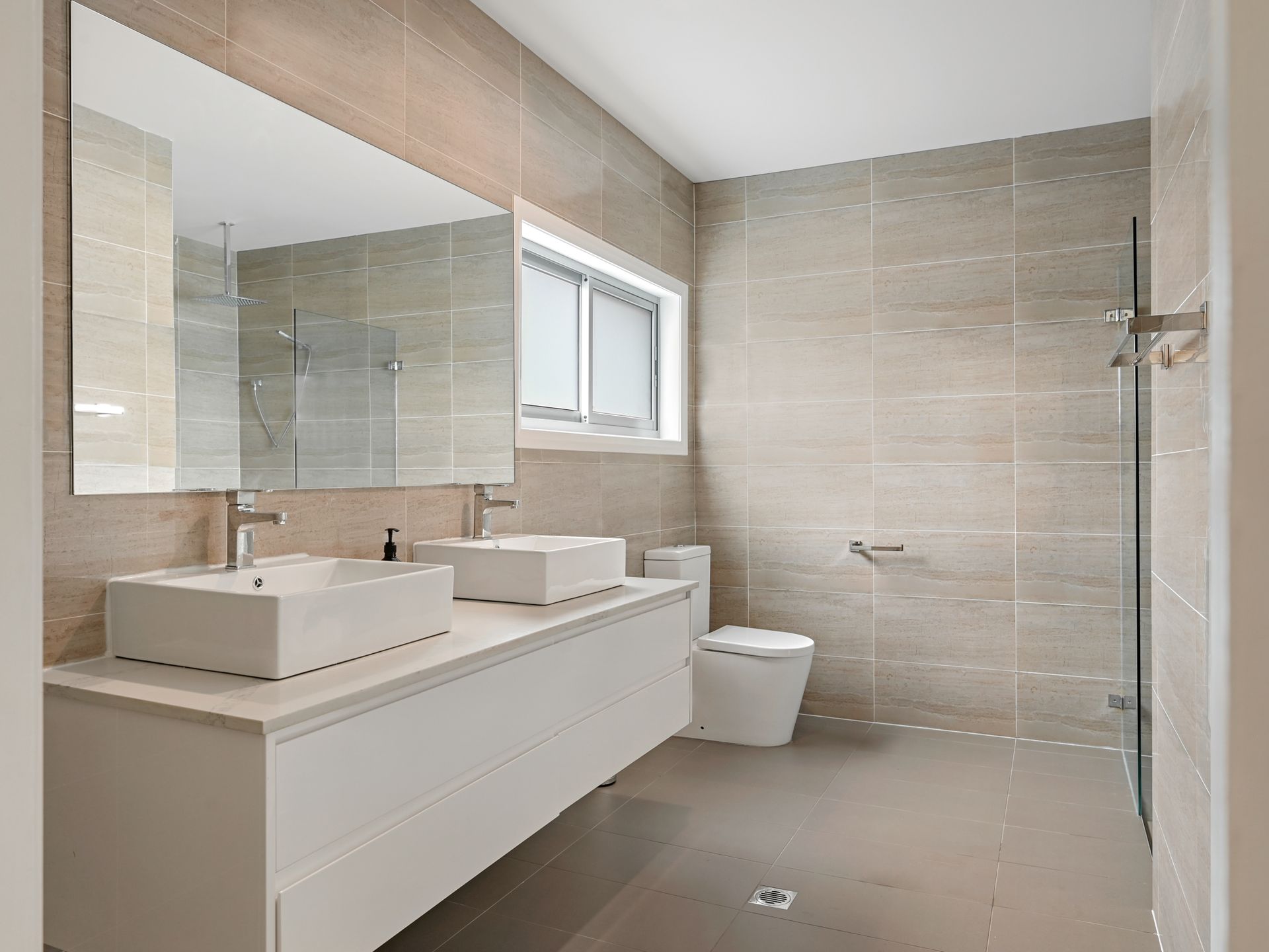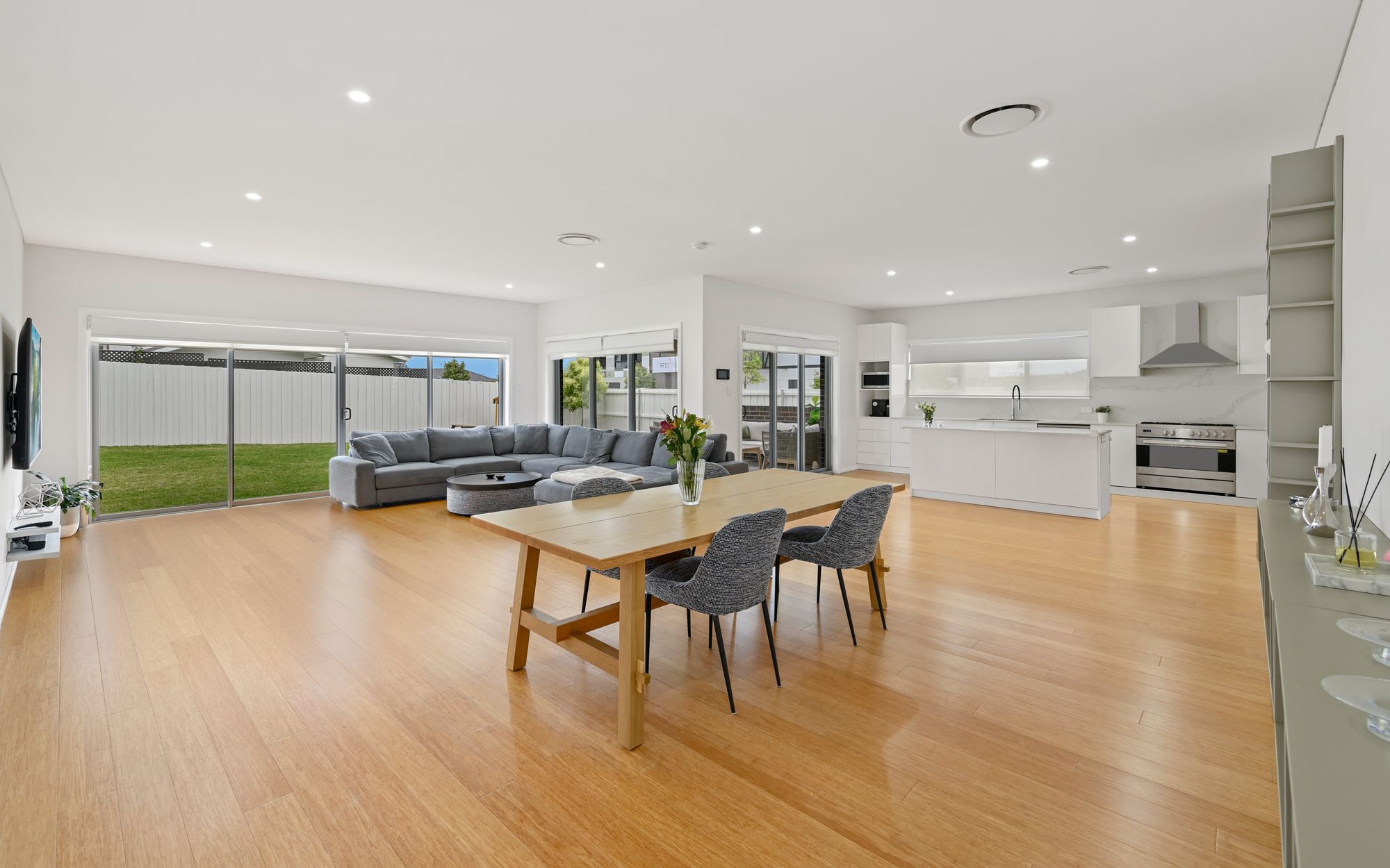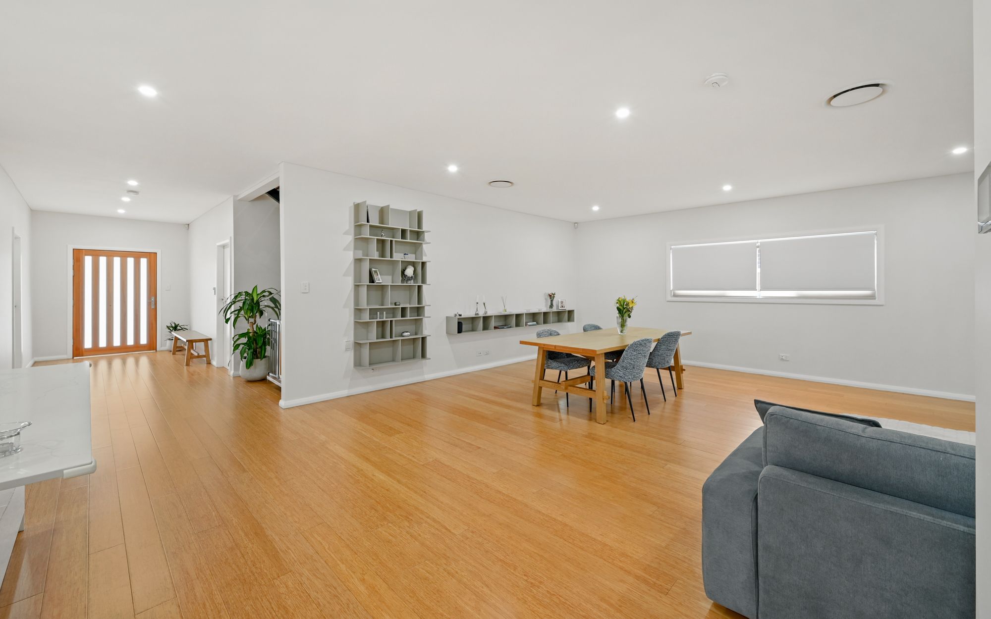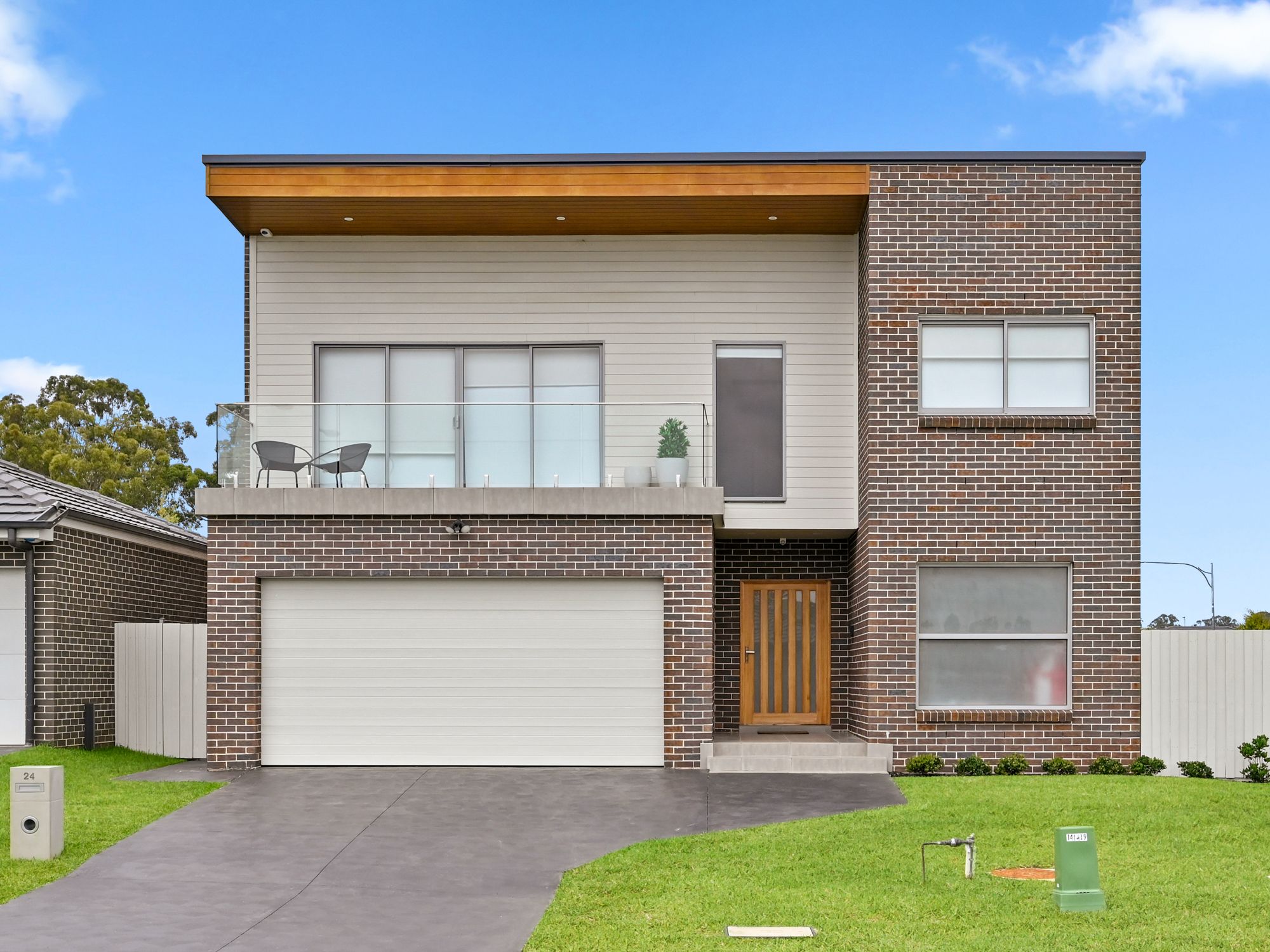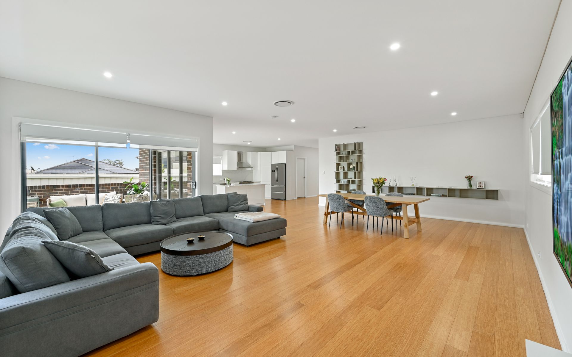 Stand out from the crowd with this one of a kind contemporary masterpiece. Set on a generous 472sqm corner block and utilising the available land very well this large family home boasts a long list of high level inclusions. From the time you step across the 1200mm threshold you notice the tall ceilings, shadowline cornices and bamboo flooring which all allow for a flood of light through the home. This home features a full sized downstairs bathroom and a downstairs utility room which could be used as a bedroom, TV room, study or play room. The open plan kitchen, dining and family room flows seamlessly onto the alfresco area and backyard. The kitchen itself features stone benchtops, quality 900mm stainless steel appliances, and a practical breakfast bar built into the island bench. A set of elegant solid timber floating stairs takes you to the upstairs bedrooms and living area. All the bedrooms and bathrooms upstairs are very generously proportioned and will impress the fussiest of buyers. The master suite features its own balcony which provides sweeping views of the region. The ensuite features a double basin, wall hung stone vanity. Floor to ceiling tiles and an oversized shower recess. The main bathroom also features a double basin, wall hung stone vanity, floor to ceiling tiles and a full sized free standing bathtub. A sunlit upstairs living room provides the perfect retreat for the whole family and completes this perfect family home. The flat and clear backyard would be perfect for a swimming pool and the corner block has potential for side access from the side street. Other features include: -Ducted Air Conditioning -Ducted Vacuum System -Oversized 6mx7m garage -Alarm system -Security System -Tall ceilings -LED Downlights Located: -30m to Petit Early Learning Preschool -800m to Elderslie Public School -1.6km to Elderslie High School -1.6km to Medical Centre -2.6km to Narellan Town Centre -11km to Campbelltown Train Station