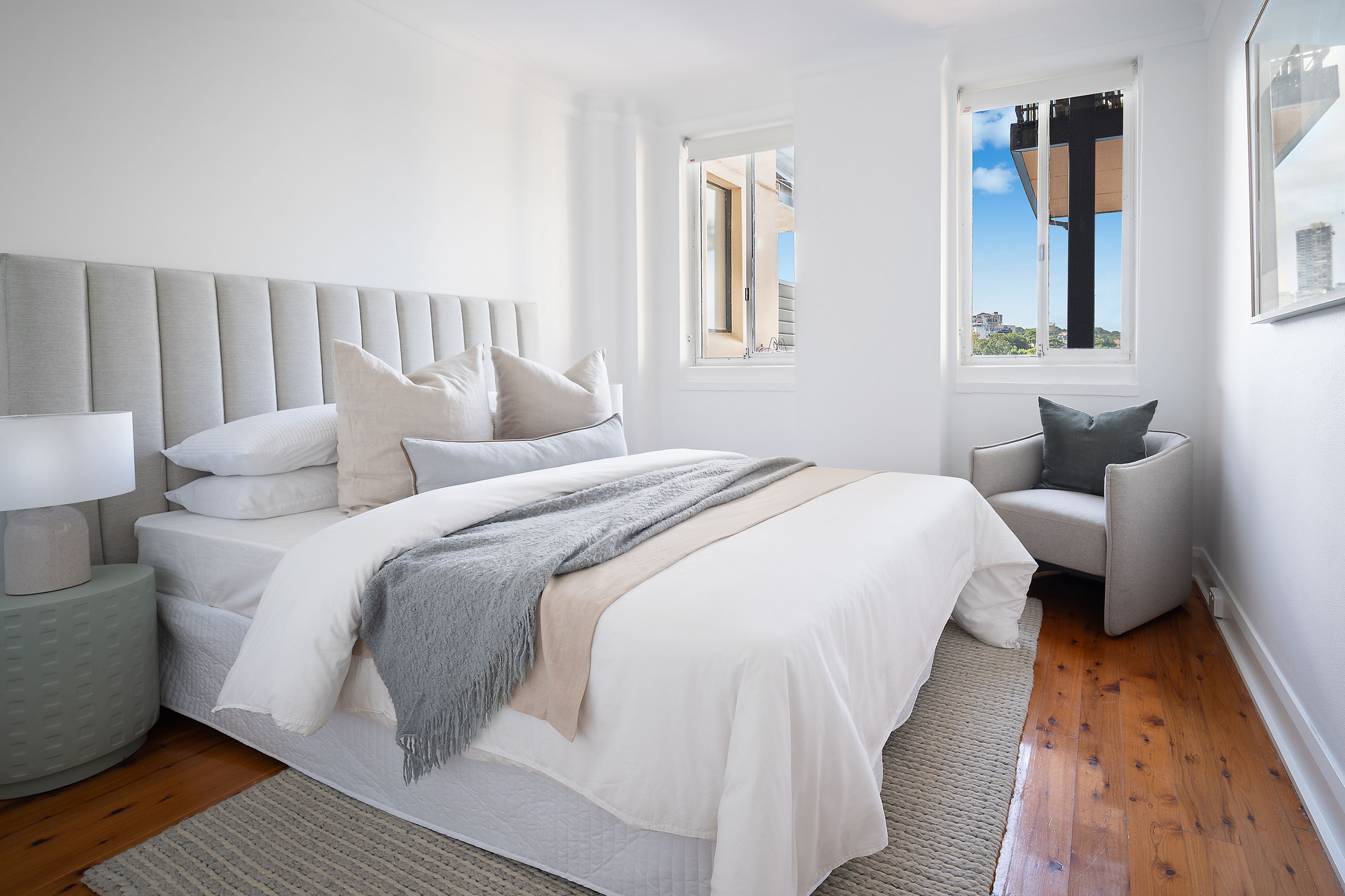 - 1 Large bedroom, 1 spacious bathroom - Generous proportions, sun-soaked interior living areas - Picturesque views across the boat-filled bay - Stairs down to a private waterfront garden - Flows out to rare, oversized entertaining deck - Sizable bedroom with double built-in wardrobe - Sleek gas kitchen serves directly to the deck - Secure building set back from road, intercom