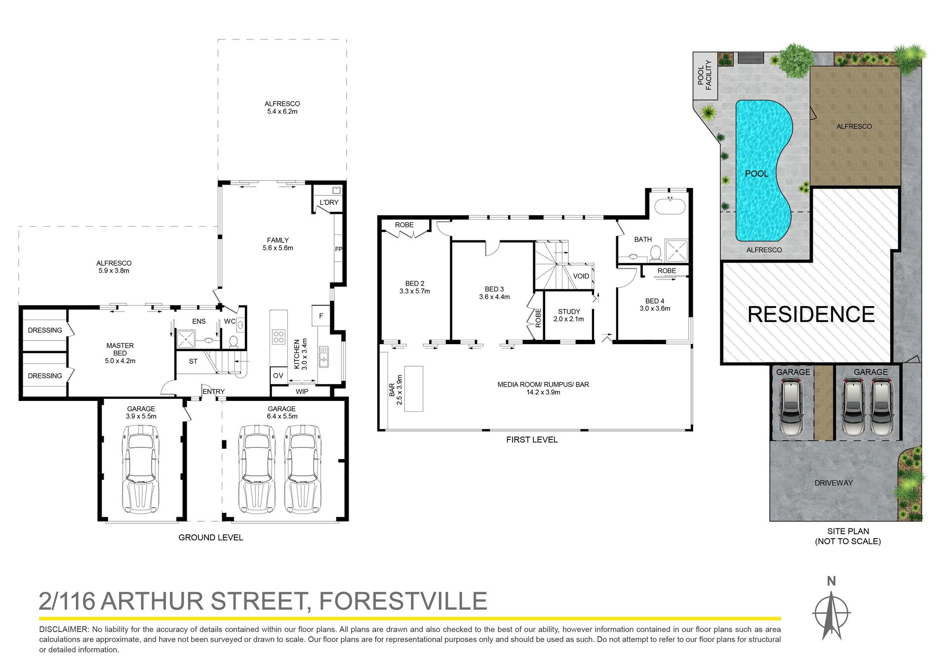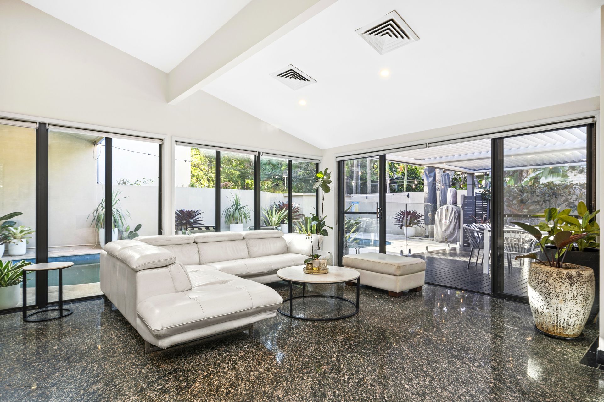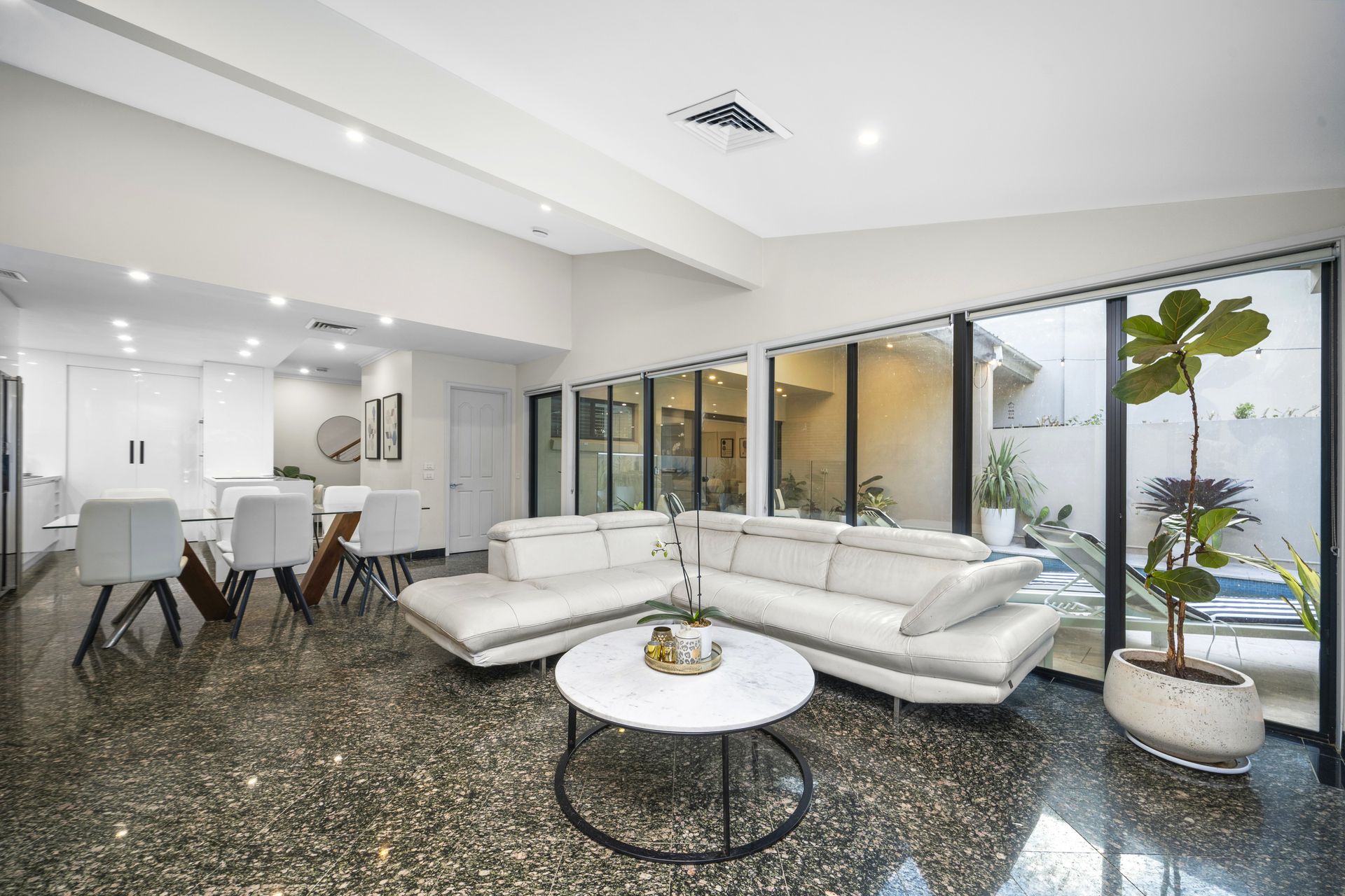 • Perfect north to rear aspect, home is privately walled and secure. • Spacious living and dining rooms, walls of glass open to the pool. • Covered alfresco terrace, solar heated pool, superb granite floors. • Deluxe stone induction kitchen, downdraft exhaust, two ovens, a/c. • Smeg appliances, gas fireplace, walk-in pantry, two way powder. • Ground floor master with ensuite and pool access, home office. • Over-sized bedrooms, robes, immense rumpus/games with bar. • Ample storage areas, triple lock up carport plus lock up garage.