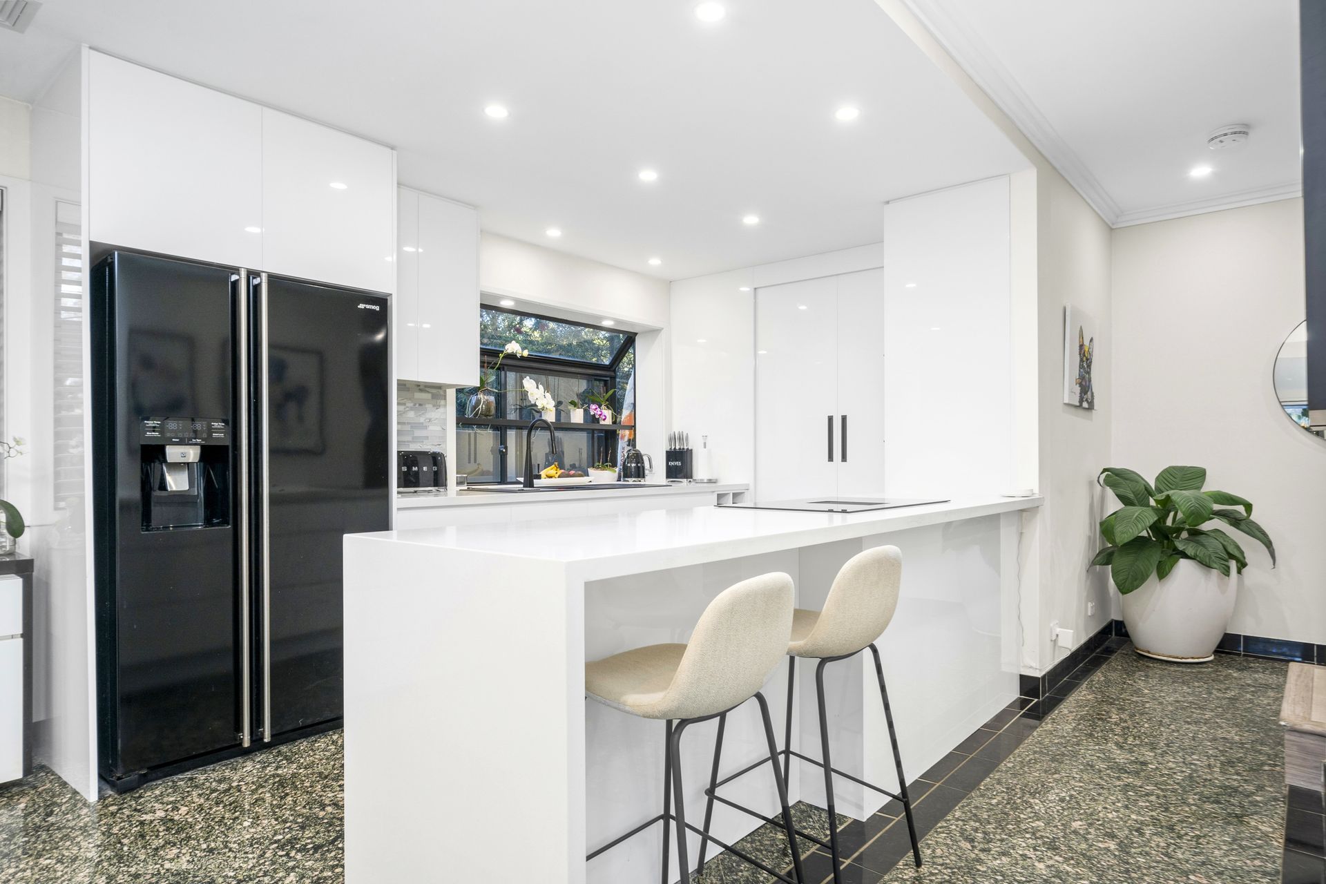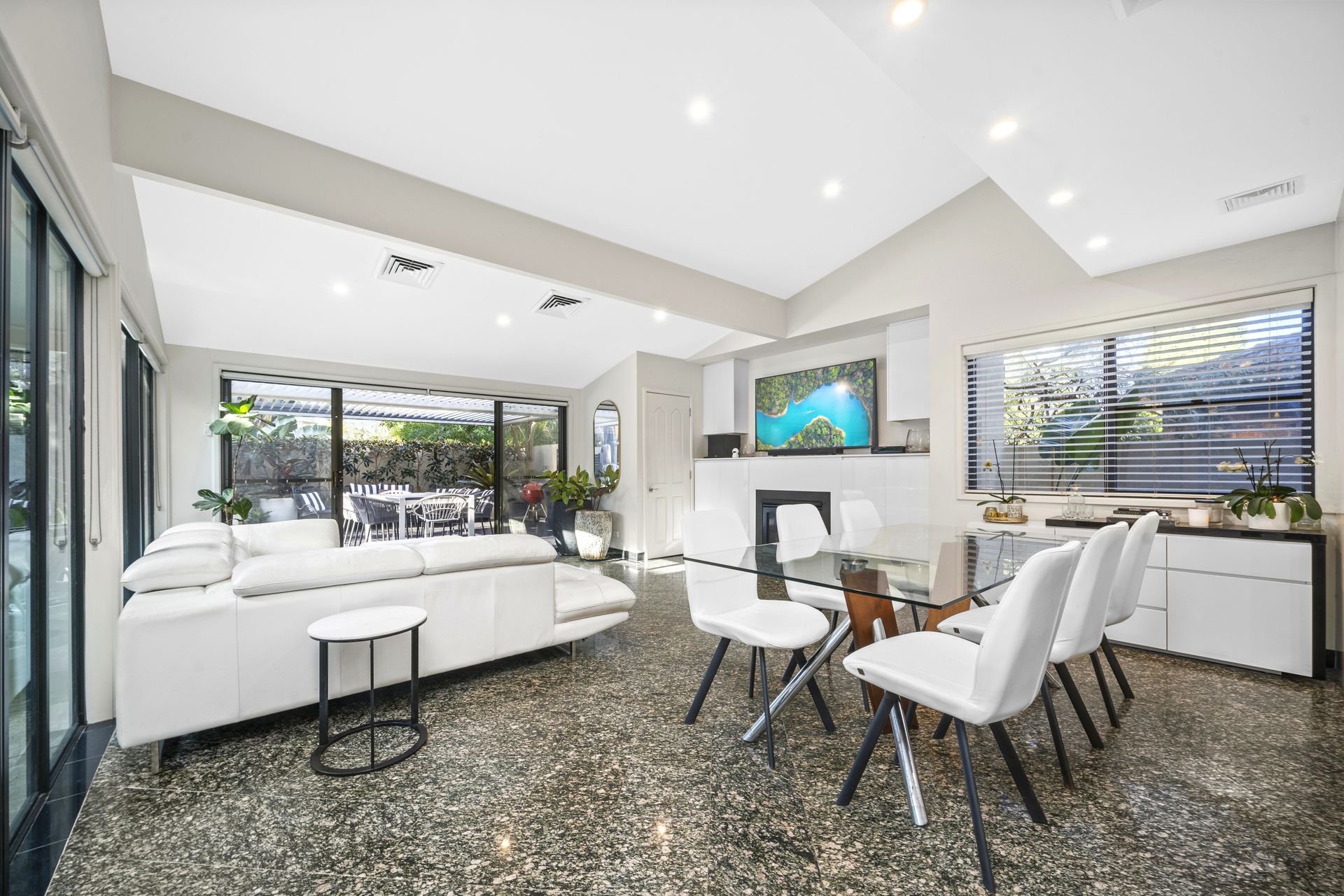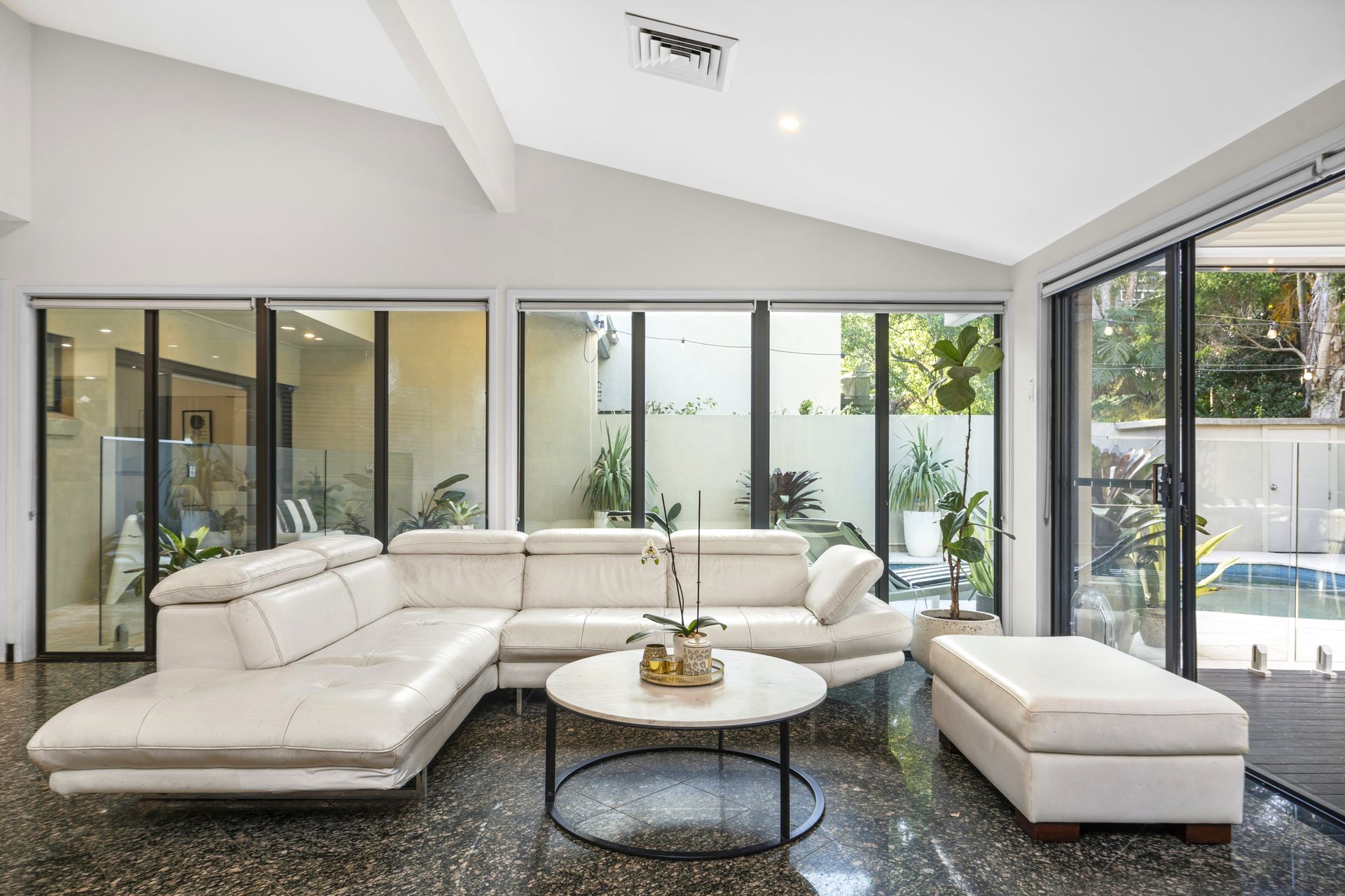 • Perfect north to rear aspect, home is privately walled and secure. • Spacious living and dining rooms, walls of glass open to the pool. • Covered alfresco terrace, solar heated pool, superb granite floors. • Deluxe stone induction kitchen, downdraft exhaust, two ovens, a/c. • Smeg appliances, gas fireplace, walk-in pantry, two way powder. • Ground floor master with ensuite and pool access, home office. • Over-sized bedrooms, robes, immense rumpus/games with bar. • Ample storage areas, triple lock up carport plus lock up garage.